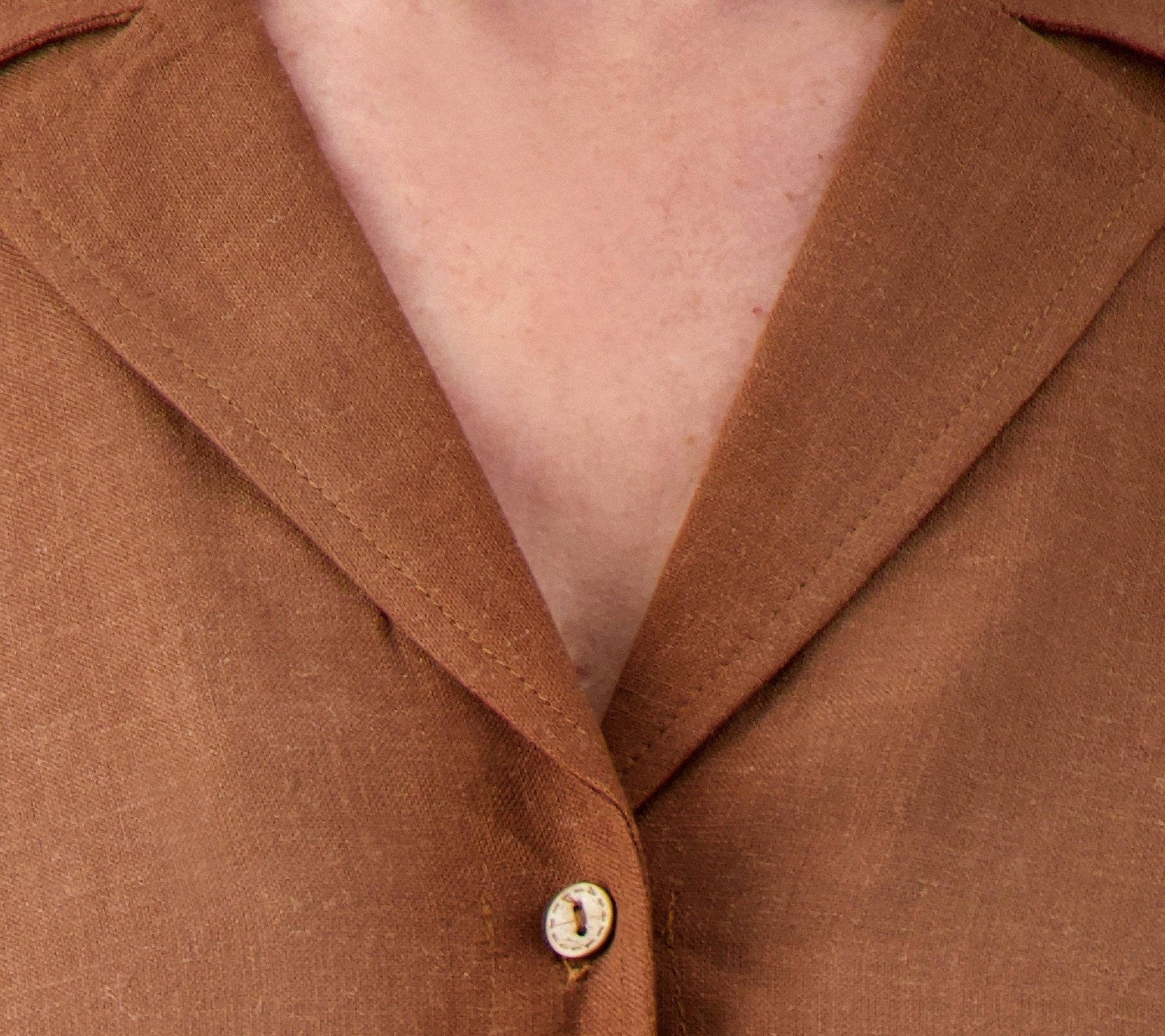 • Features: button-front closure, short sleeves with turned cuffs, notched collar, hi-low curved hemline, on-seam pockets, bust darts