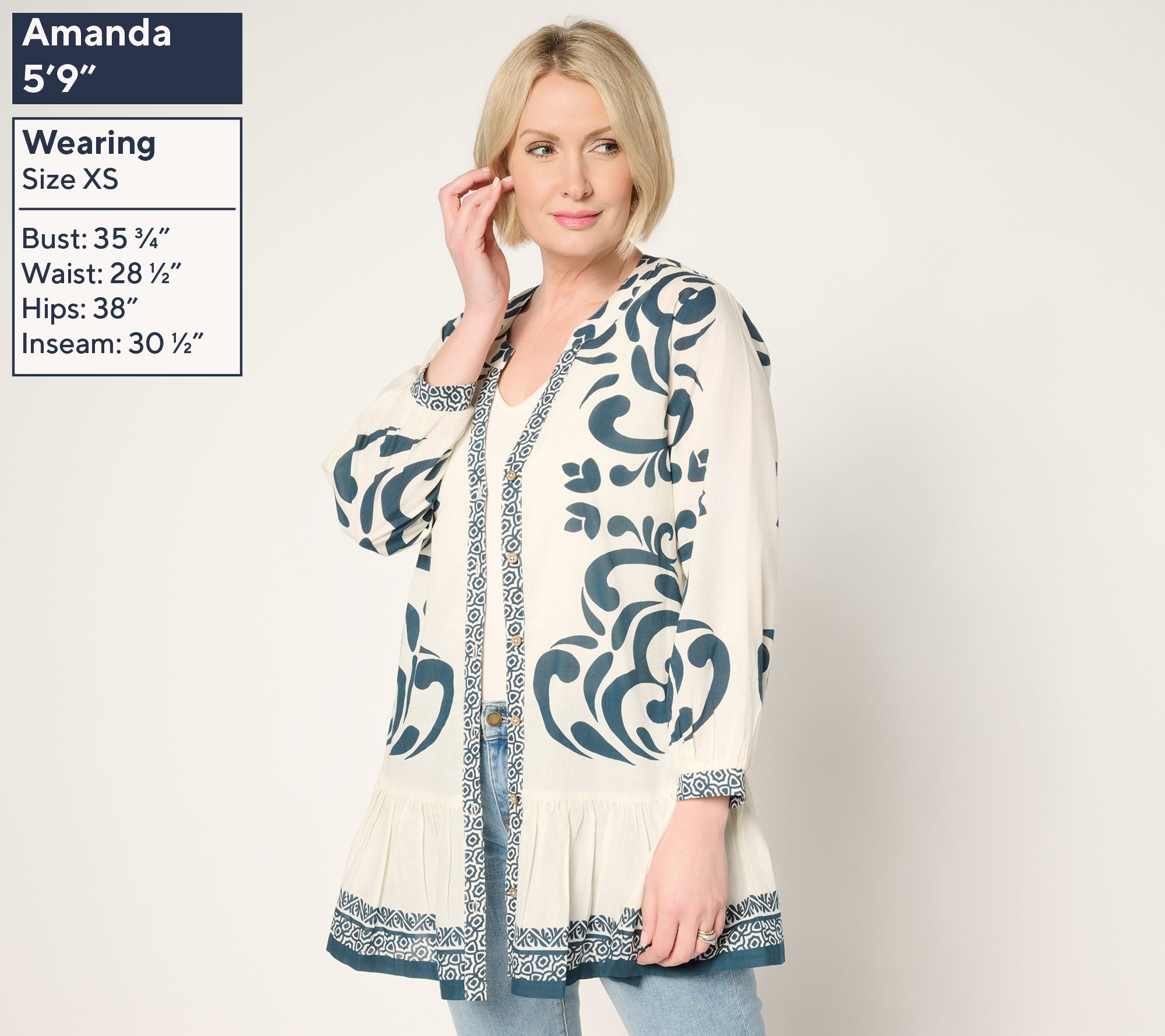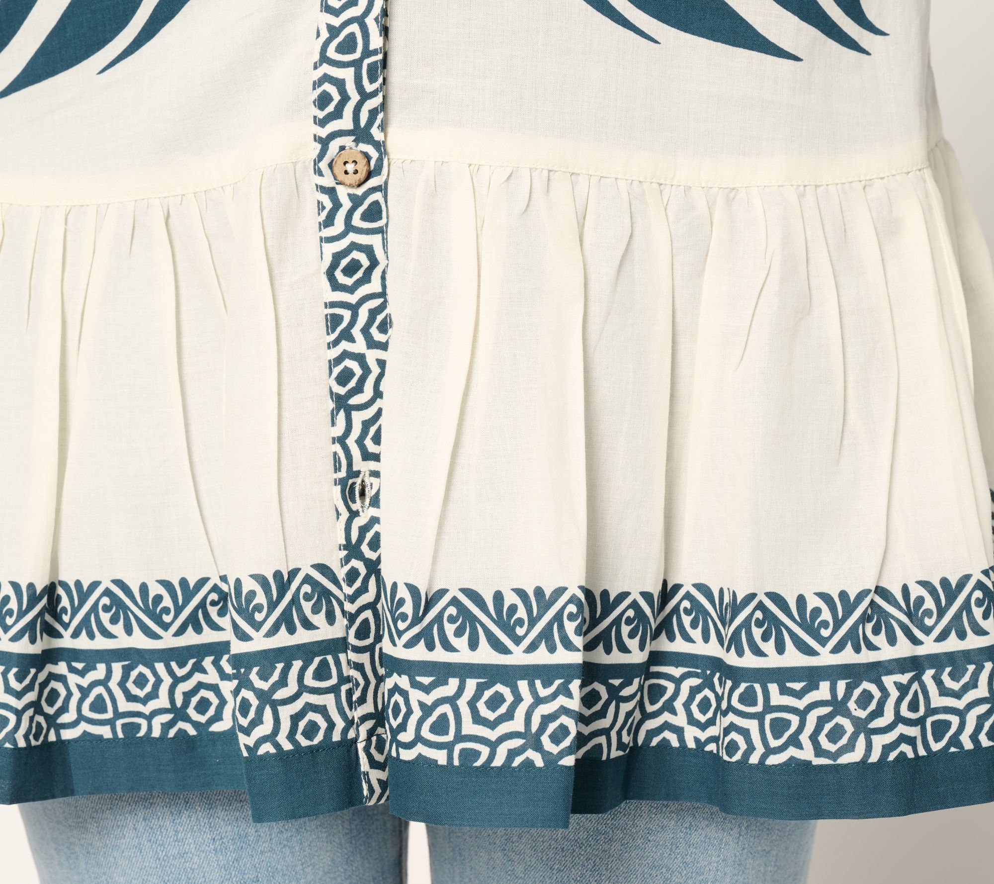 • Features: print, button front, flounced hem, mandarin collar, 3/4-sleeves with 1" self-folded cuff, V-neckline