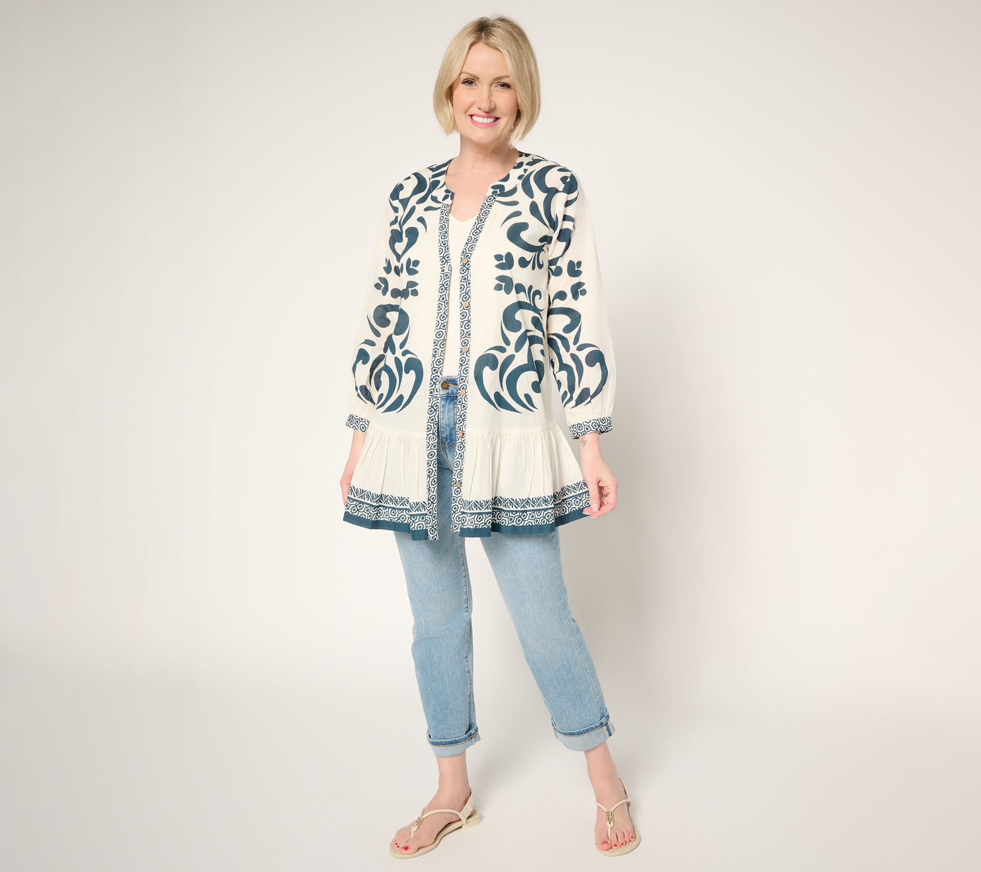 Sunny days call for a layer that feels just as fun as your plans. This lightweight printed cotton duster features a lively allover print, flounced hem, and a button-front design with a breezy mandarin collar -- perfect for brunches, errands, or spontaneous get-togethers. Pair it over a tank and jeans or cinch with a belt for your own twist. From Susan Graver.
