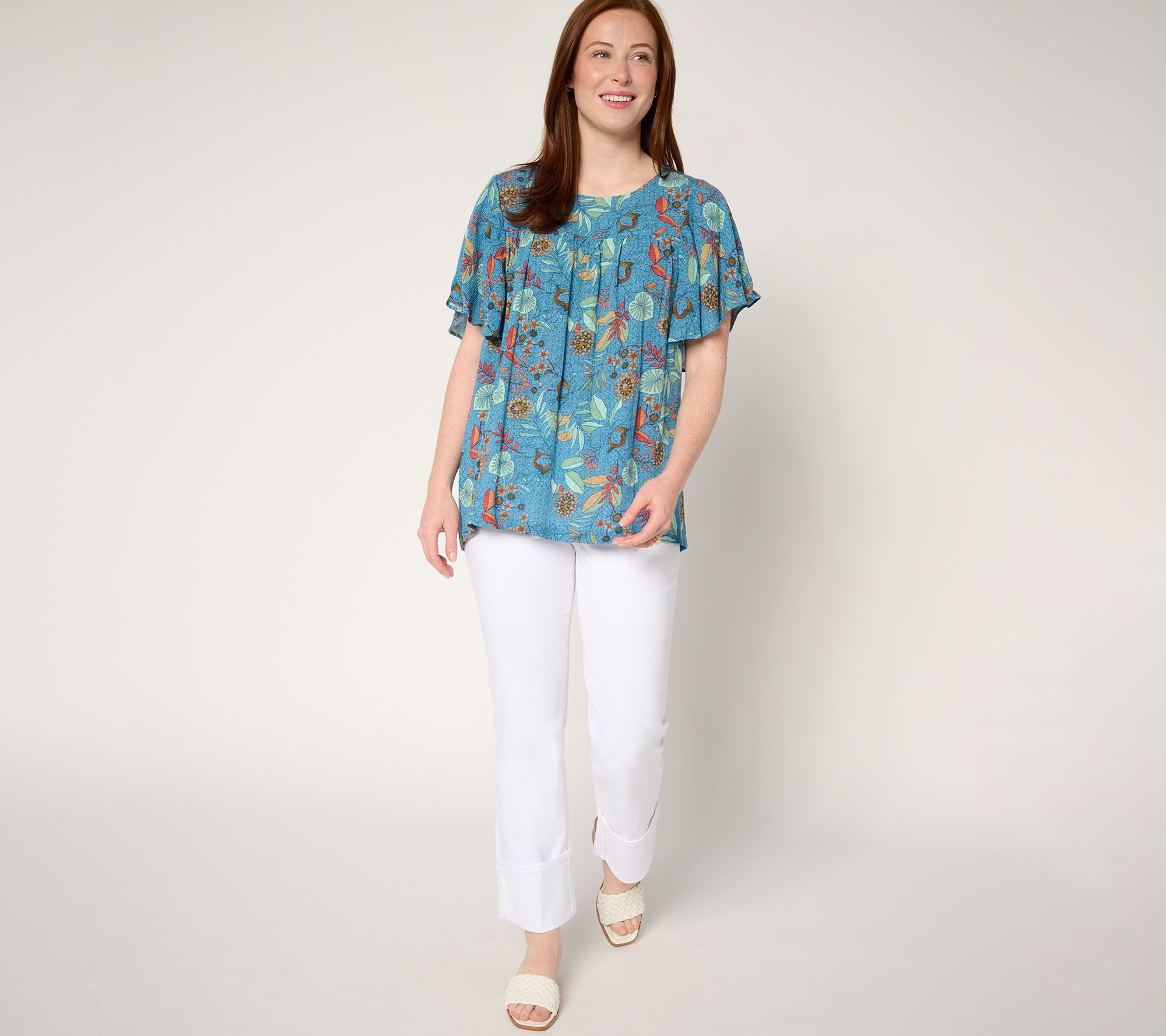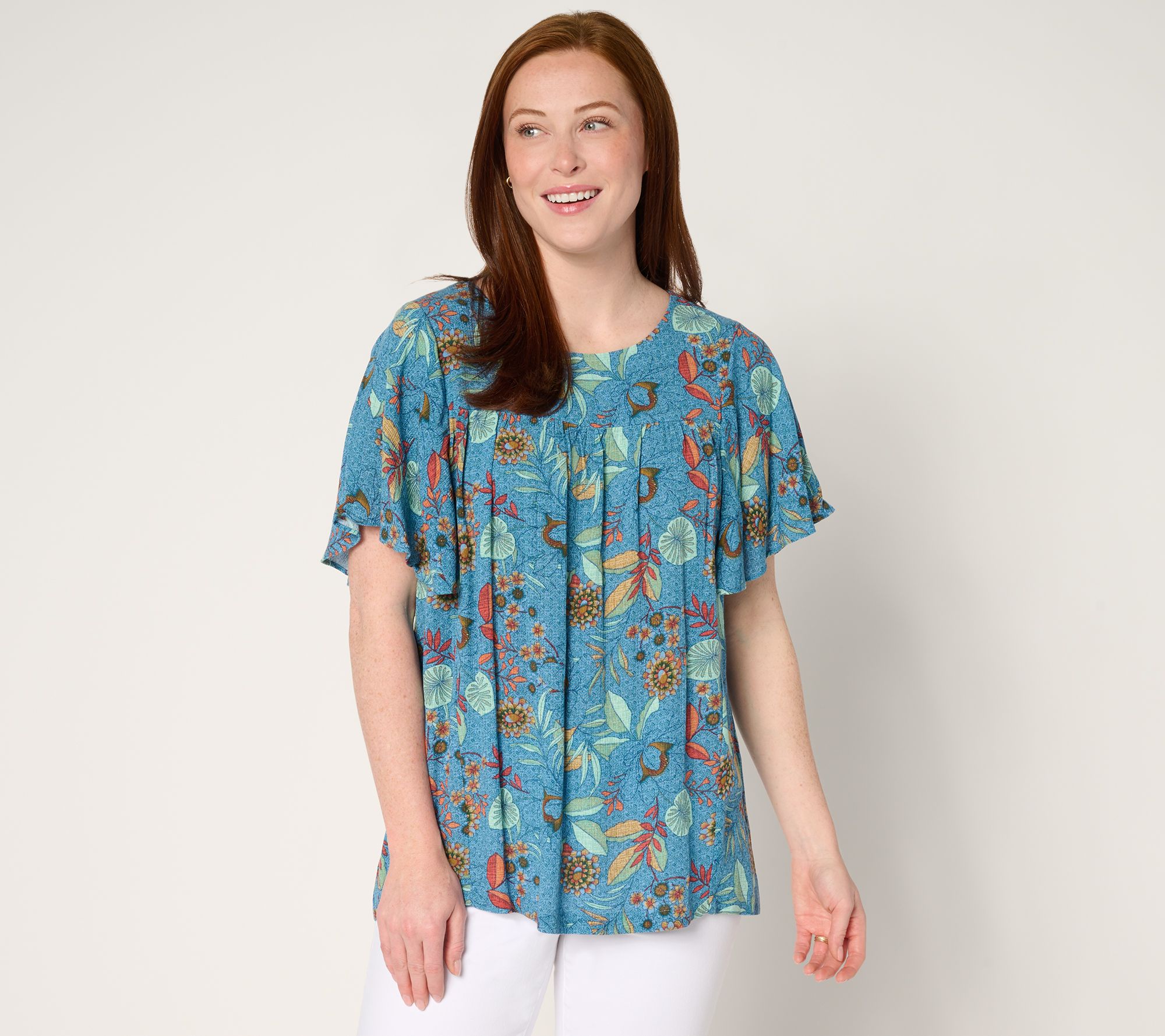 Playful prints meet effortless elegance in this Susan Graver PURE woven flutter sleeve top. The slight gathers and jewel neckline add charming details to this versatile piece, perfect for transitioning from a casual daytime ensemble to an evening out. From Susan Graver.