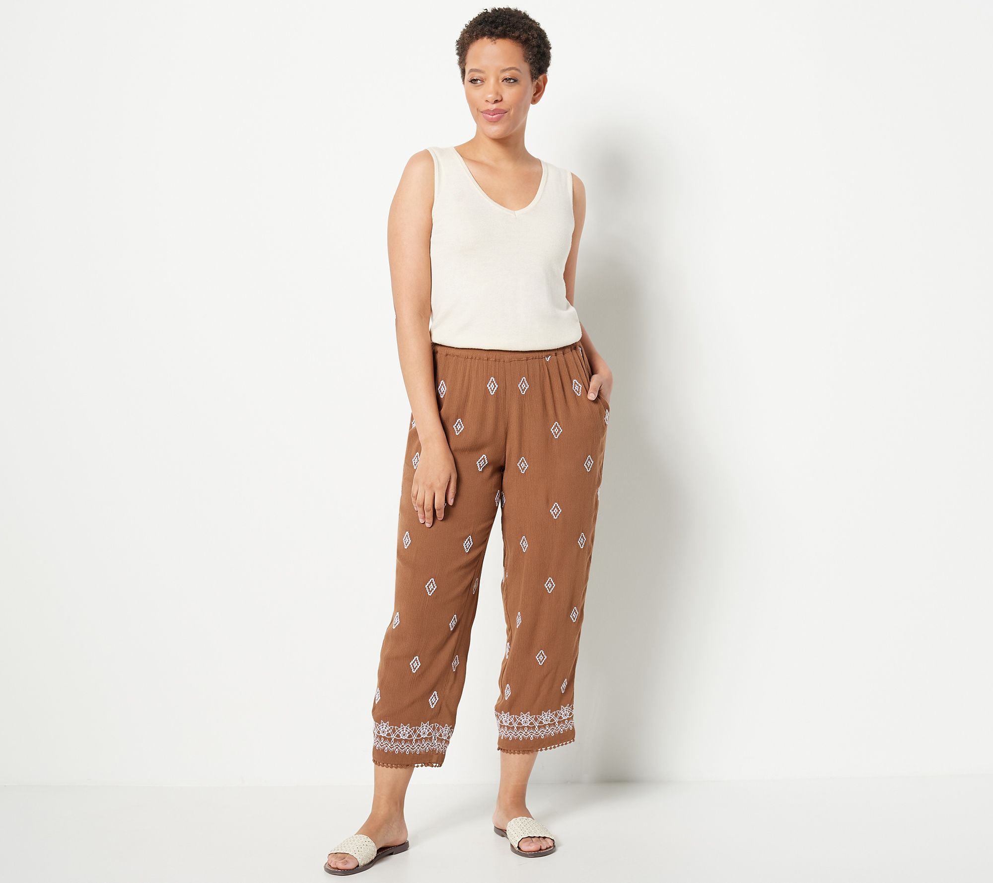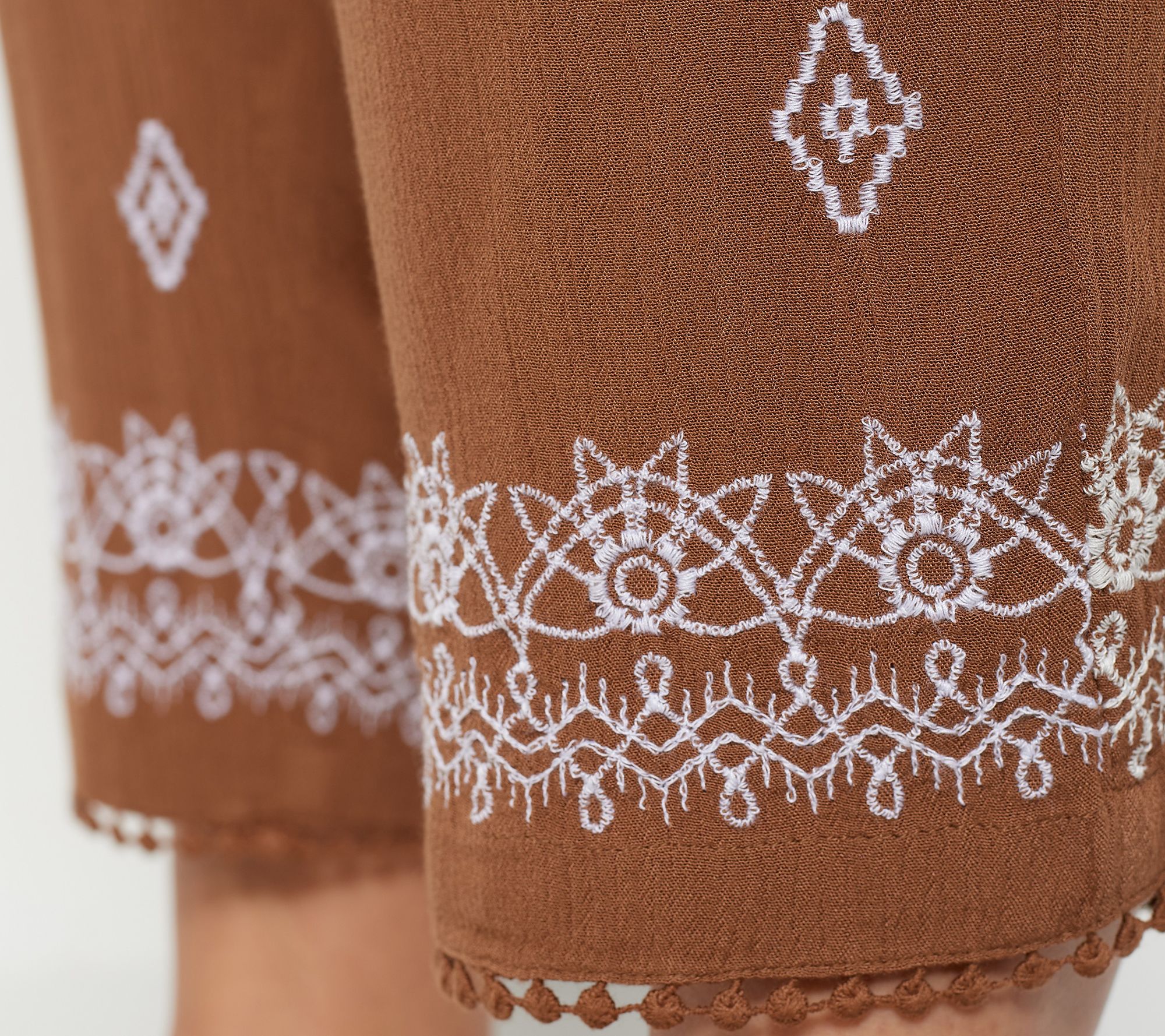 • Features: crop style, allover print, crinkled, pull-on style, embroidered trim at leg openings, side-seam pockets