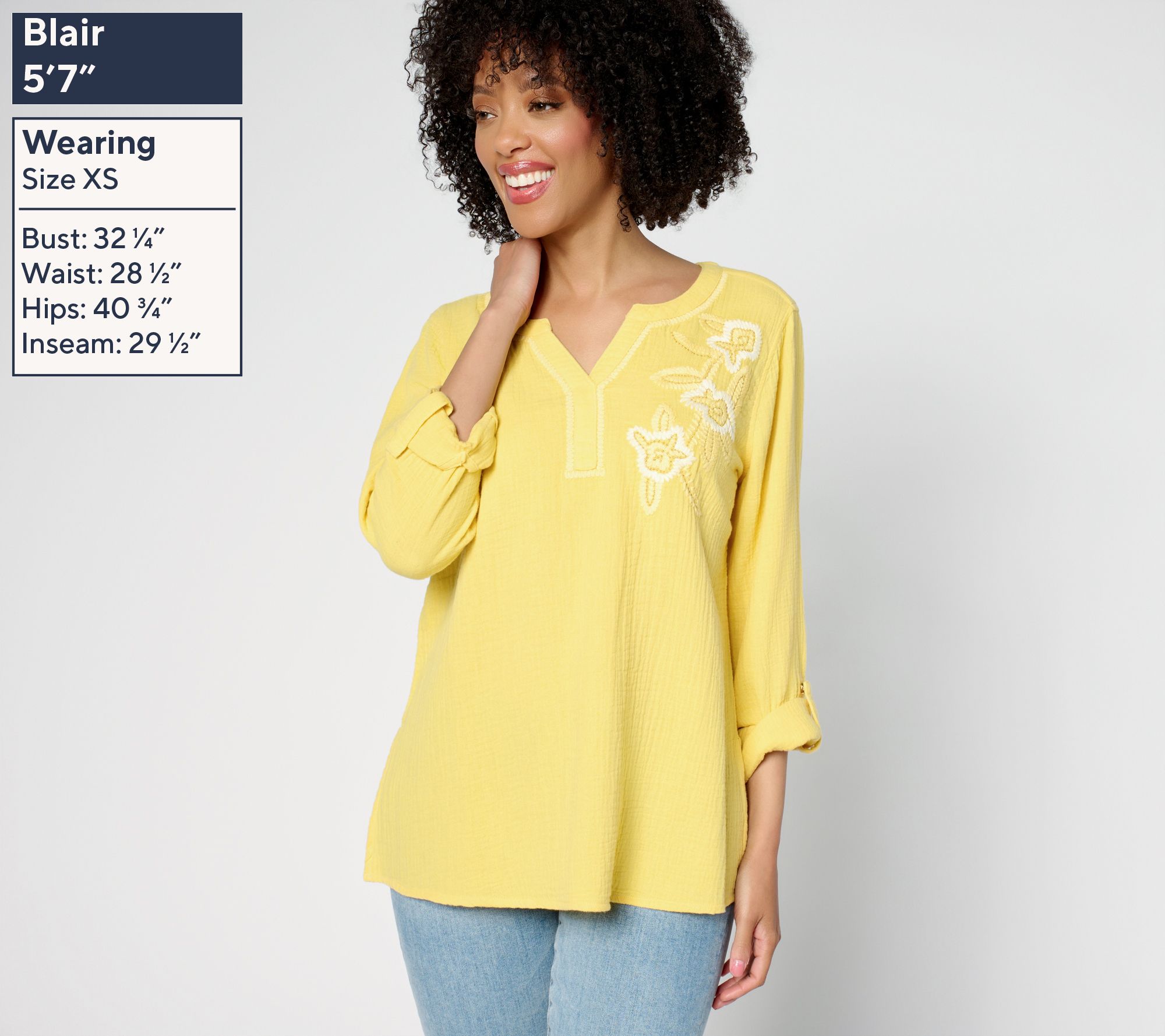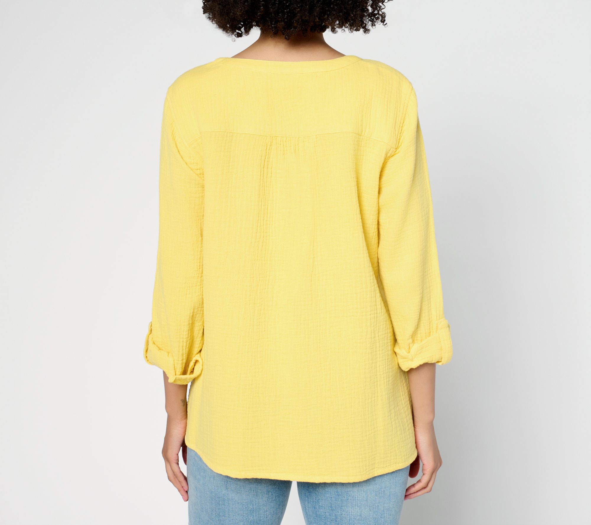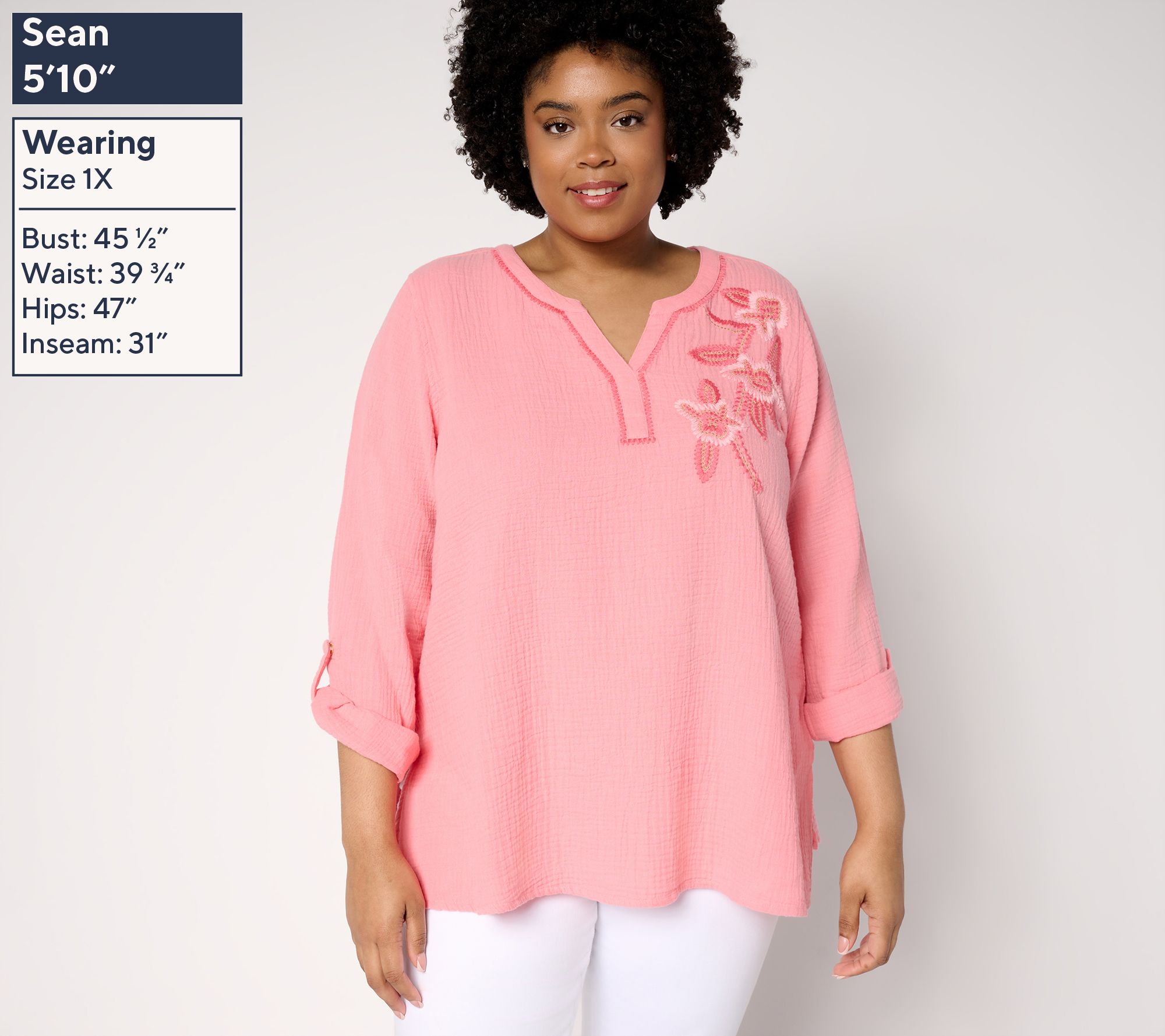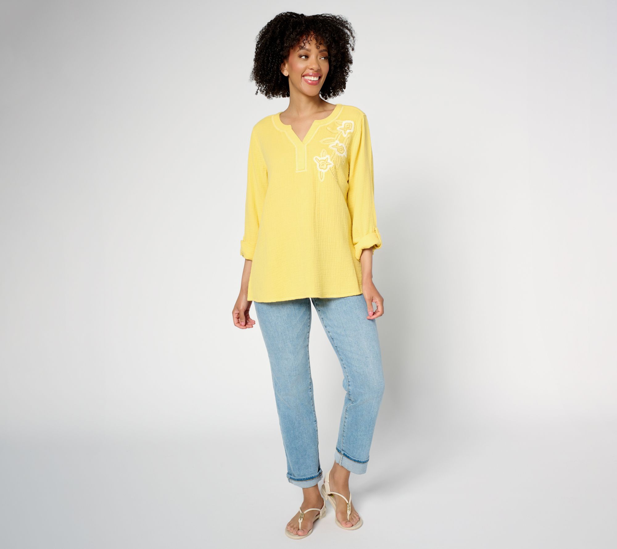 A weekend retreat, a beach break, or an escape to the countryside -- whatever your dreamy getaway plans, this delightful cotton gauze tunic from Susan Graver's PURE collection is ready to go! Charm-drenched embroidery on the front lets the elevated design shine for both daytime and dinner plans. How's that for saving space in your suitcase? Adjust the roll-tab sleeves to suit the temps, the venue, or your vibe. From Susan Graver.