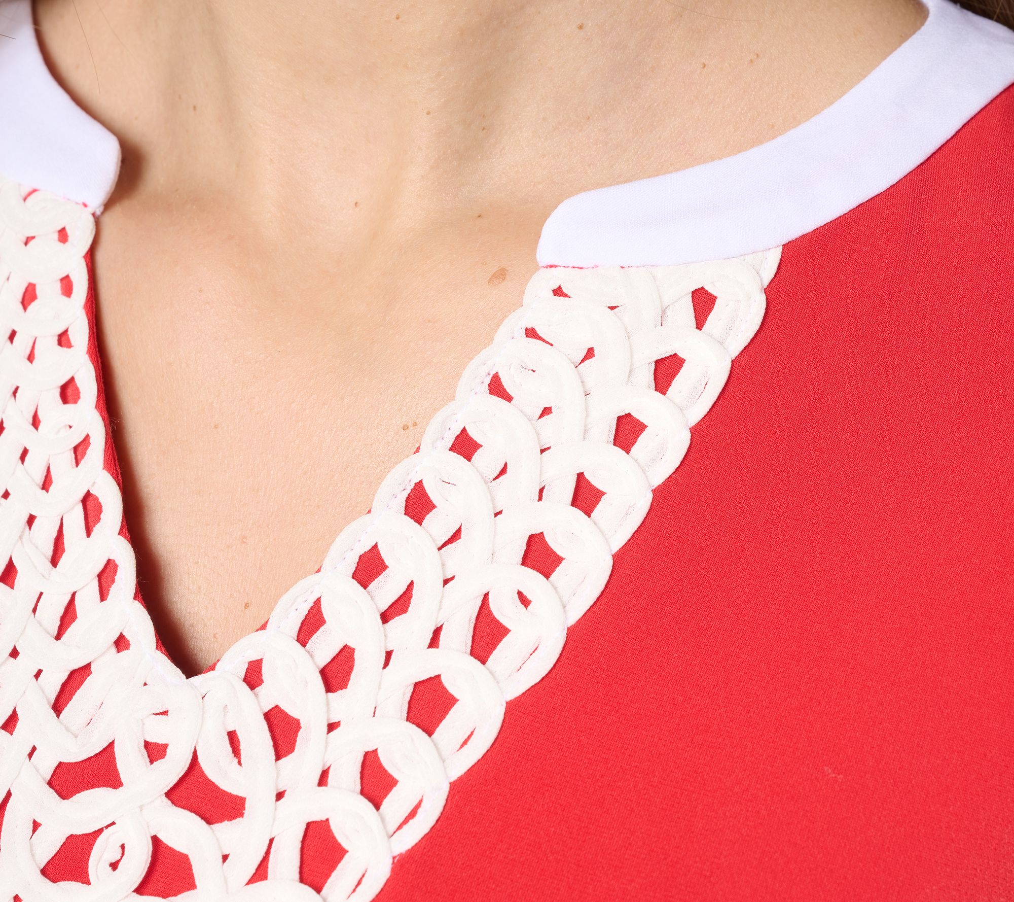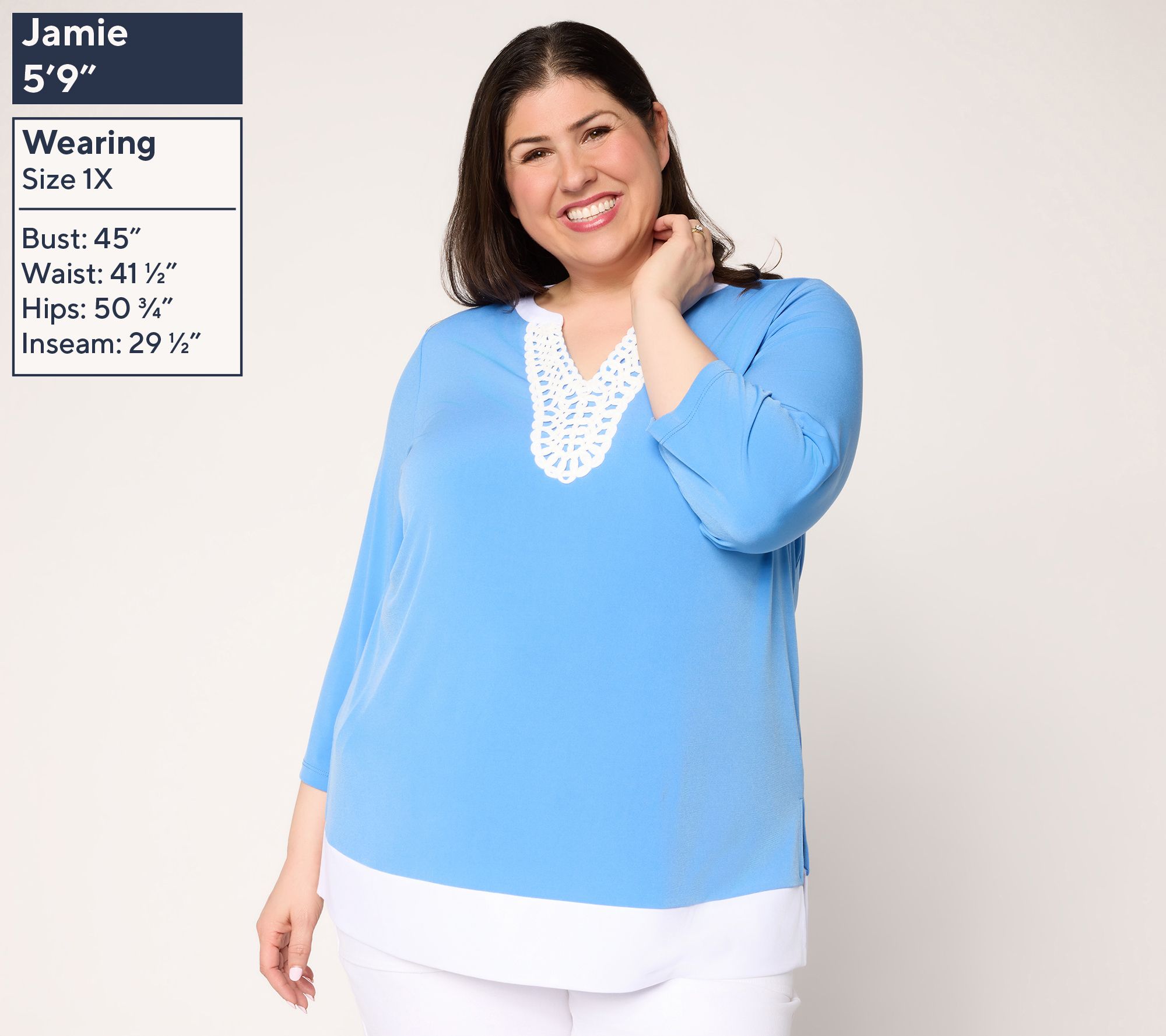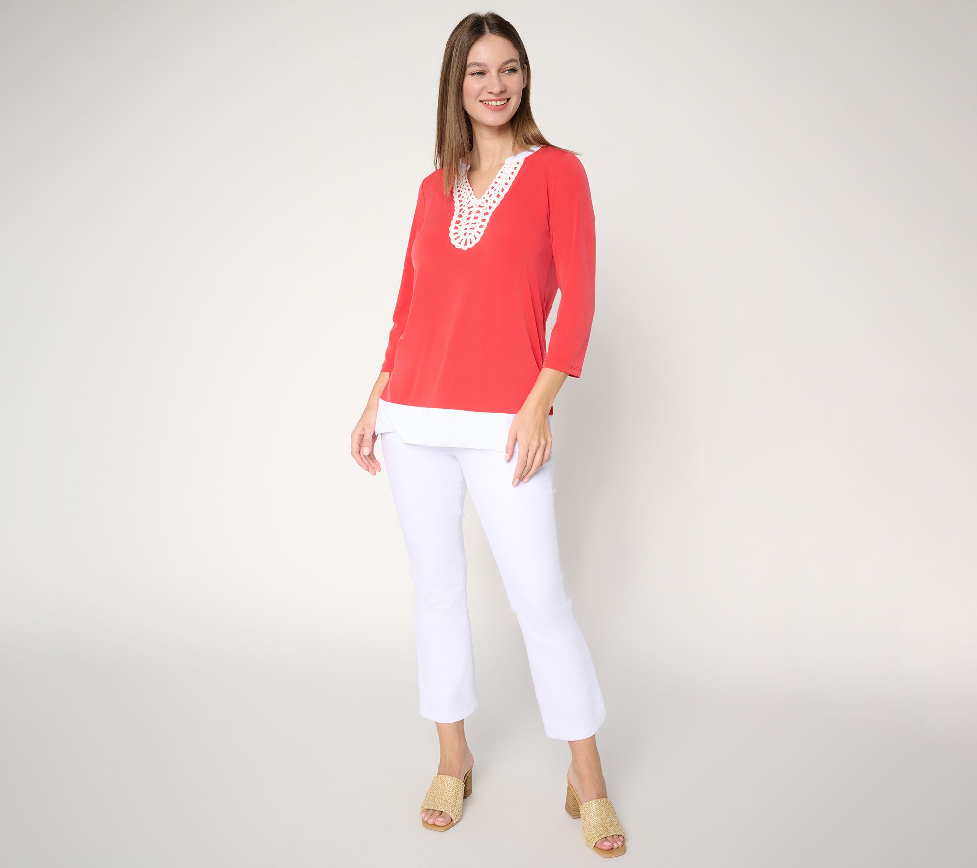 Dress up your weekday or weekend style with this Liquid Knit® tunic, accented by a crochet-trimmed split neckline for a polished finish. Soft stretch knit and 3/4-length sleeves create effortless comfort and movement, while side slits and a straight hem offer versatility for casual lunches or evenings out. From Susan Graver.