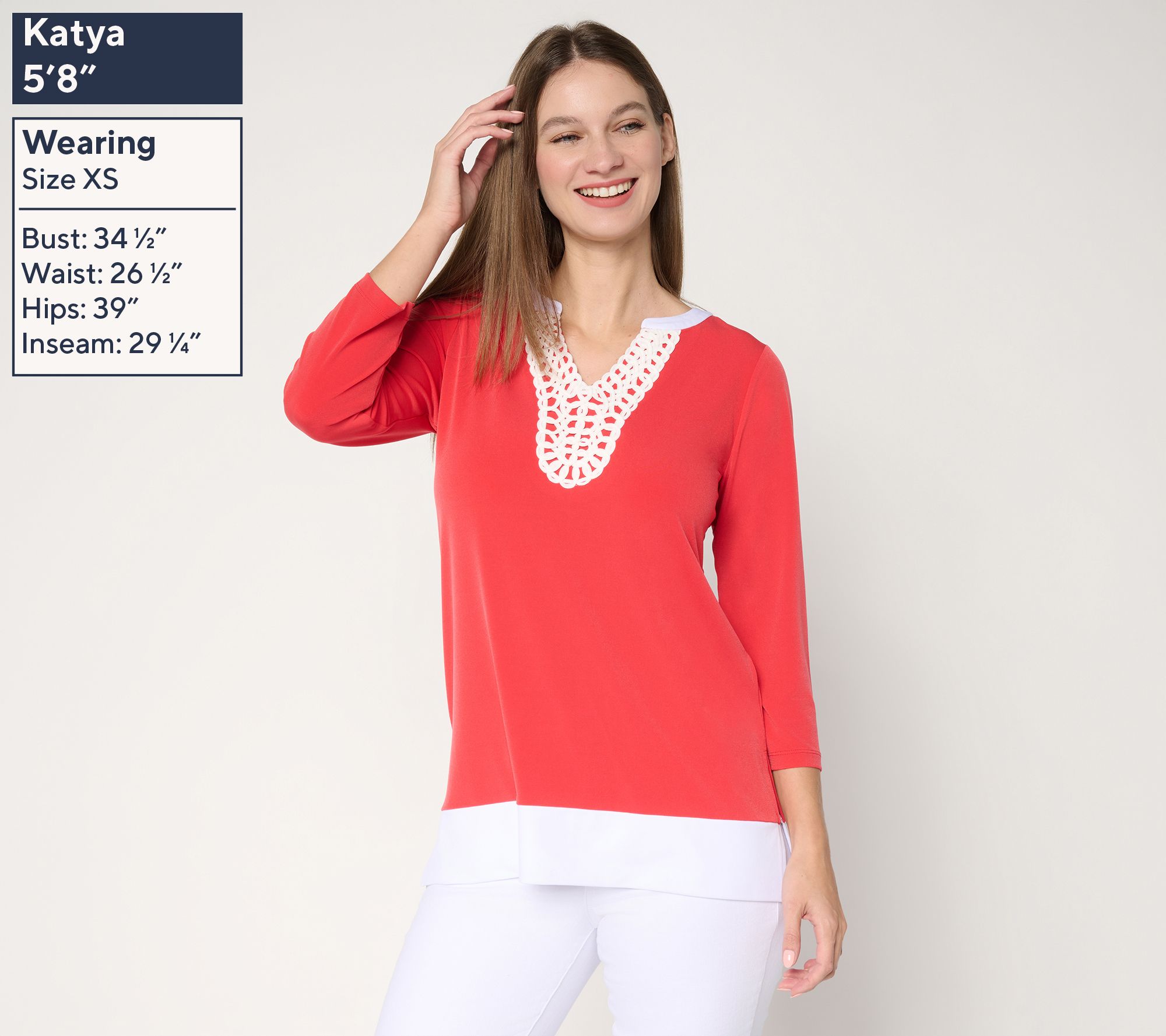 • Features: solid tunic, crochet trim at neckline, pullover style, neckband with split neckline opening, combo neckband and bottom border band, side slits, 3/4-length sleeves, straight bottom edge