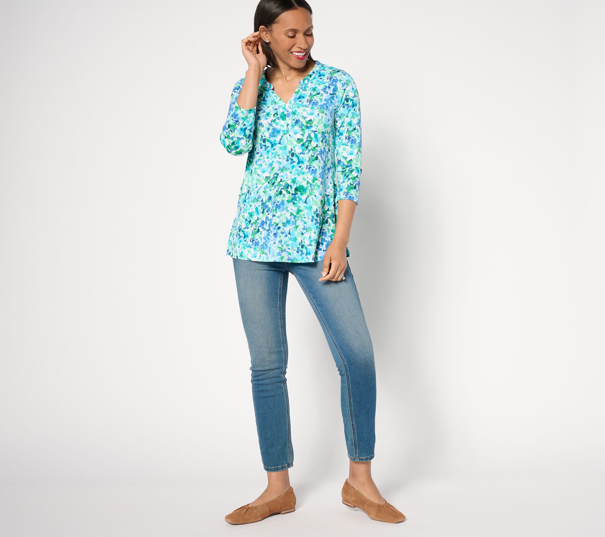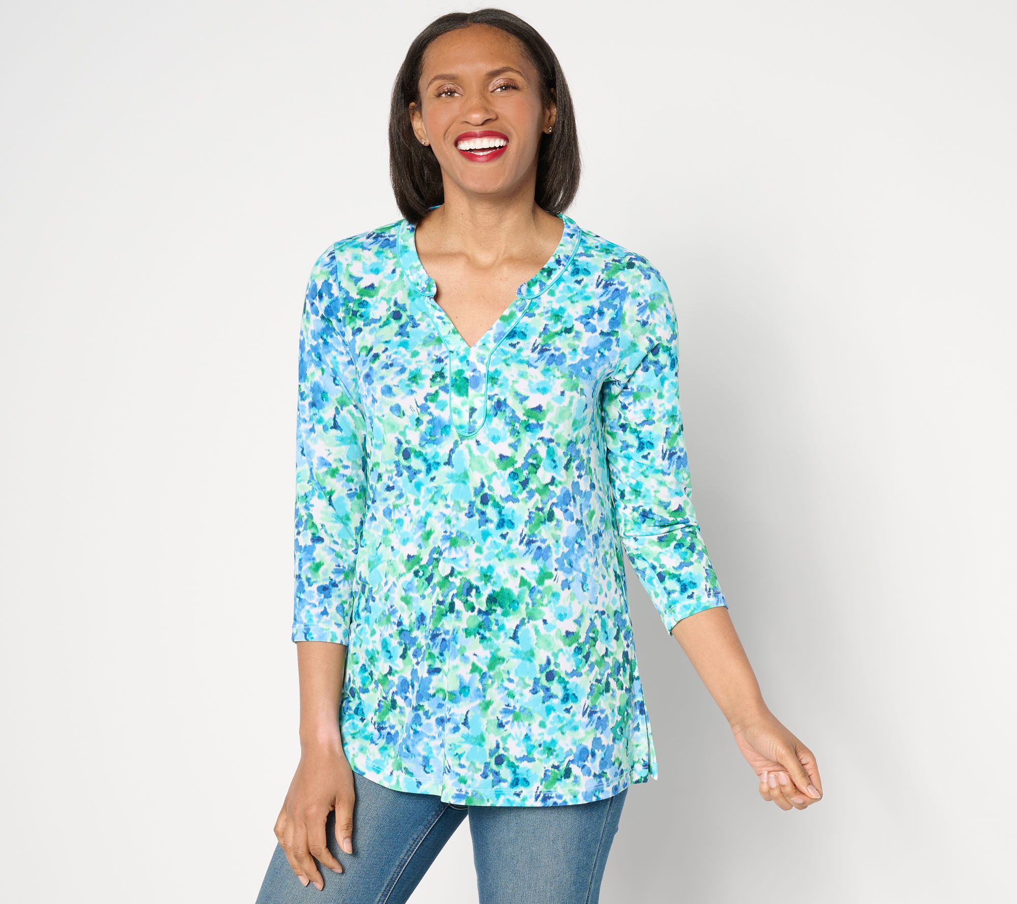 • Features: 3/4-length sleeves, split neck, A-line tunic, side slits at bottom hem