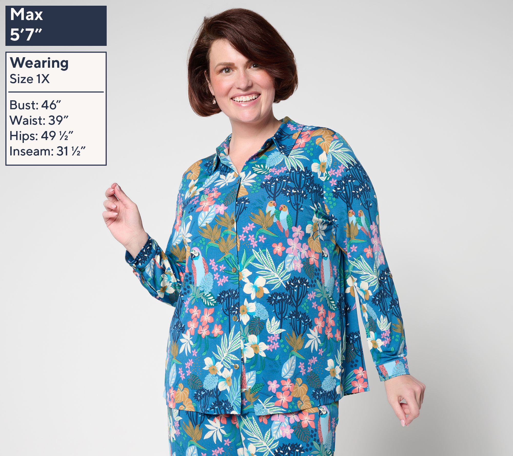 Looking to bring a little polish to your closet? Reach for this Liquid Knit® top with a vibrant print and a button-front design that works for office days or dinner out. The roll-tab sleeves let you switch up your look, while the box pleat detail keeps things feeling easy and wearable. From Susan Graver.