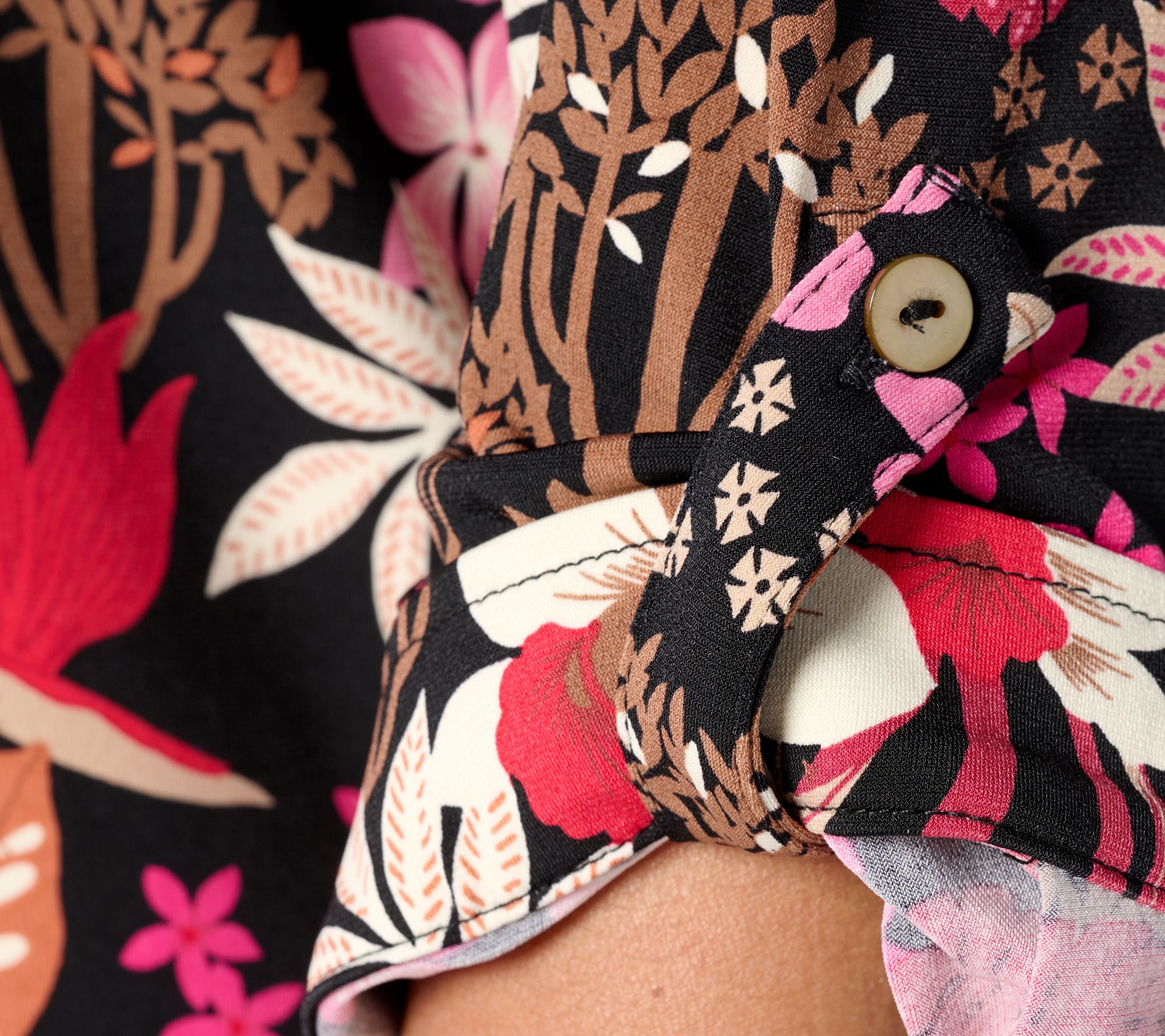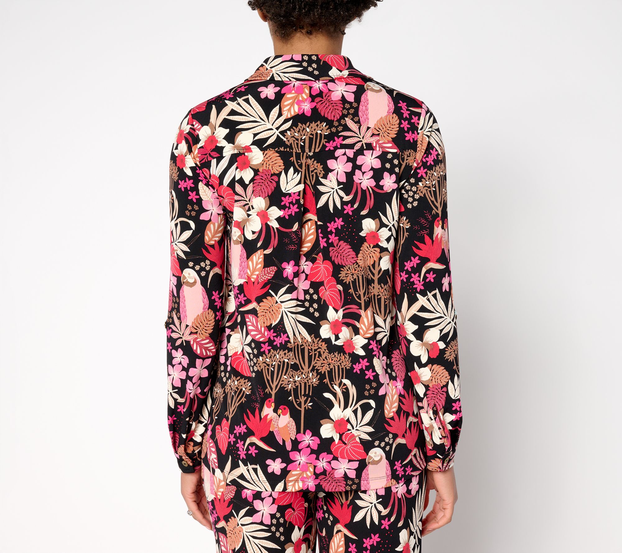 • Features: print, collar, center front placket with button-front closure, box pleat at back yoke, button cuffs at sleeves, button tab on sleeve for rolled-up styling, straight bottom hem