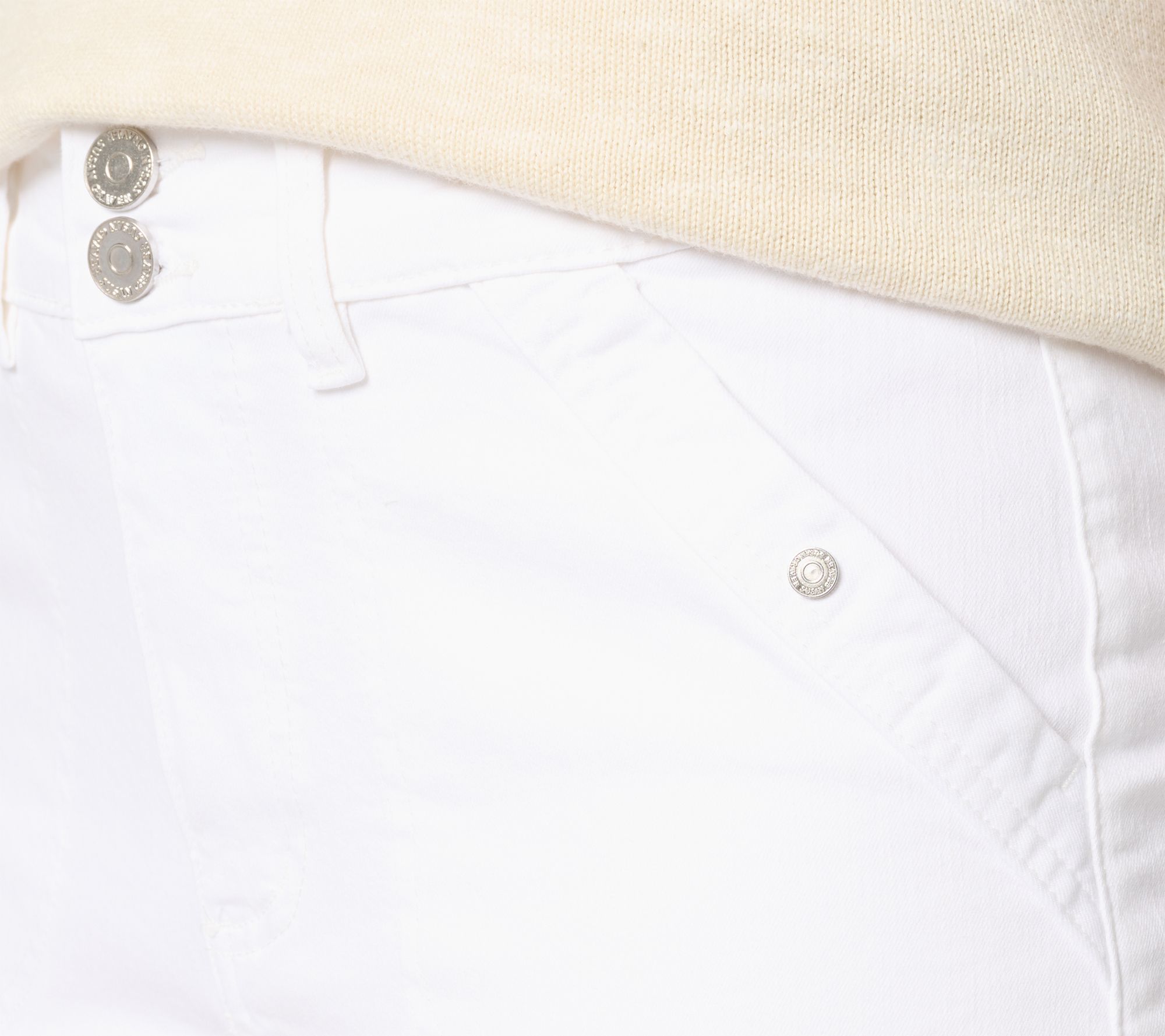• Hardware: zip fly and two-button closure at waistband