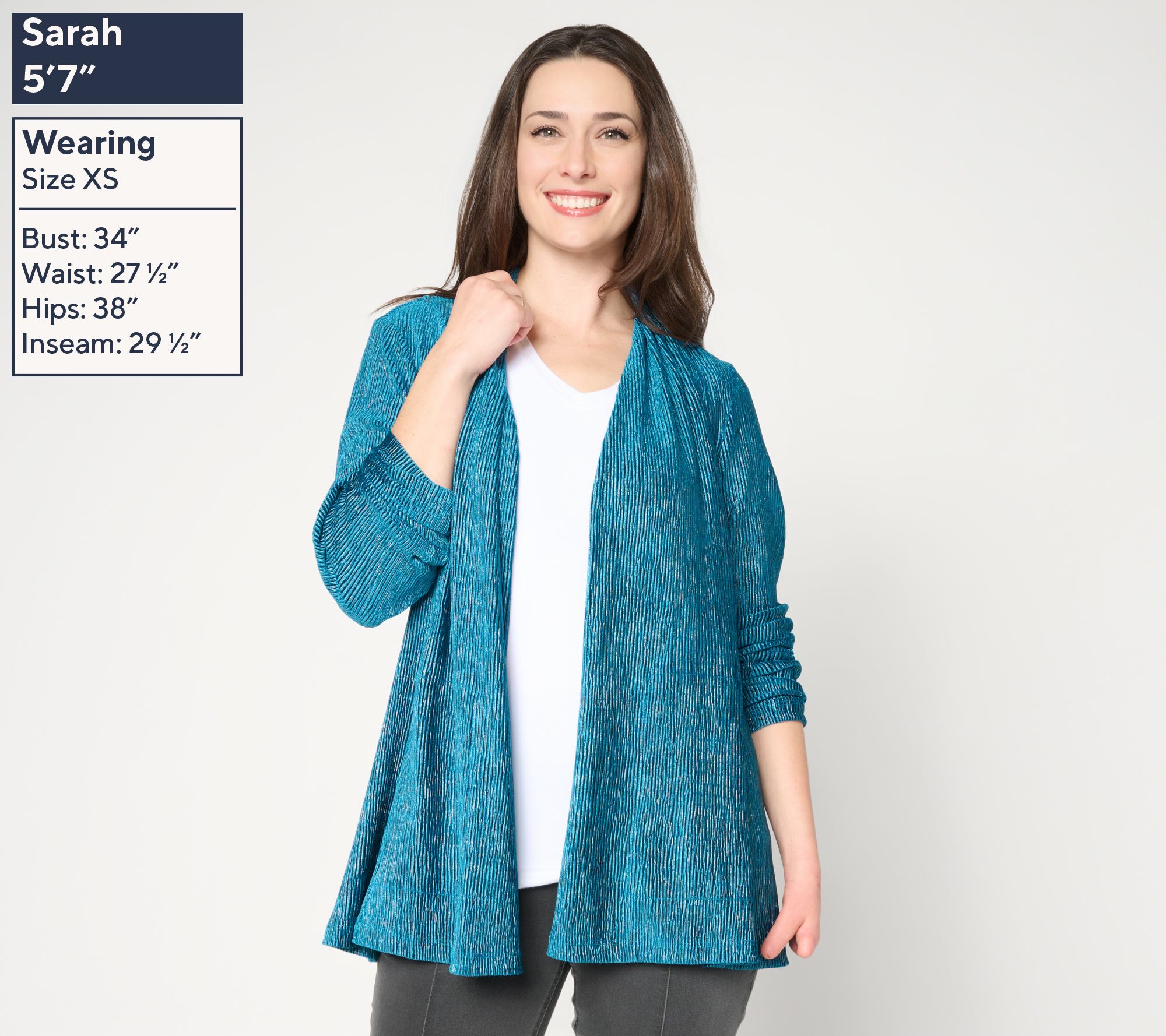 Catch the light -- at every angle -- with this foiled textured knit cardigan. A glimmering finish makes this layering piece a go-to for evenings out, or add some subtle sparkle to your everyday 'fits. Perfectly placed princess seams and a ruched collar create a flattering silhouette, while the fuller sweep means extra comfort for layering over your favorite tops. From Susan Graver.