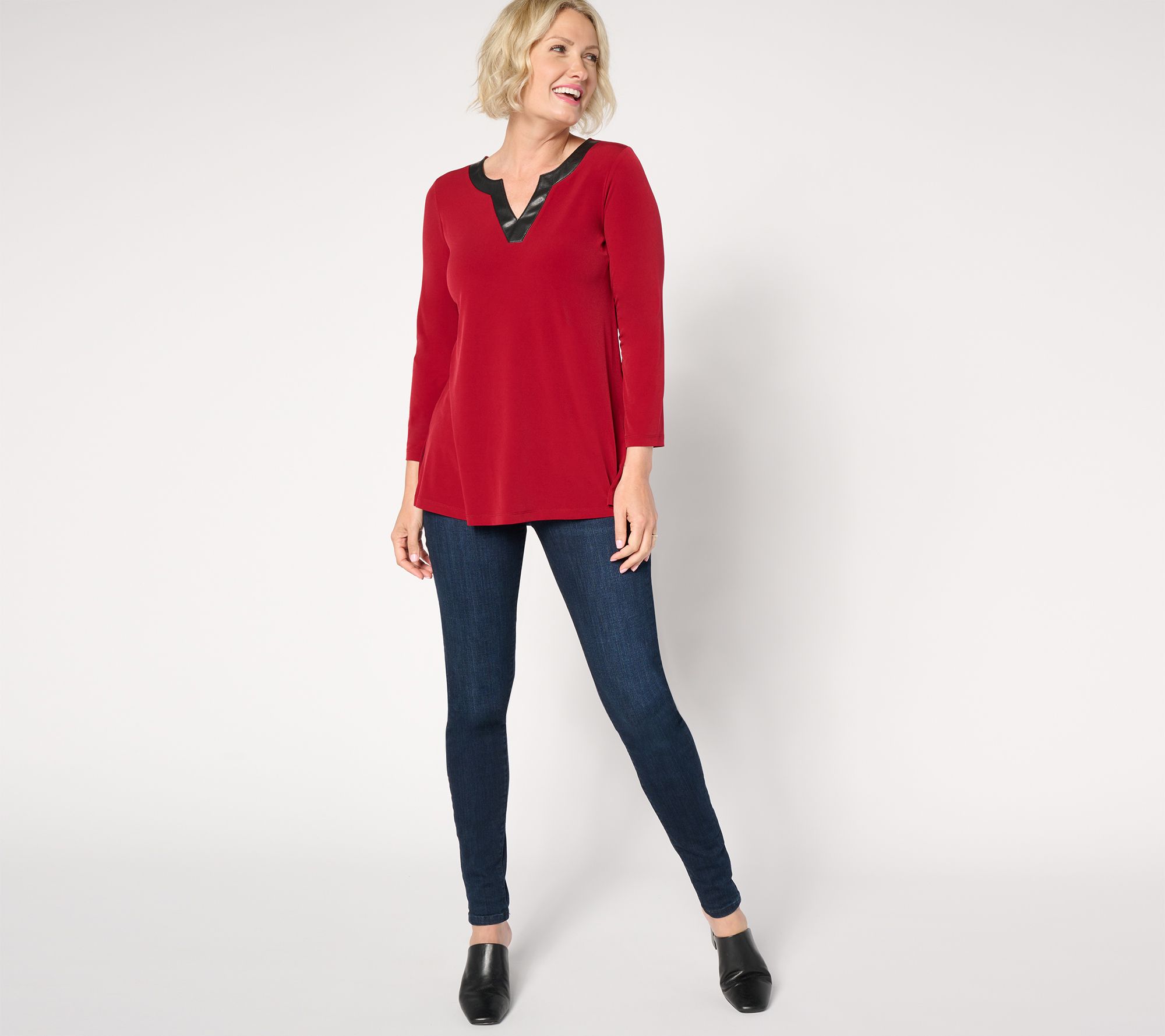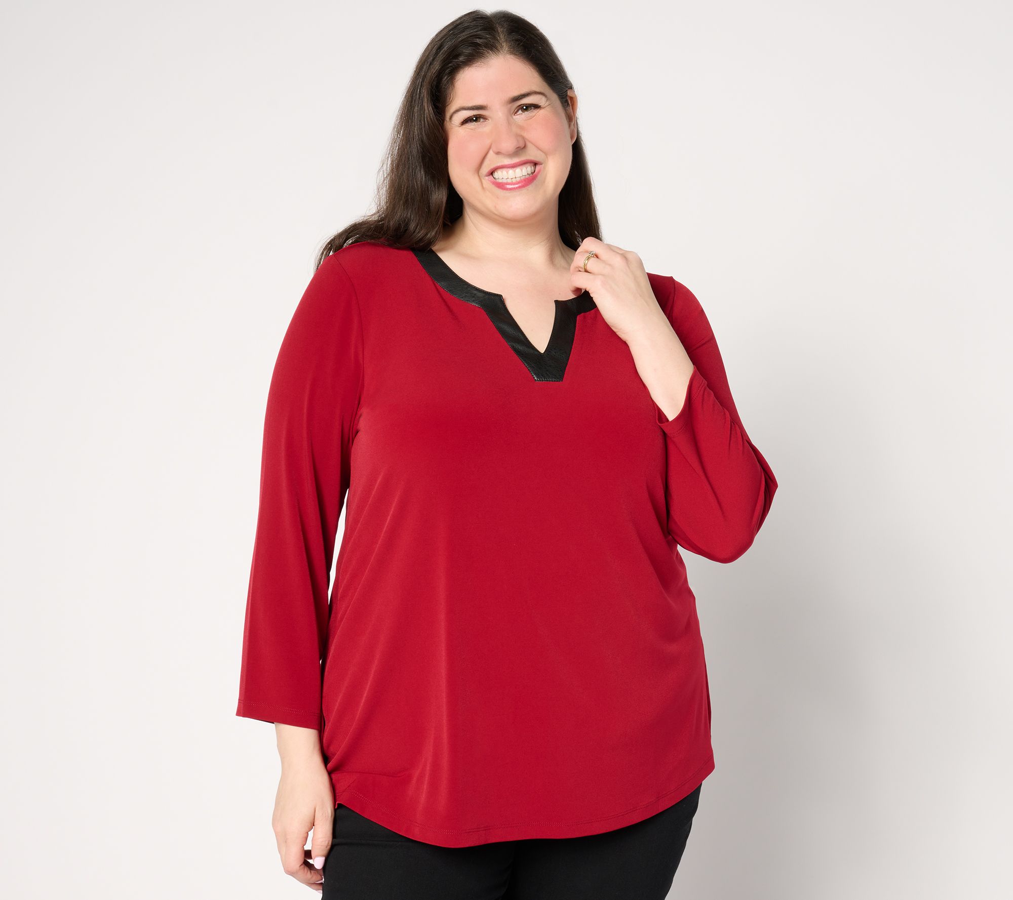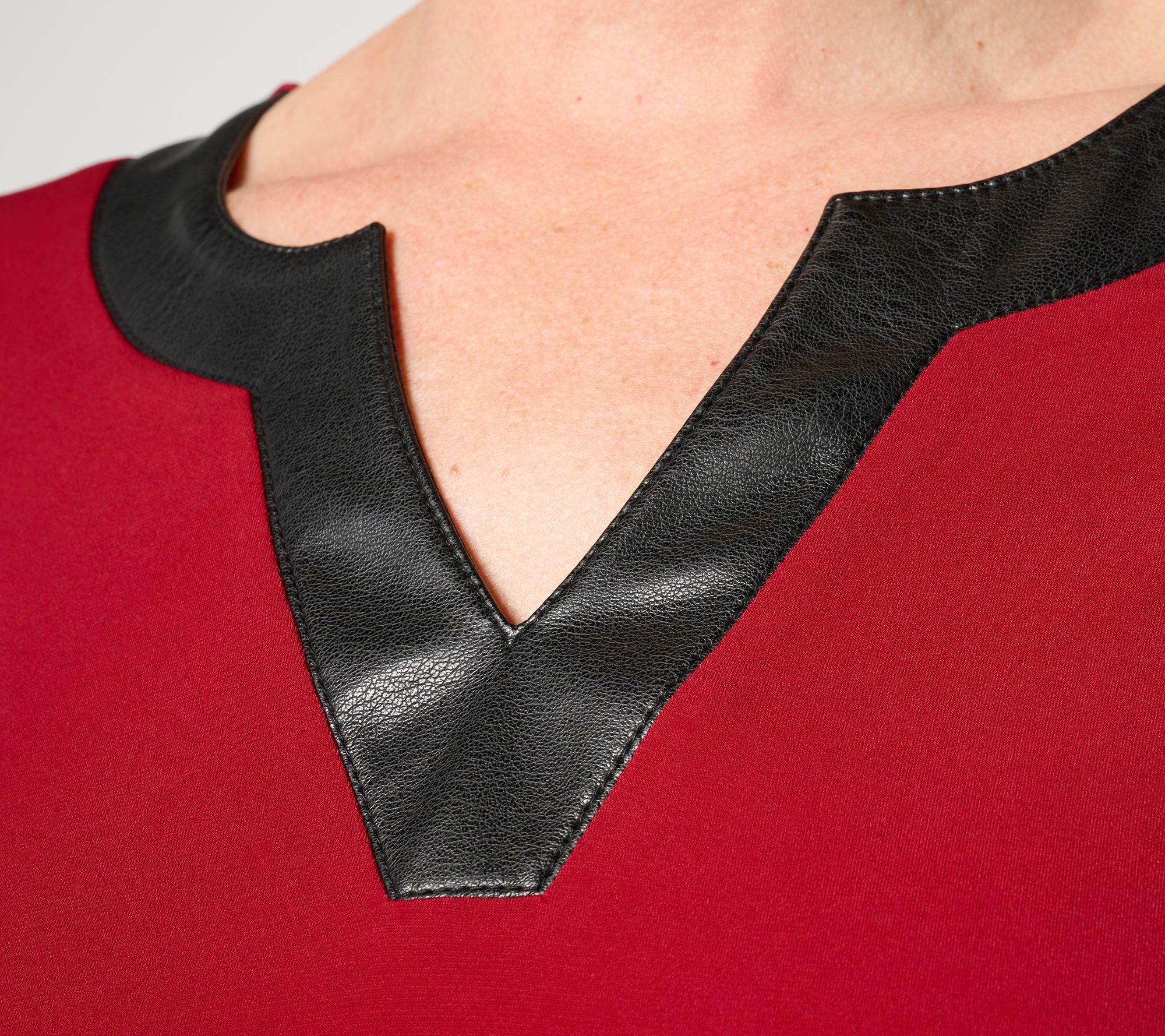 When it comes to this A-line tunic, it's all in the details. The faux leather trim around the neckline adds a luxe touch that makes this style undeniable chic. From Susan Graver.