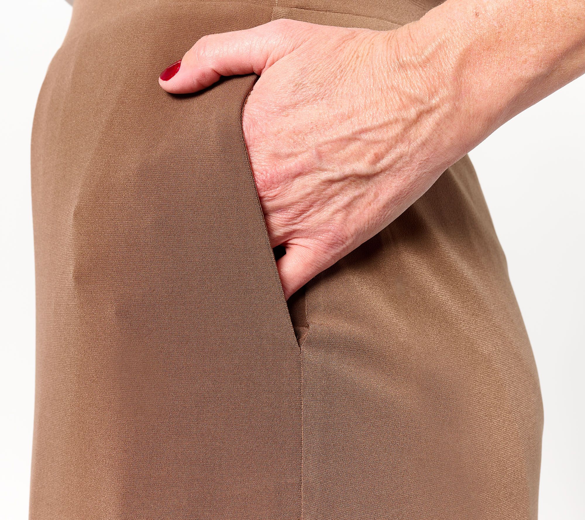 • Features: pull-on style, elastic waistband, side-seam pockets, forward side seams with overlapping back and curved hem shape