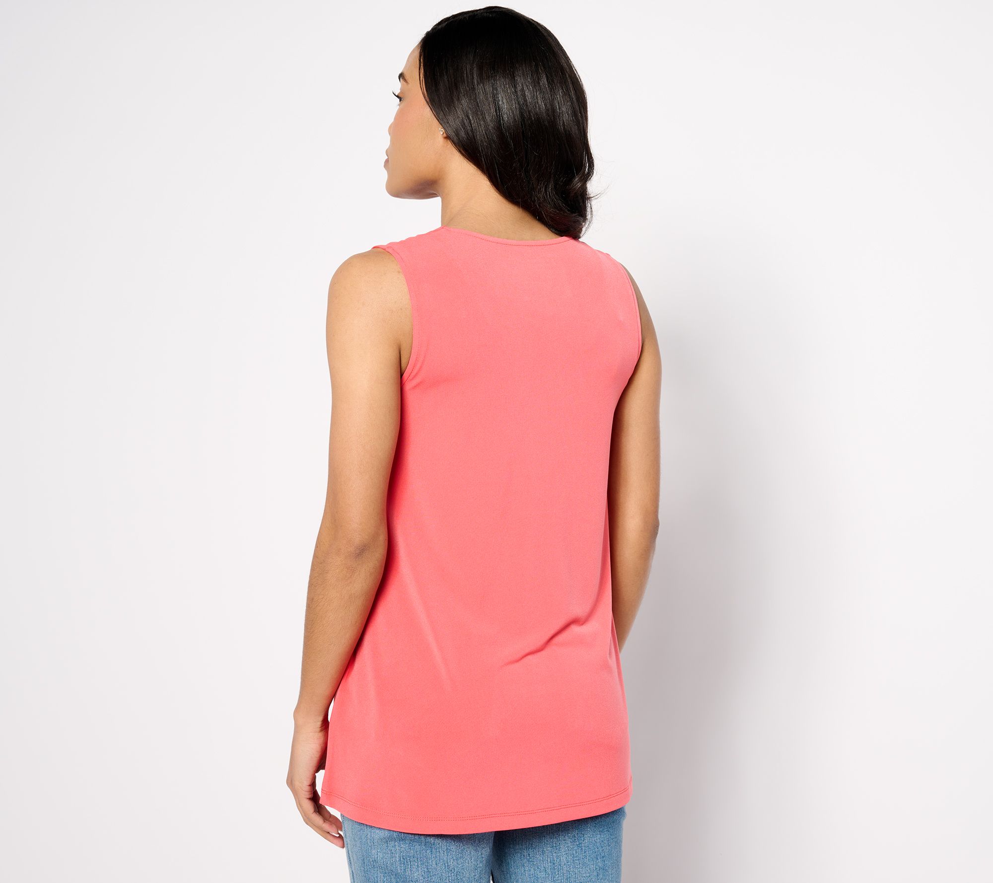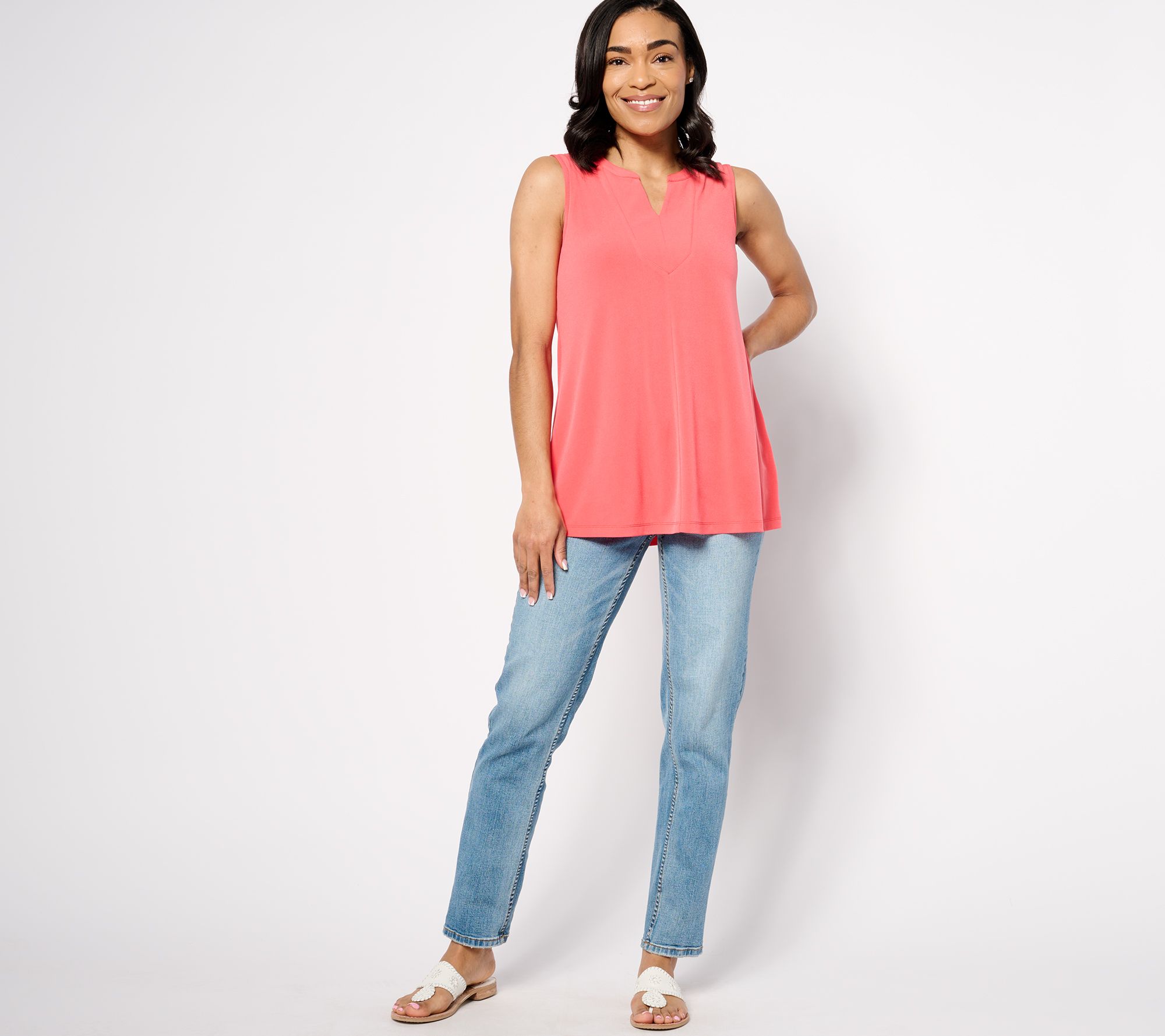 Essential? Indeed! This fluid Liquid Knit® tunic is your grab-and-go modern must-have for summer solo wearing or sweater-weather cardigan pairing. The split V-neck adds face-framing freshness while the flowy A-line bottom hem won't stick to your silhouette. From Susan Graver.