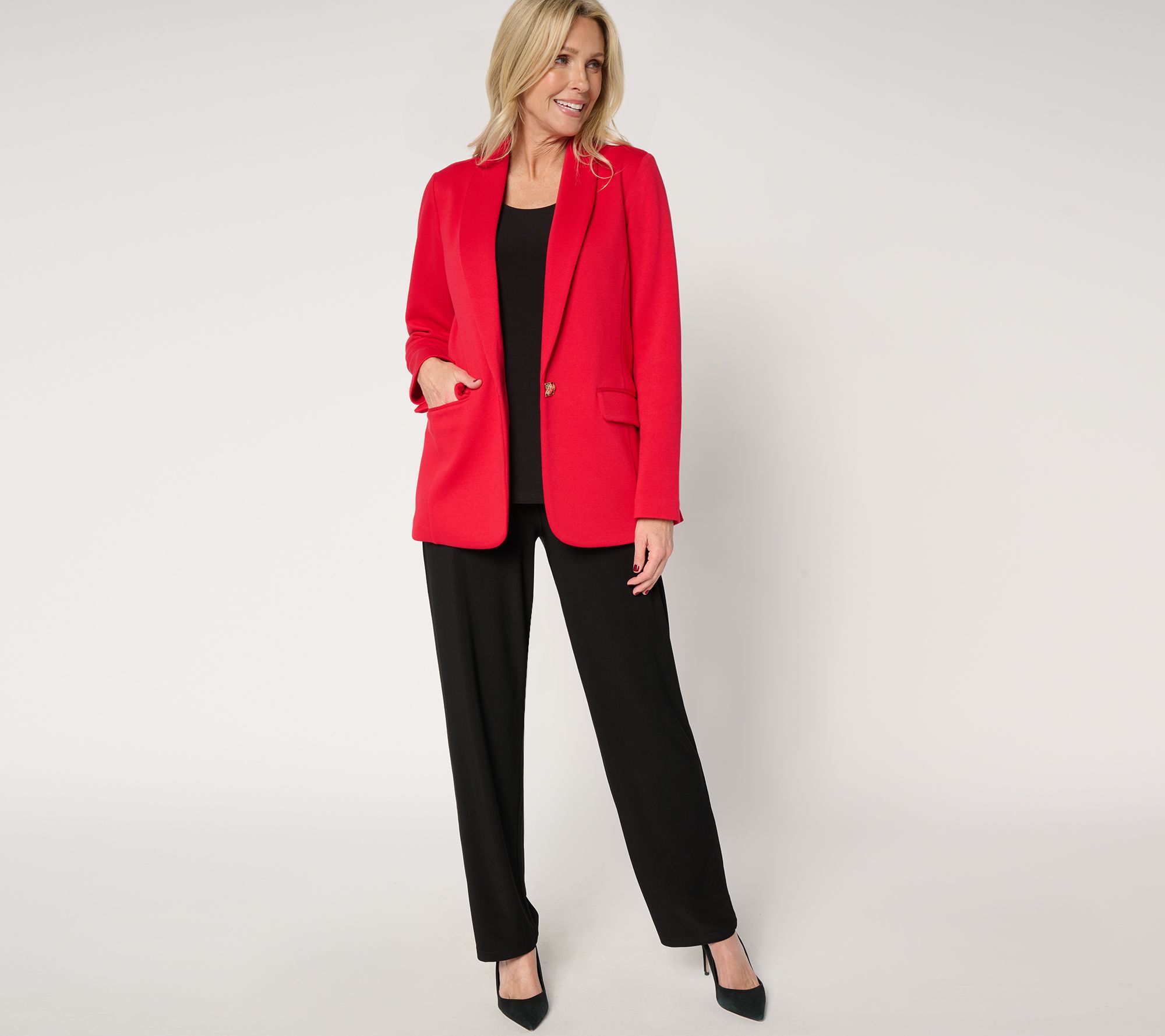 Whether it's for that second round of interviews or for your second Sunday of the month brunch, you'll feel stylishly suited for the occasion dressed in Susan Graver's pique knit blazer. Its sophisticated silhouette pairs just as comfortably with creased trousers as it does with your favorite denim, and marks your arrival with the perfect first impression. From Susan Graver.