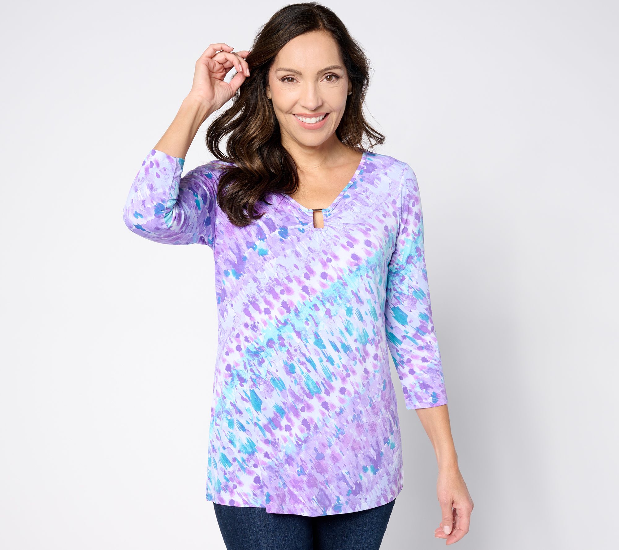This pretty printed Liquid Knit tunic is beautifully designed with a keyhole detail at the V-neckline and 3/4-length sleeves to show off your favorite bangles. From Susan Graver.