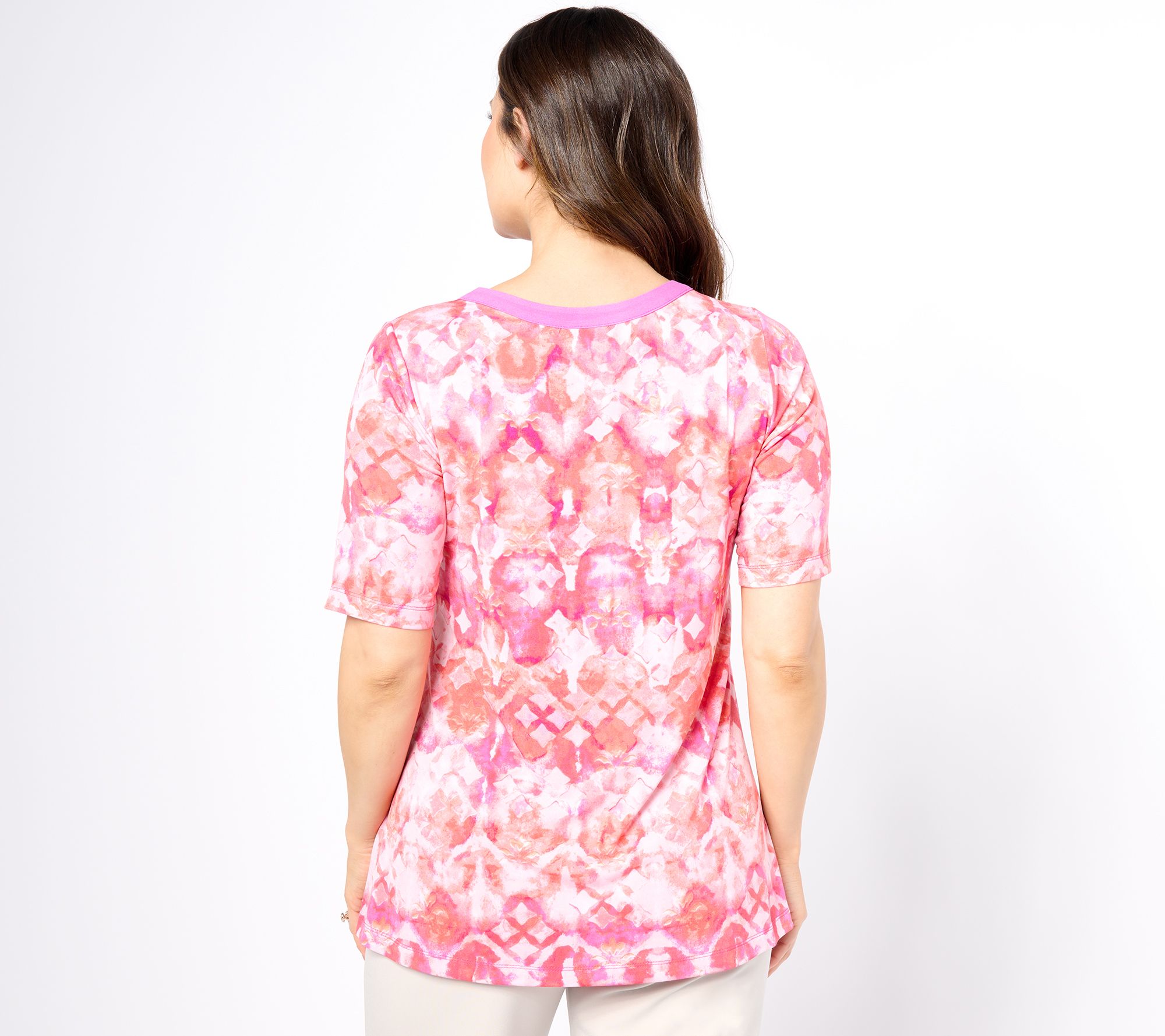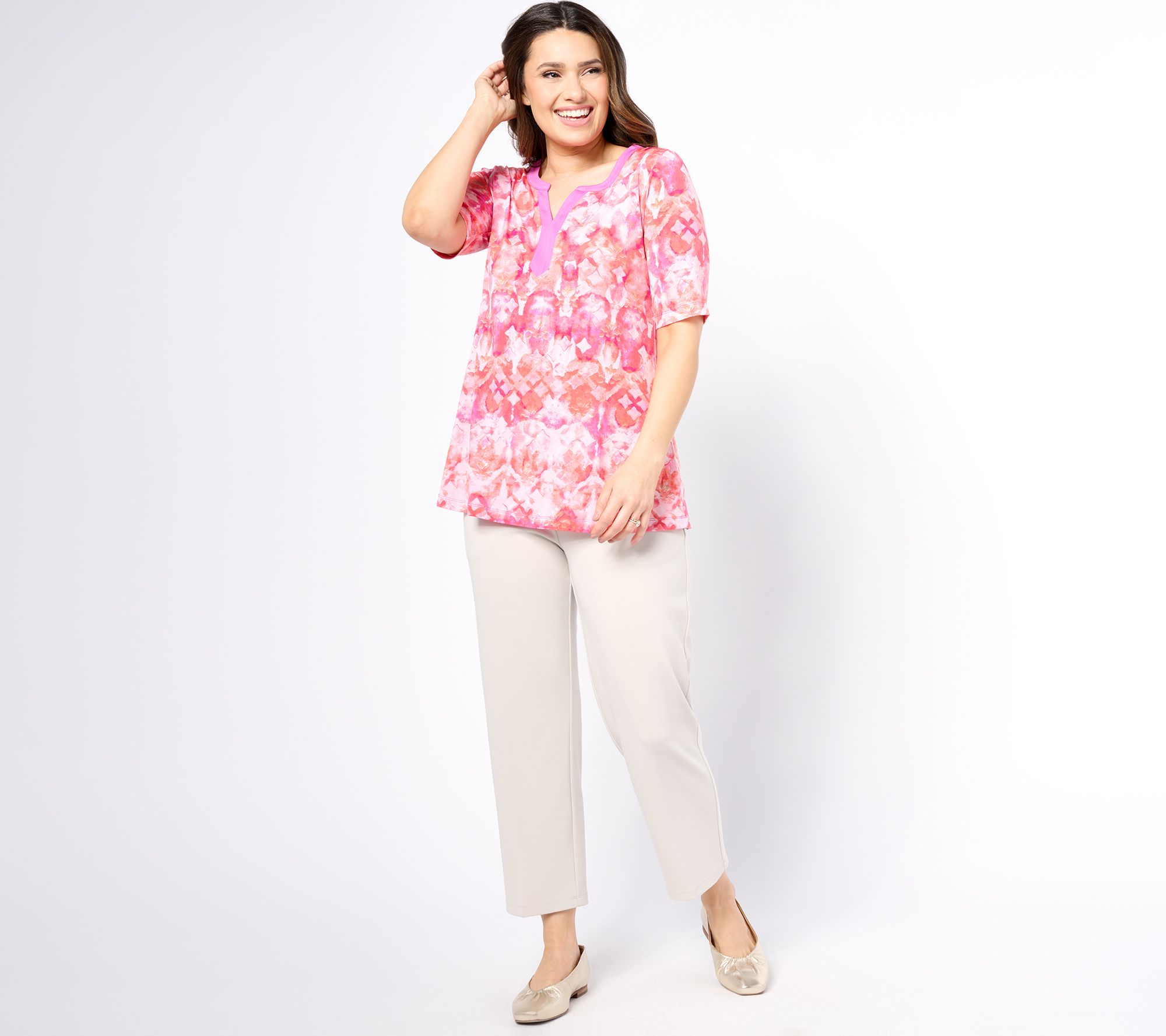 Featuring a contrast colored split neckline, this pretty printed Liquid Knit tunic featuring a flattering A-line silhouette and versatile 3/4-length sleeves. From Susan Graver.