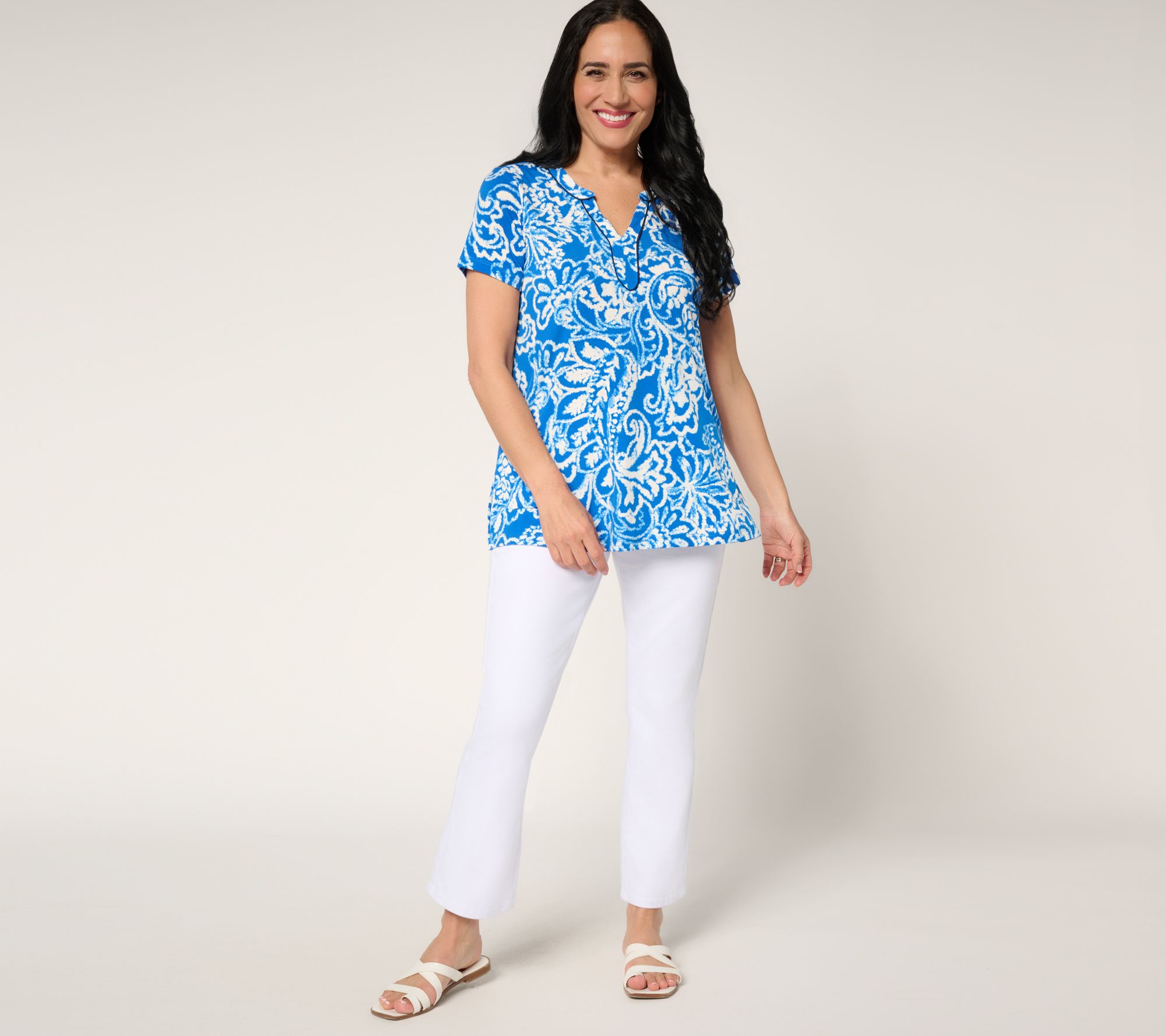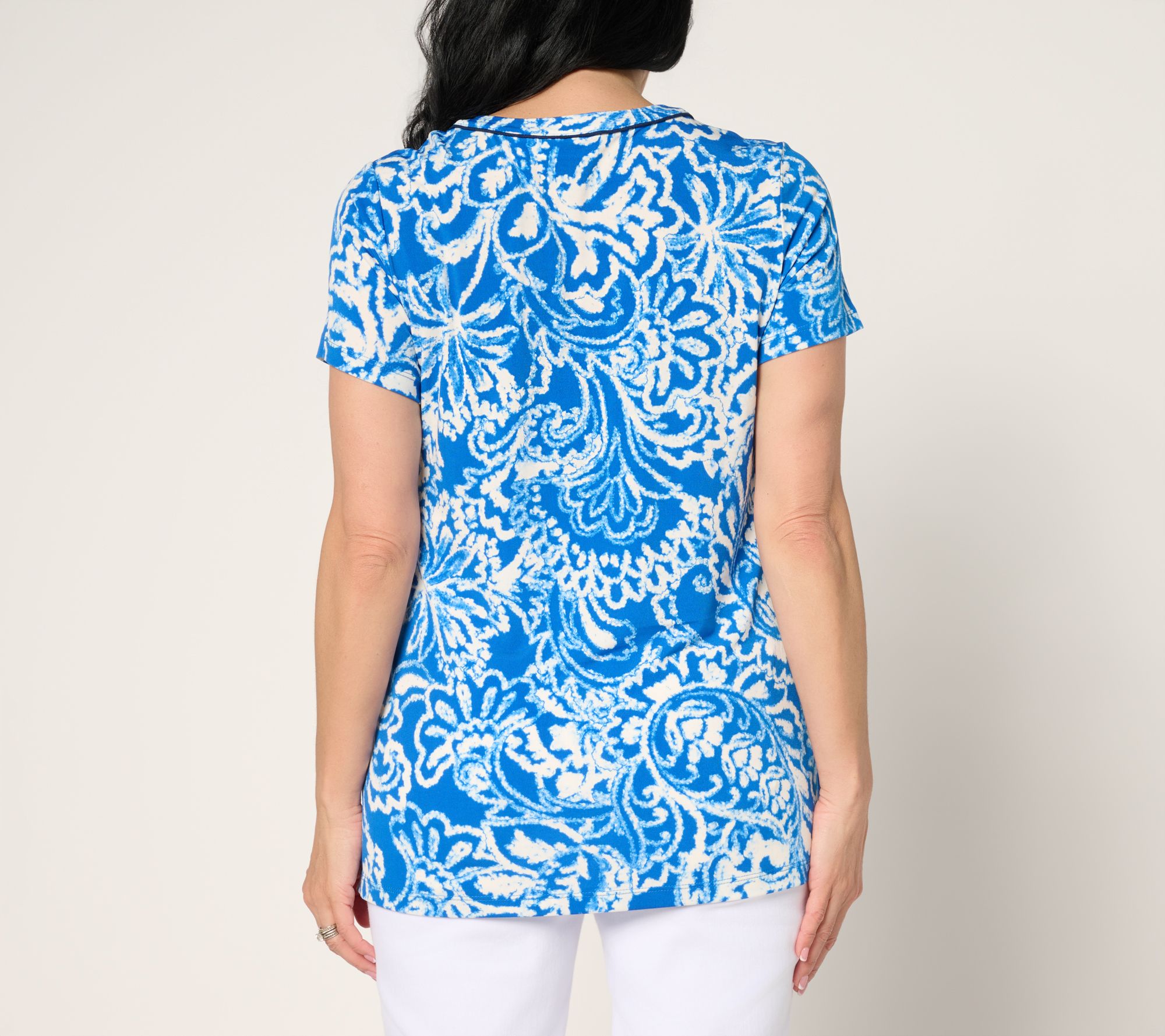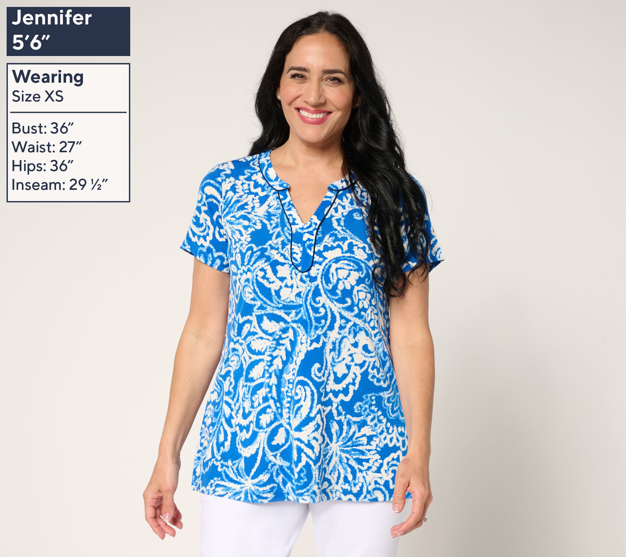 Heading out for lunch dates or casual Fridays? This printed Liquid Knit® tunic makes getting ready a breeze with its pullover style and polished split neckline. Contrast piping adds a chic detail, while the straight hem and side slits keep it easy to wear over your favorite pants or leggings. From Susan Graver.