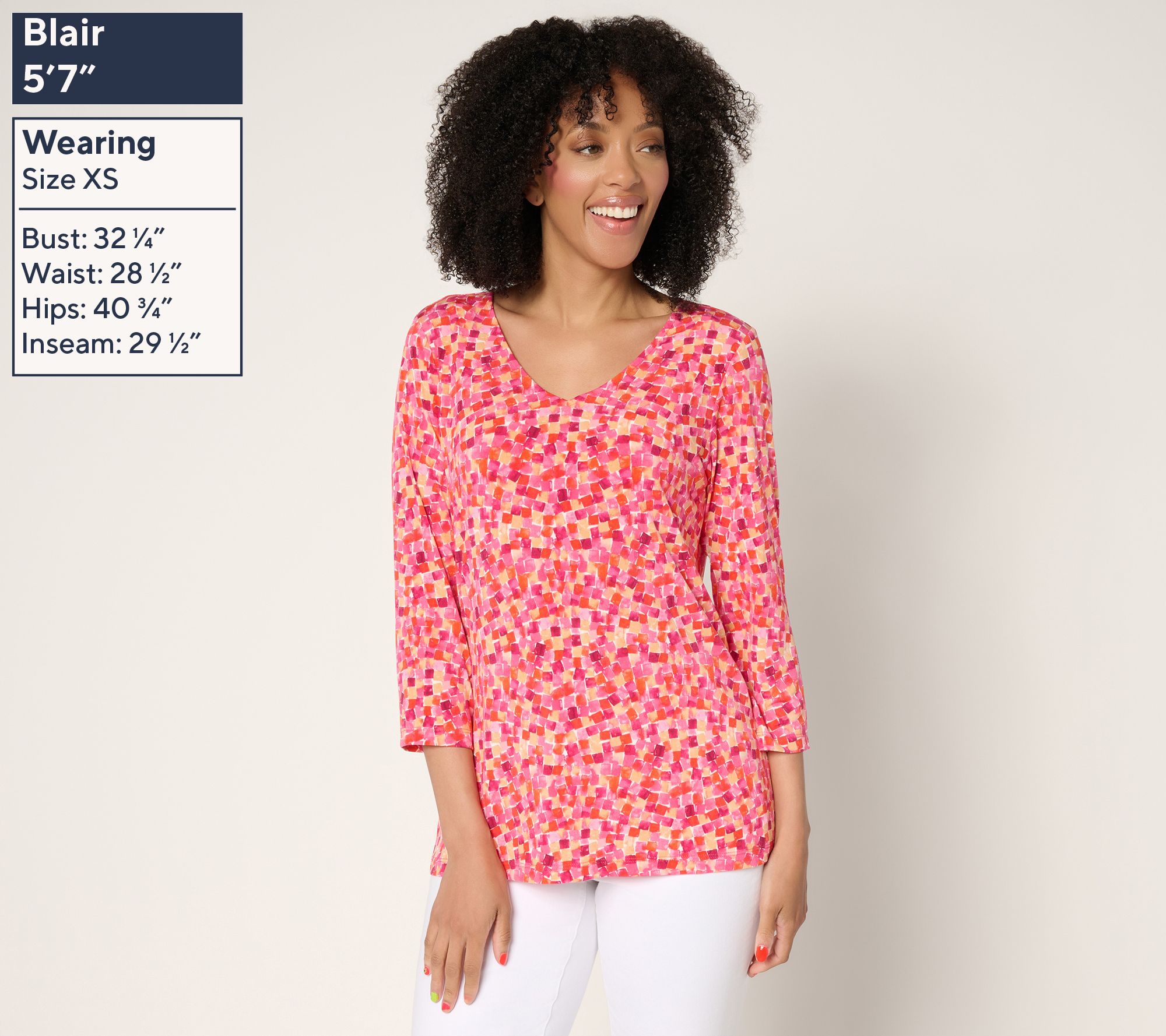 • Features: print, pullover style, one bateau neckline and one V-neckline, 3/4-quarter-length sleeves, straight bottom hems