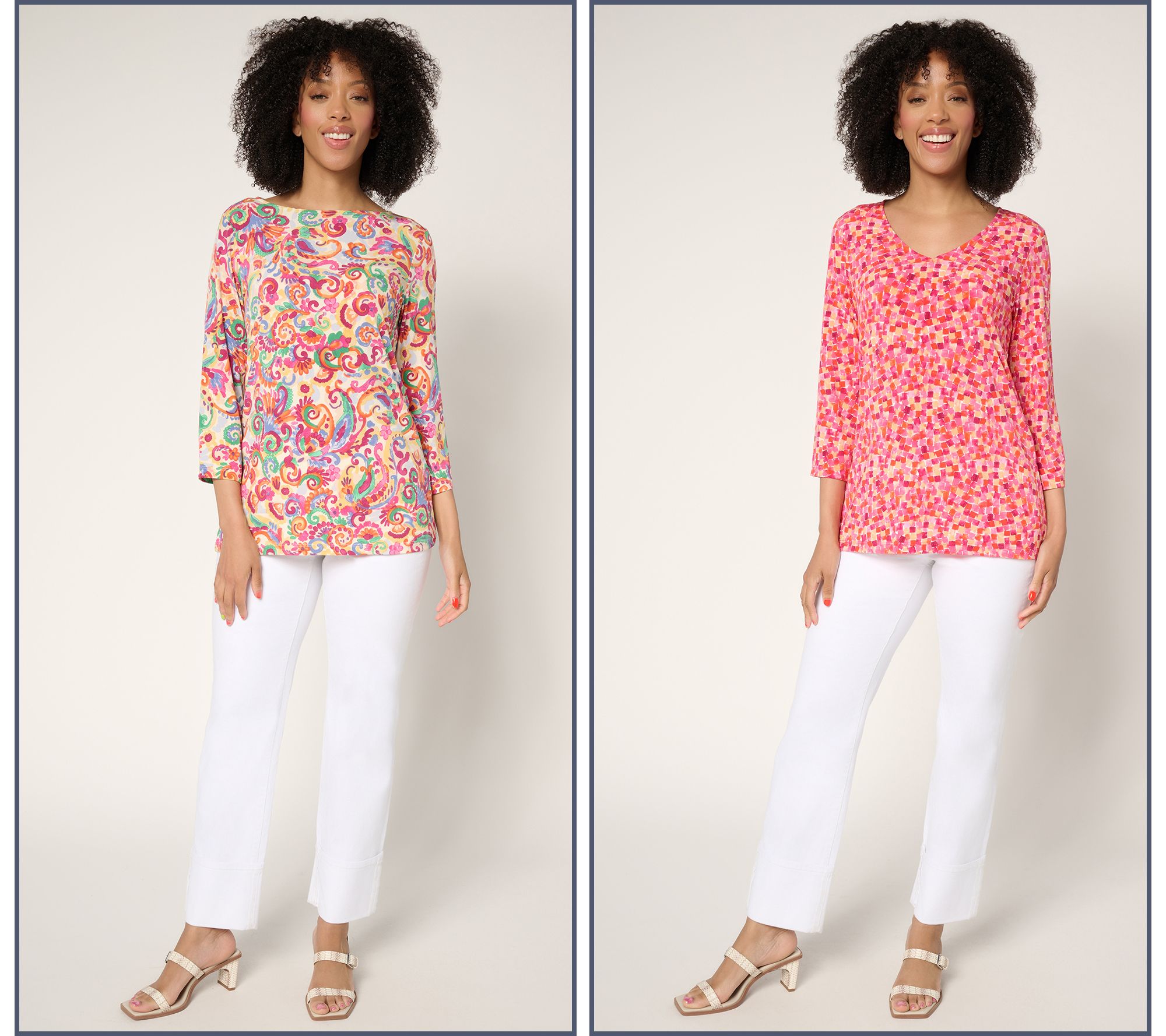 Mix and match your way through the week with this set of two printed Liquid Knit® tops. Whether you slip into the bateau neckline or opt for the V-neck, you'll enjoy silky-soft comfort and versatile three-quarter sleeves -- perfect for layering or wearing solo from workdays to weekend plans. From Susan Graver.