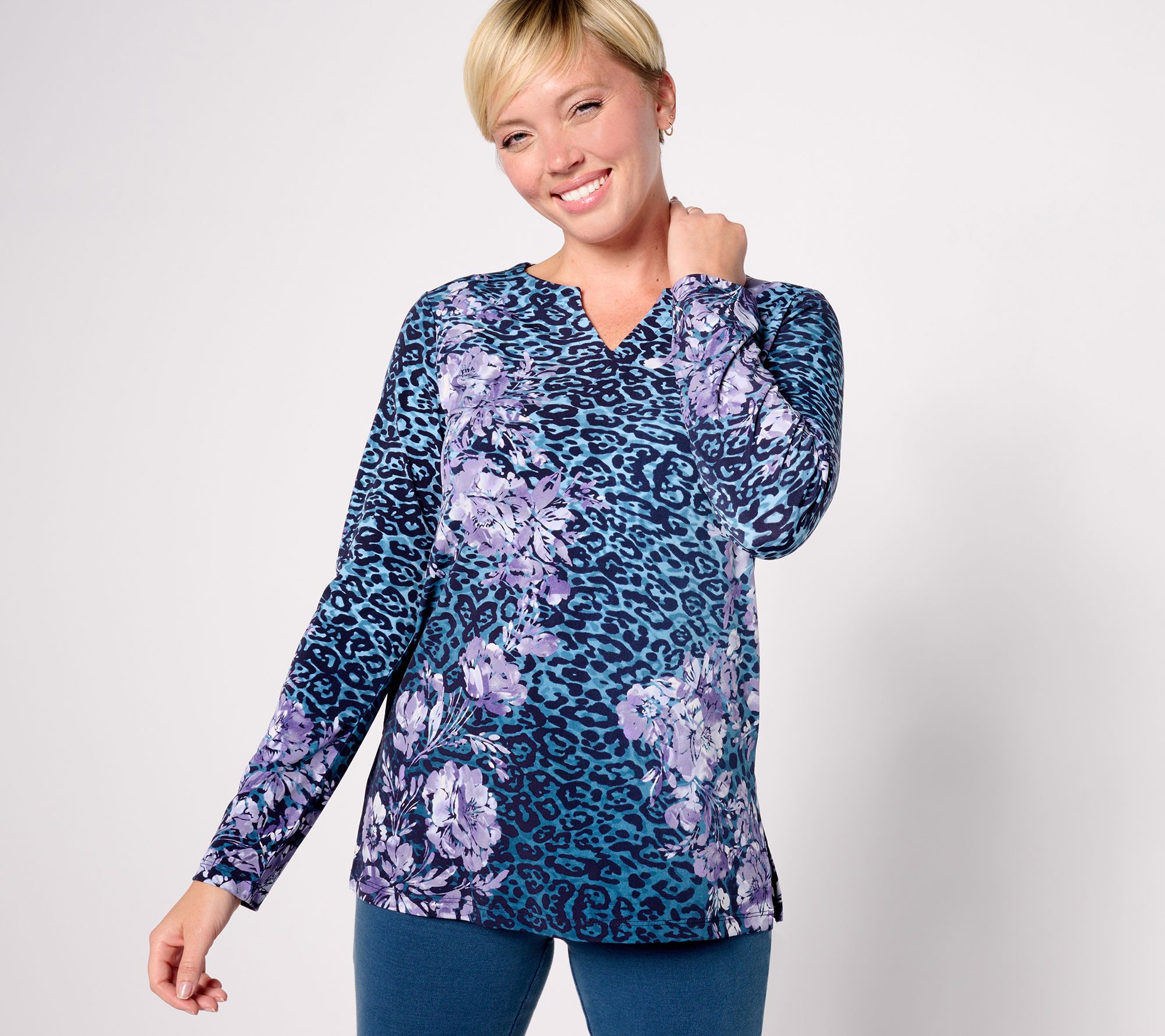 Exude feminine charm in this split-neck tunic that gracefully drapes over your frame. Wear it with your favorite jeans and heels and show off the bold printed pattern. From Susan Graver.