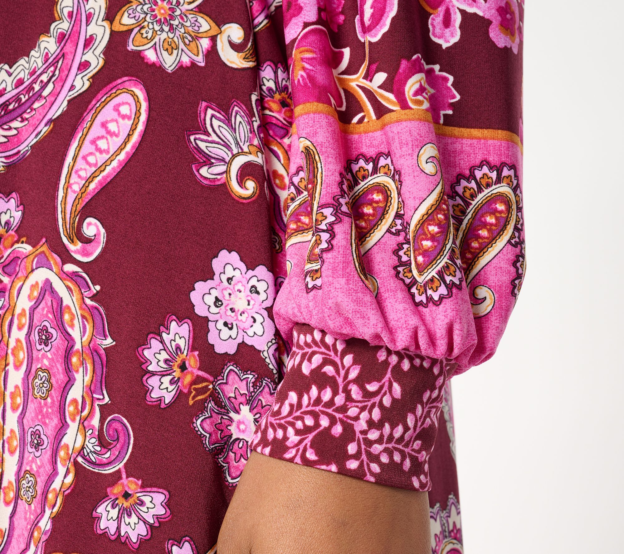 • Features: allover print; cuff long sleeve; shirring at armholes; contrast waistband, cuff, and detail around neck down center front