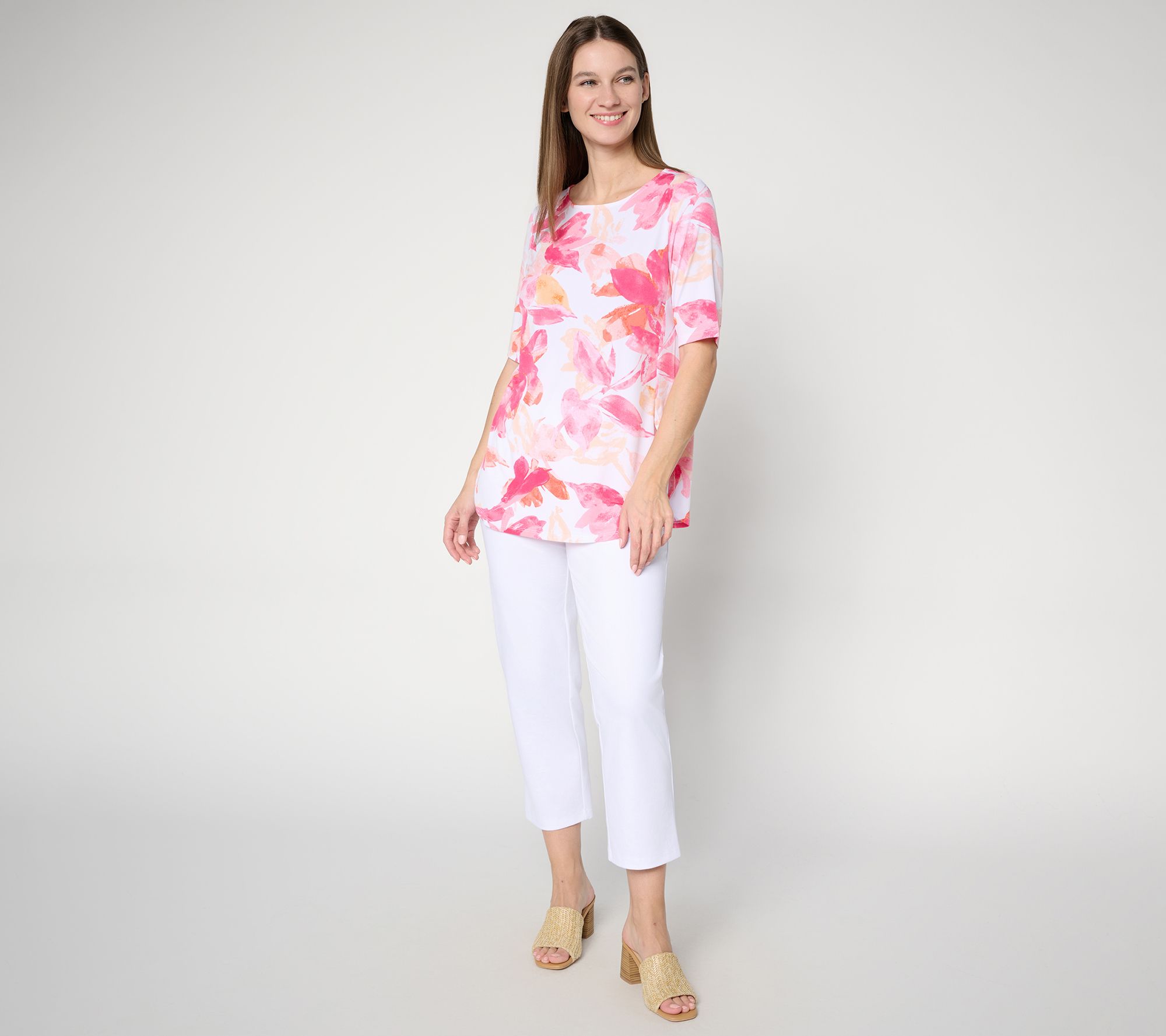 Top off springtime outings and summery social events with this printed tunic. Its feminine details and fluid drape make it a fashion favorite for laid-back leggings and polished trousers alike. Add in a solid cardigan and this multi-season style staple is a can't-miss in the cooler weather! From Susan Graver.