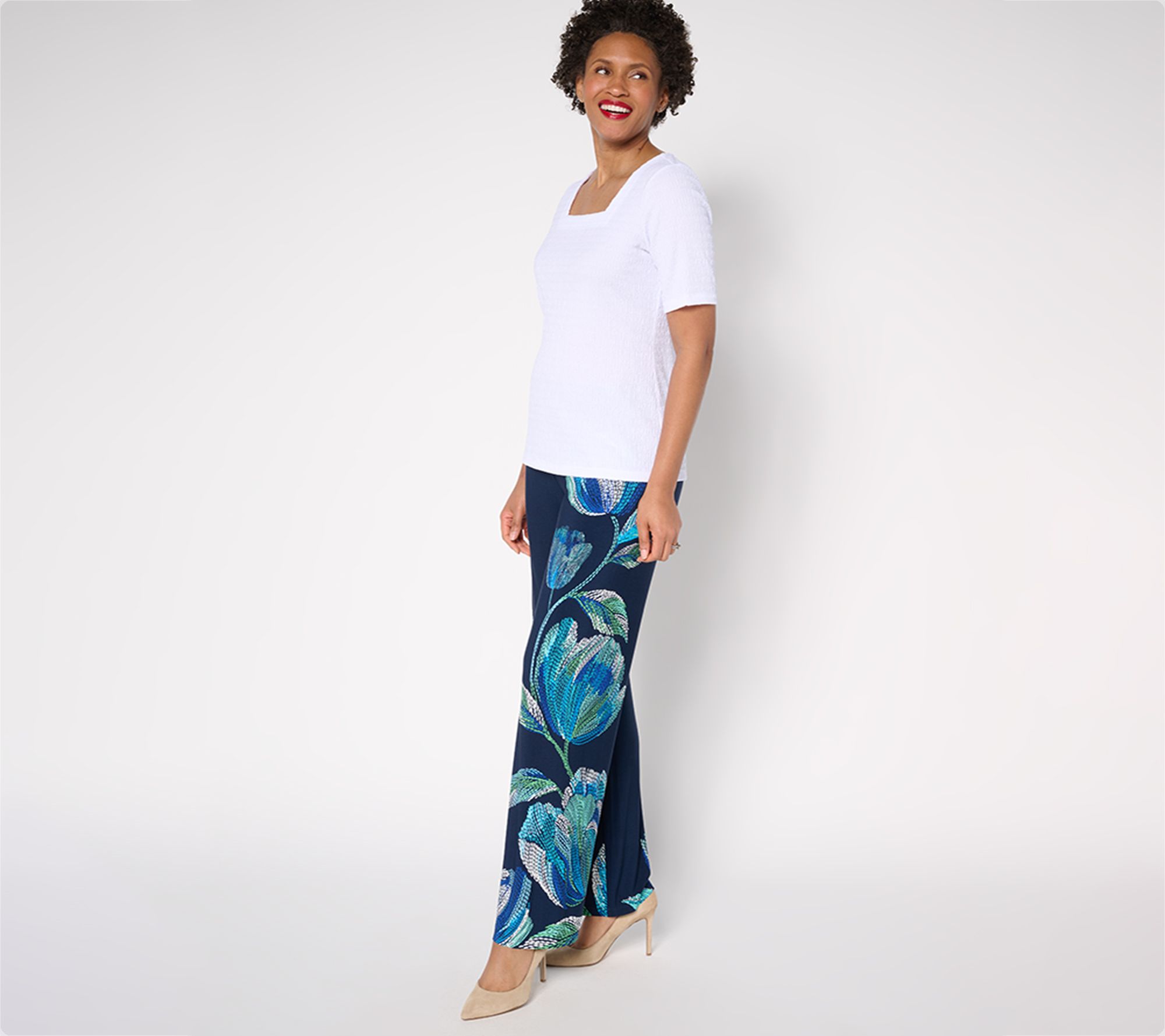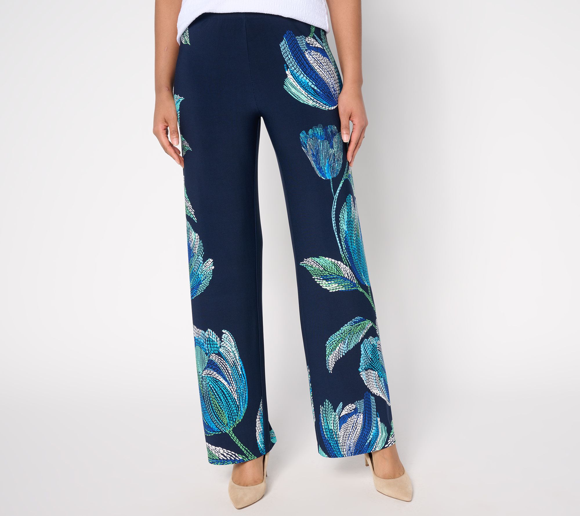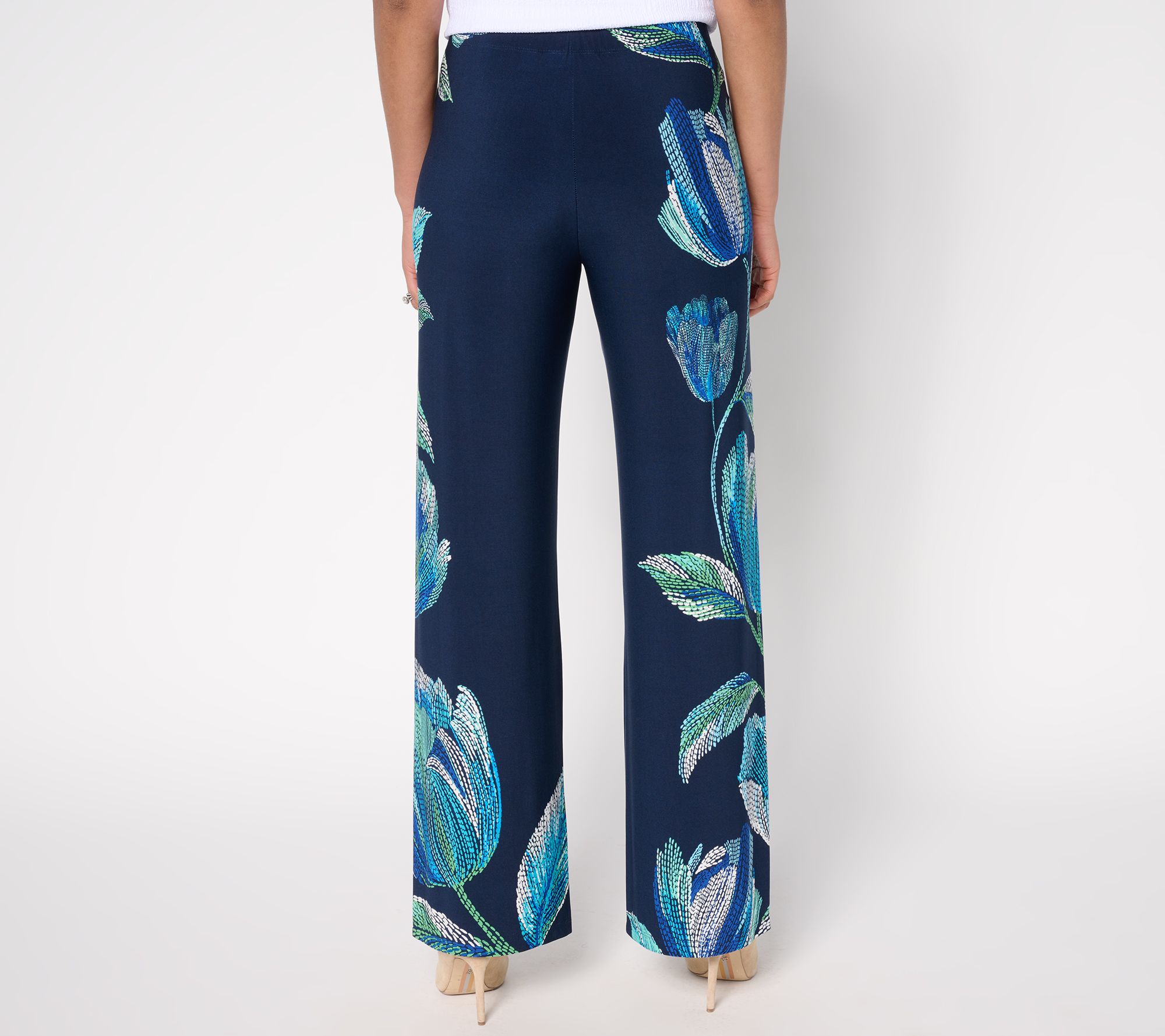 Need a vacay from solid colors and slim legs? Pop on these smooth and drapey Liquid Knit® pants that refresh any outfit with their lively print and easy wide-leg silhouette. From Susan Graver.