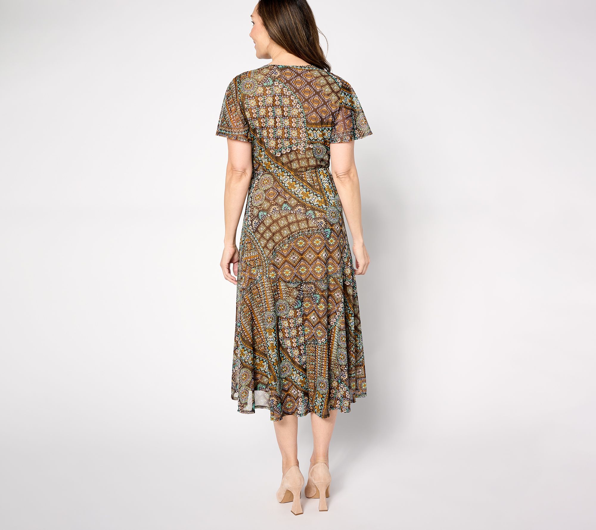 "As Is" Susan Graver Regular Printed Mesh Flutter Sleeve Faux Wrap Dress