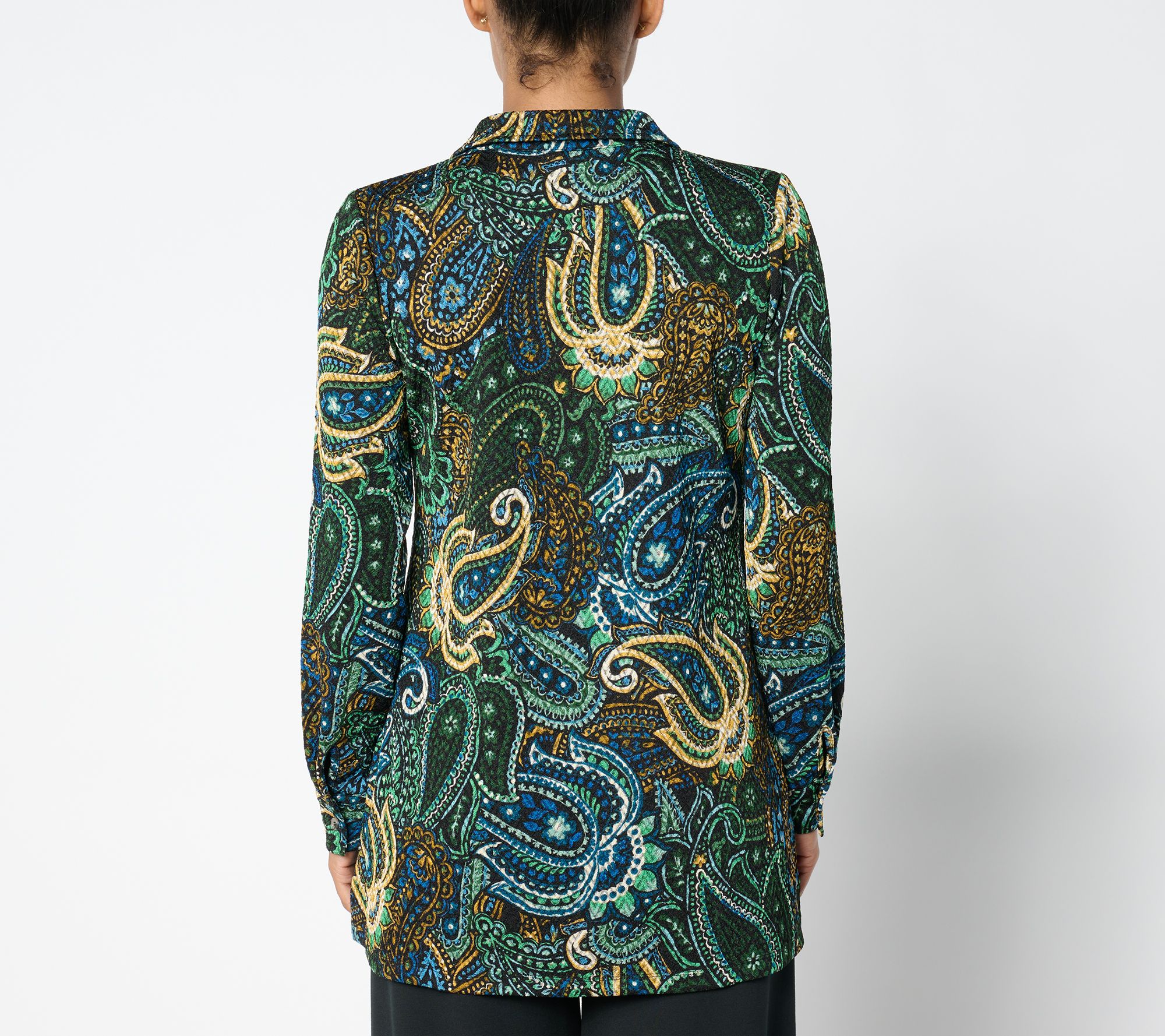 A pretty paisley print covers this button-front tunic, adding an air of sophistication to the look. Plus, the A-line silhouette is flattering to all body types, offering added wearing ease. From Susan Graver.