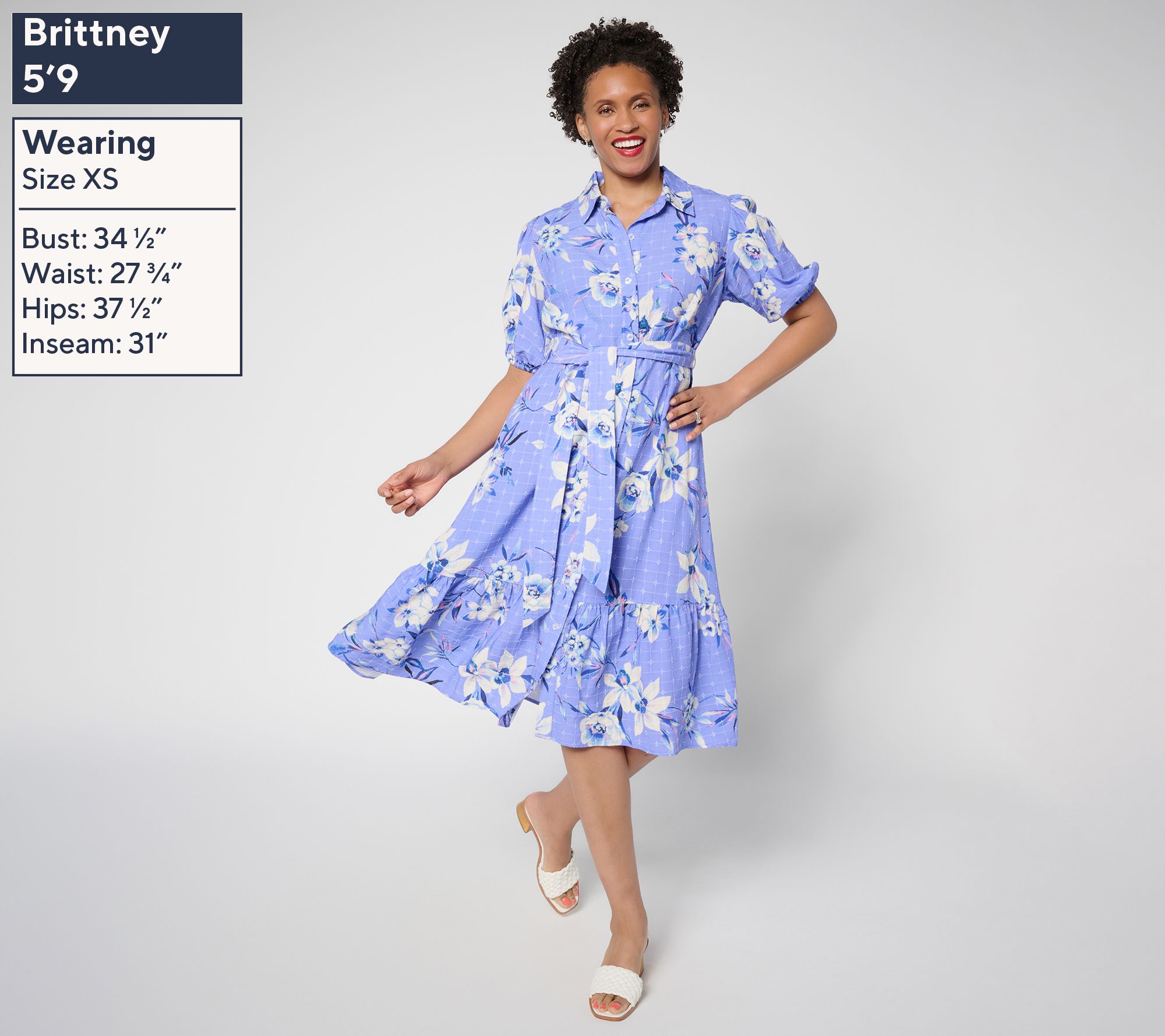 Celebration-ready? Perfect for garden parties and daytime gatherings, this textured midi dress pairs a playful print with charming details. From Susan Graver.