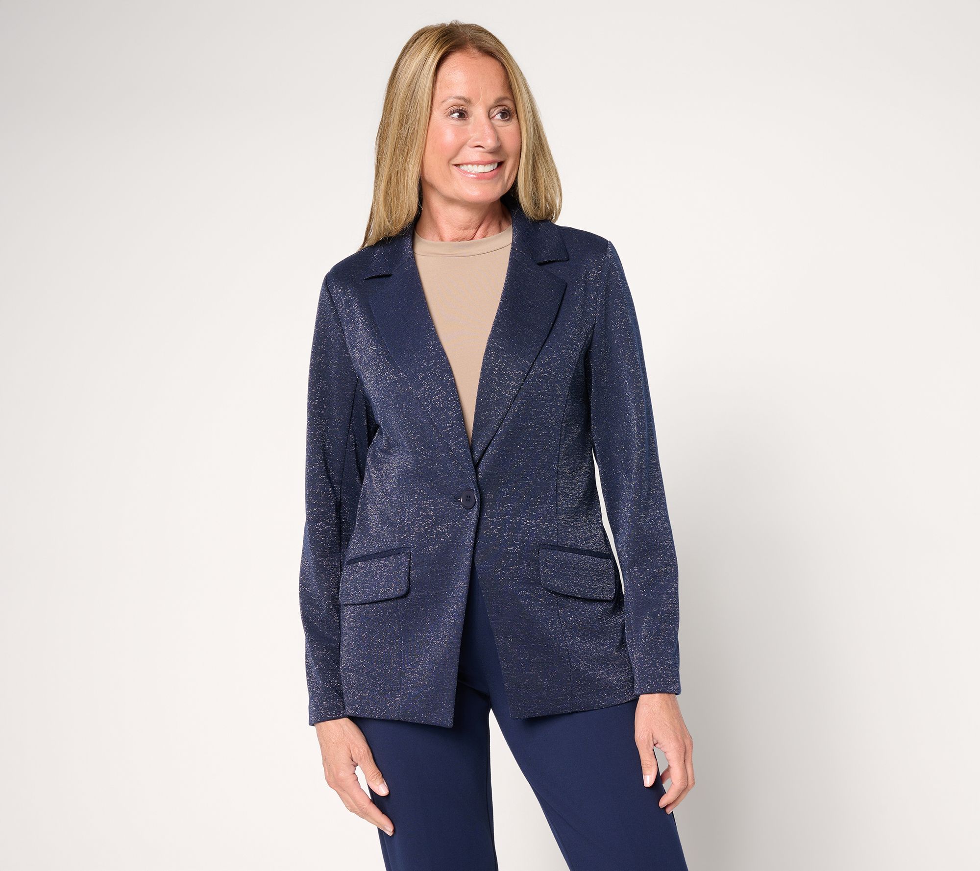 A little bit softer now. In this knit blazer with a soft metallic finish, find a festive fashion moment that's undeniably sophisticated and more subdued than dramatic disco ball styles. Sport it with everything from jeans and sneakers to your prettiest frock and party shoes, and watch its versatility extend well beyond the NYE countdown. Think spring weddings, birthday celebrations, and evenings at the theater. From Susan Graver.