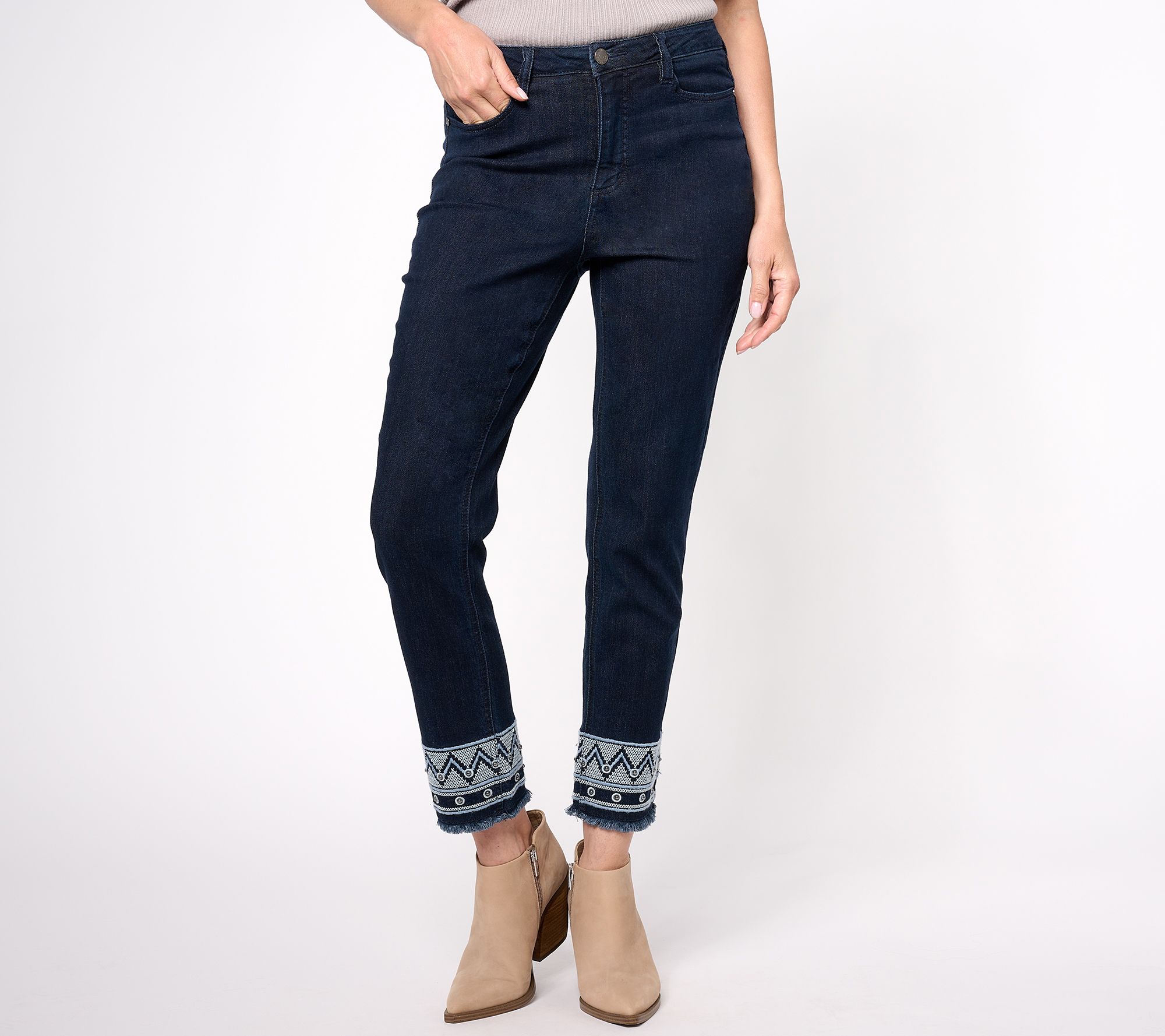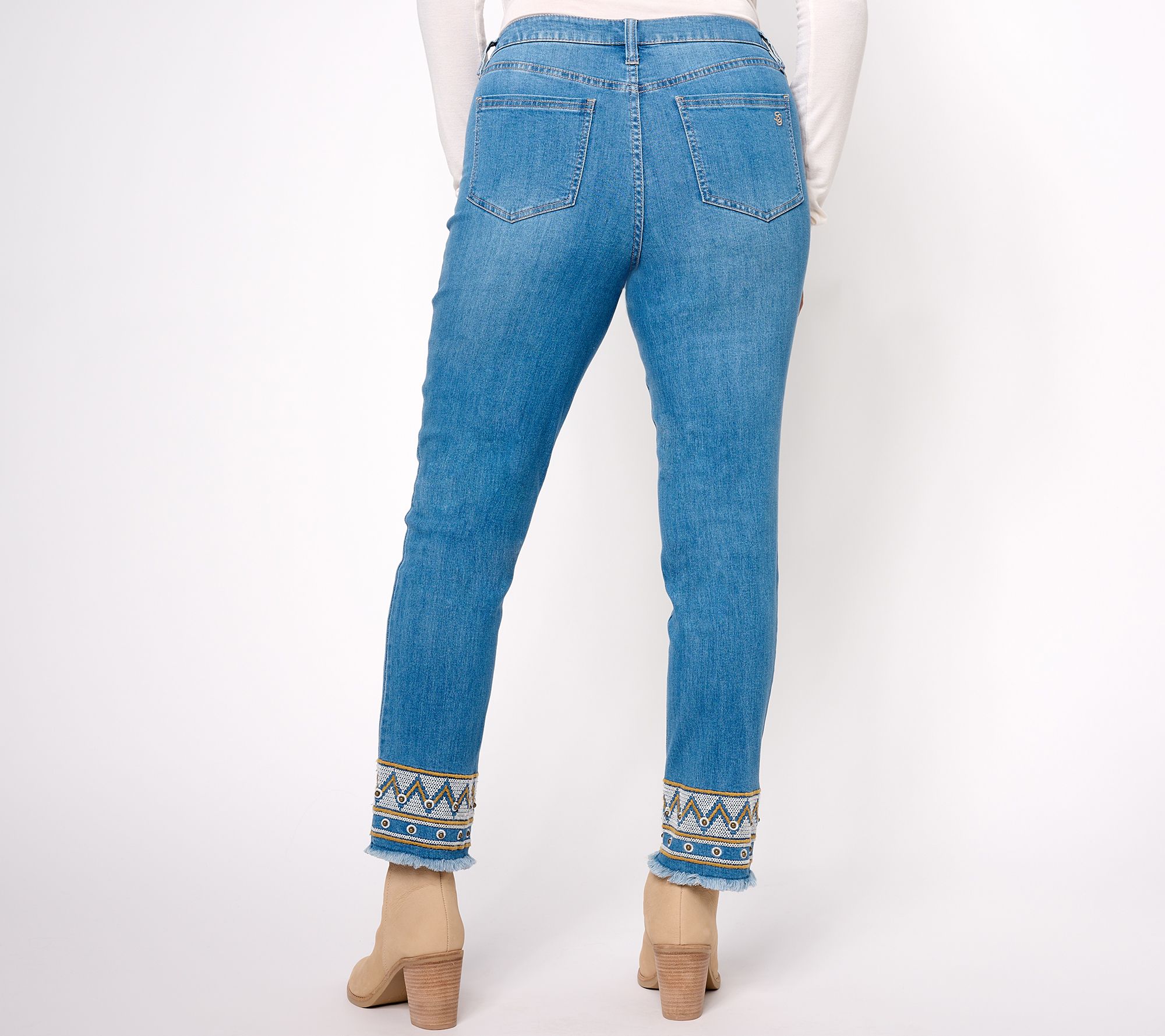 These Susan Graver must-have jeans tell a classic story every closet should invest in: zip-front fly, five-pocket styling, and a never-out-of-style straight-leg silhouette. But the narrative doesn't end there. The fresh embroidery at the frayed bottom is the deet that delivers a head-turning look -- every time! (We love surprise endings!) From Susan Graver.
