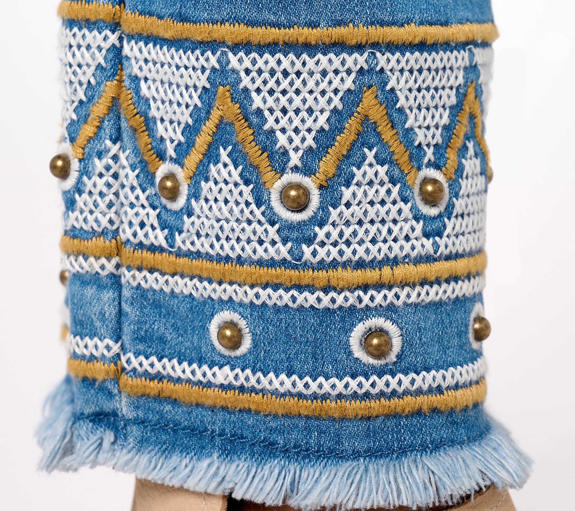 • Features: five-pocket styling, back yoke, embroidery at frayed hem