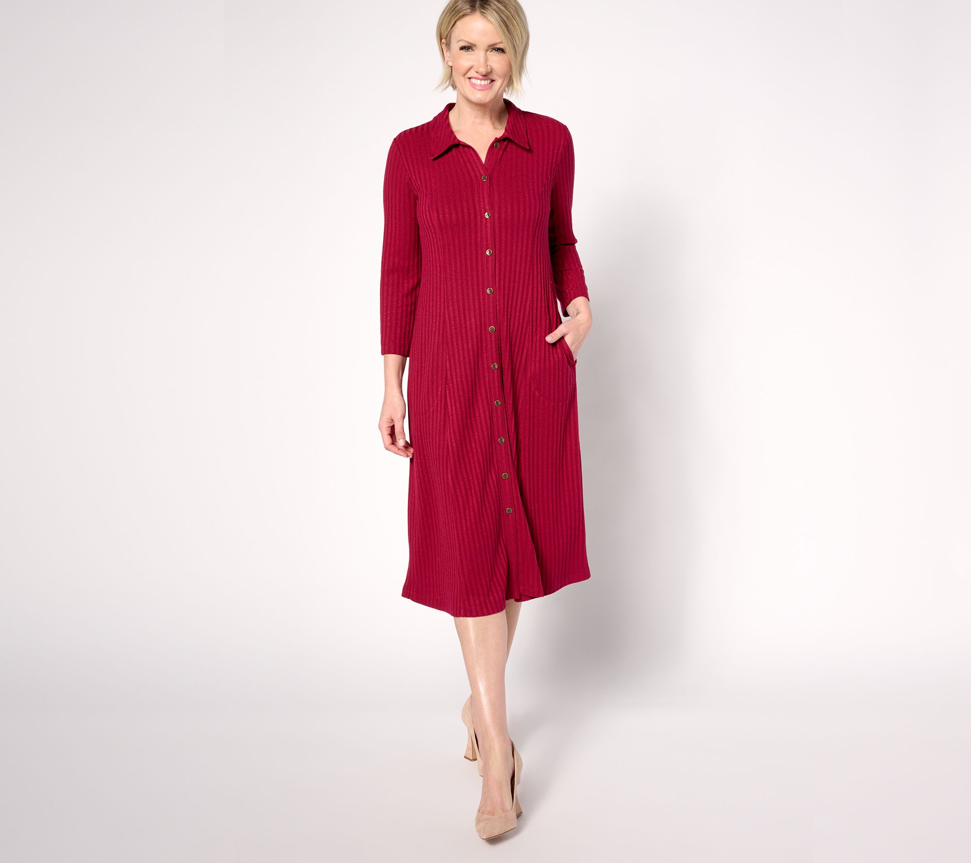Sashay through the day in this button-front midi dress. The ribbed sweater knit is oh-so comfy, a true testament to your impeccable style. From Susan Graver.