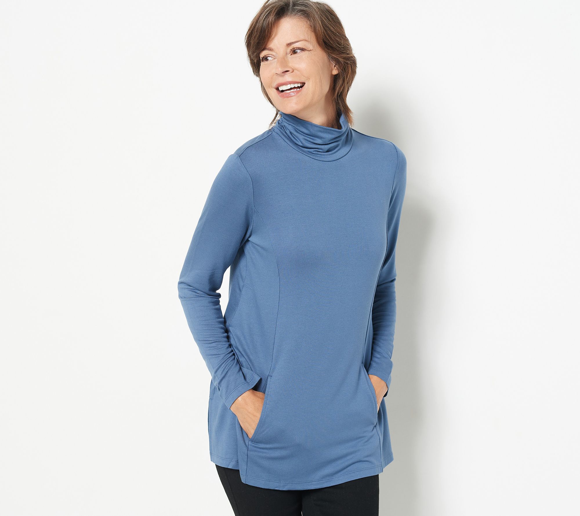 Pair this oh-so-comfy, pocketed (!) turtleneck with different jackets, scarves, and your favorite pieces of jewelry. Drape a long-chained necklace over it, throw on a puffy vest, some jeans, and a pair of high-heeled boots, and that pesky winter chill is no match at all for this chic 'fit. From Susan Graver.