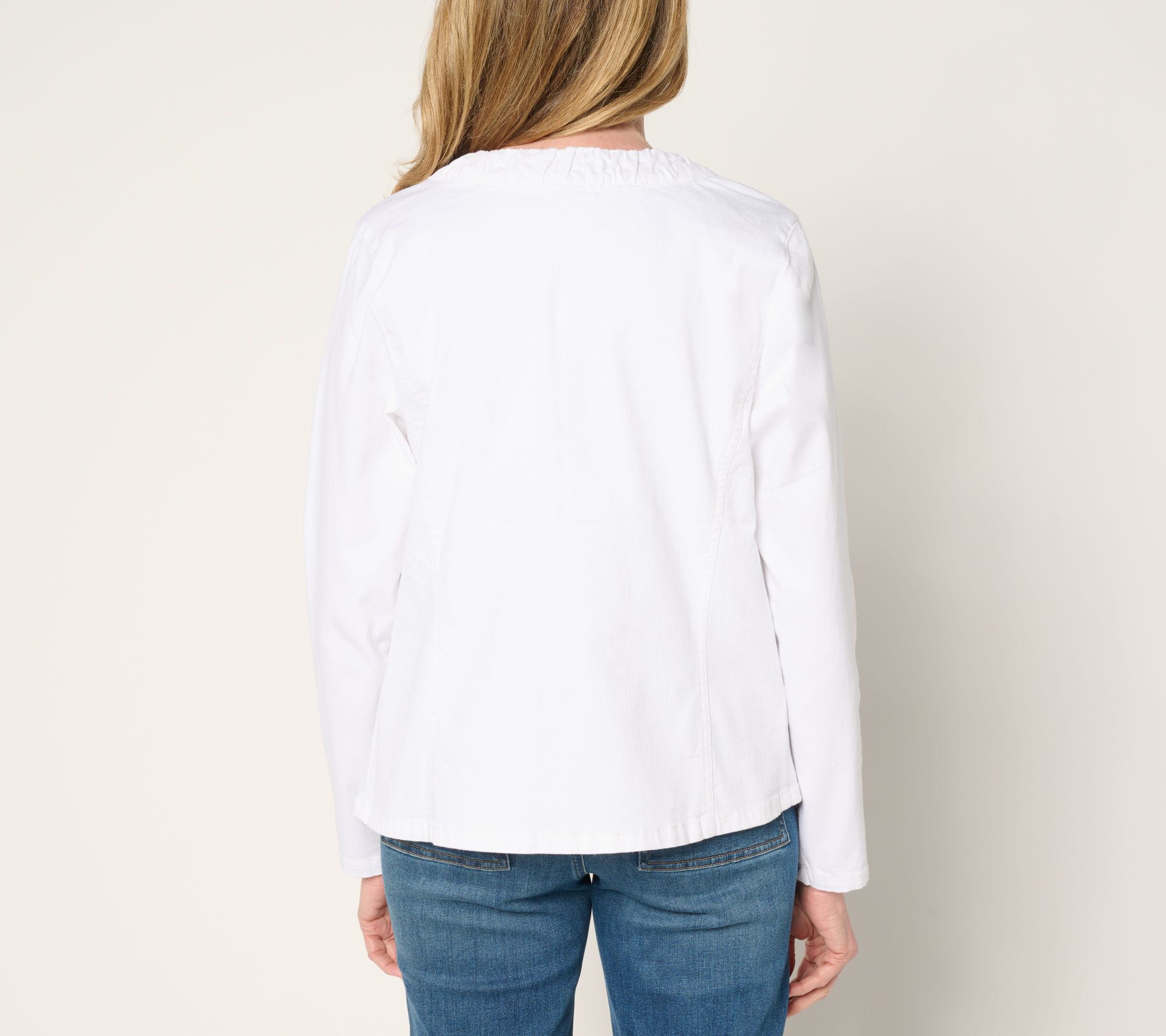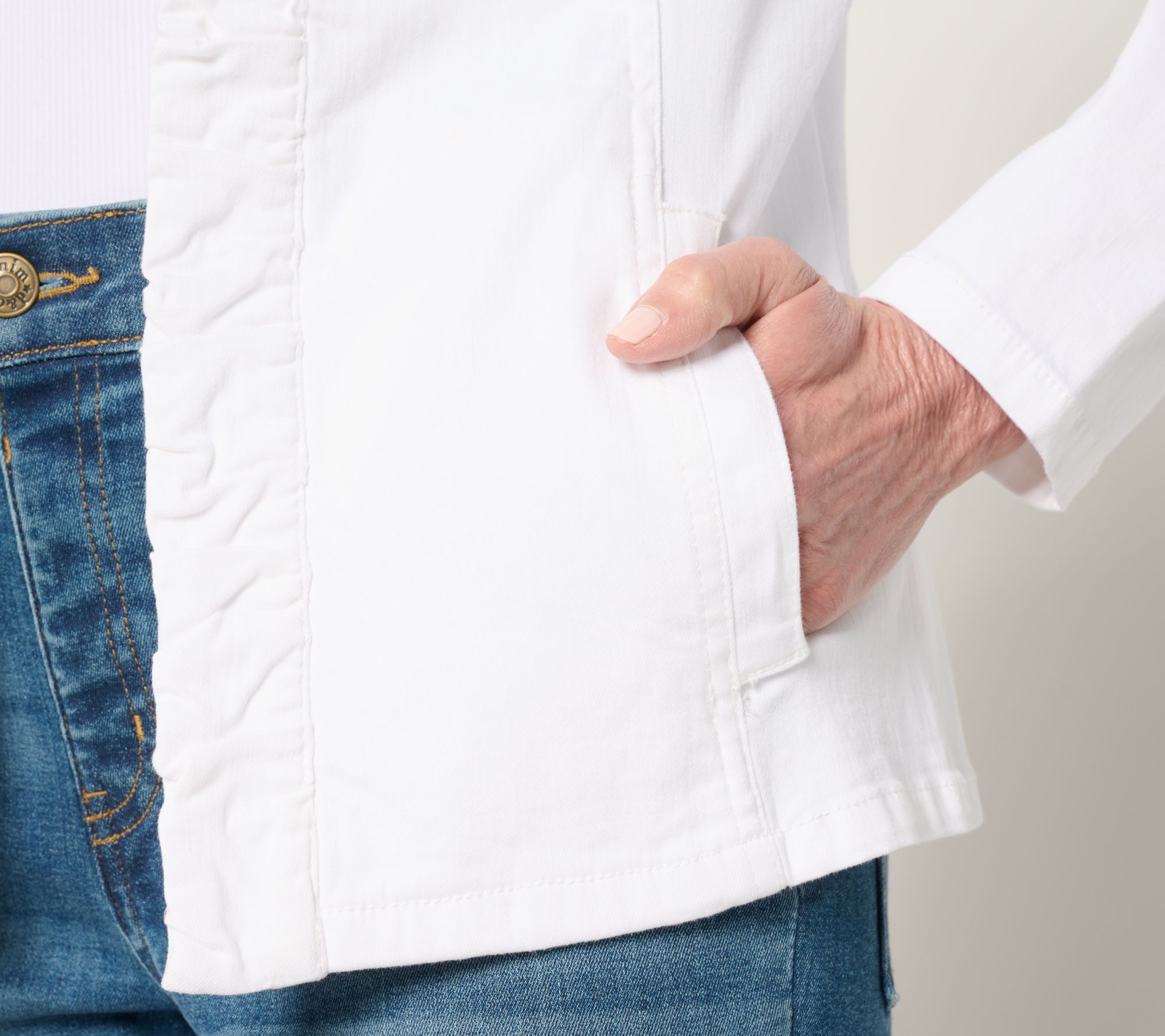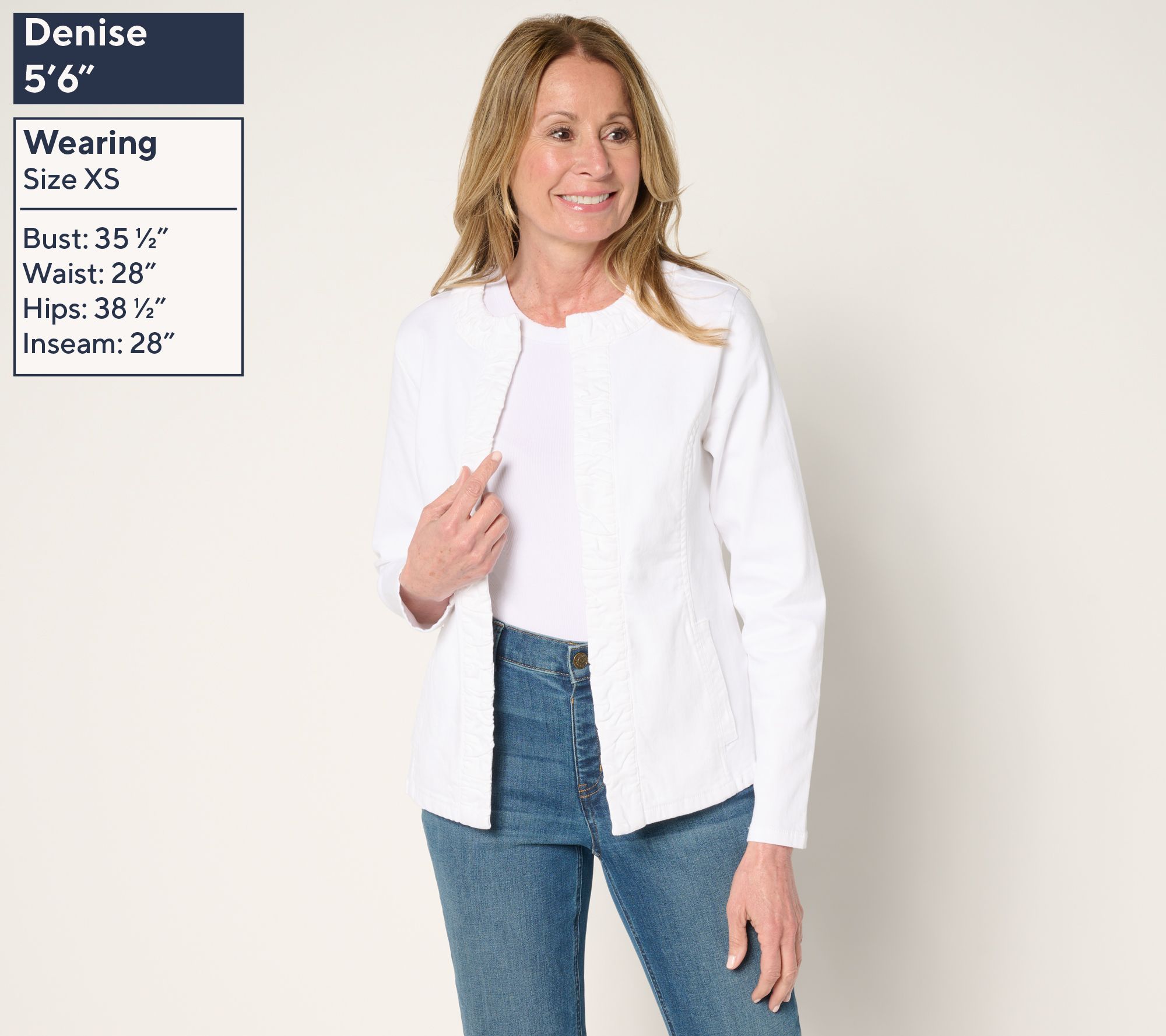 Whether you're heading to lunch with friends or casually walking around town, this stretch white denim jacket complements any outfit. Ruched details add interest and a touch of flair. From Susan Graver.