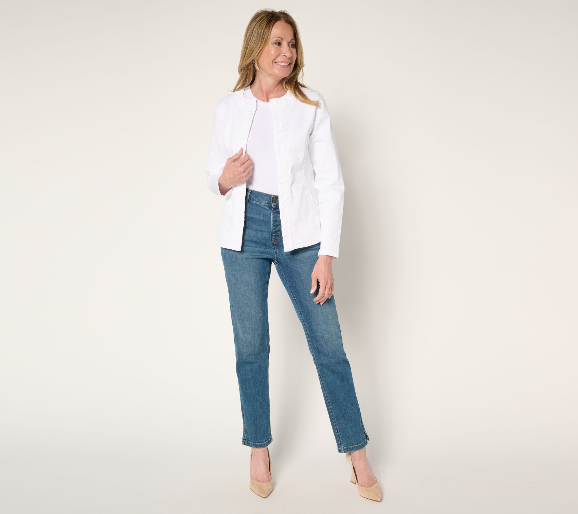 "As Is" Susan Graver Ruched Front Stretch White Denim Jacket