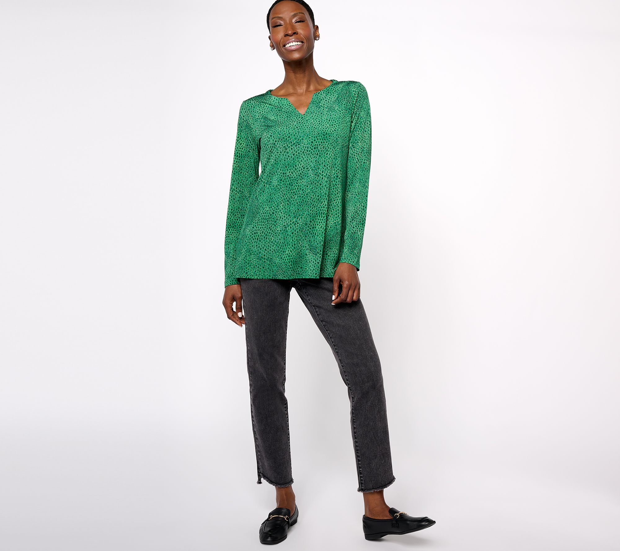• Features: split neckline, long sleeves, straight hem