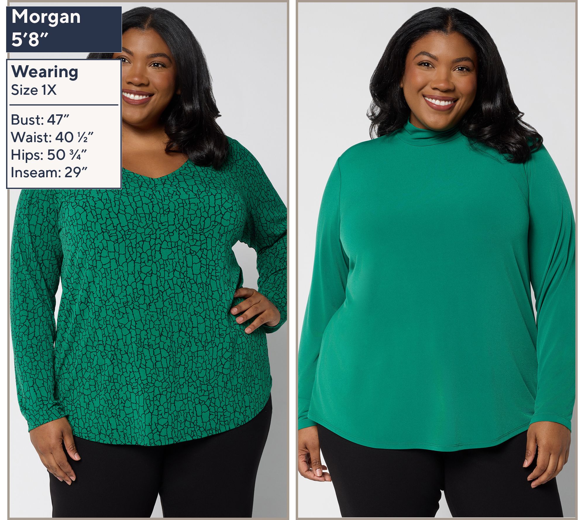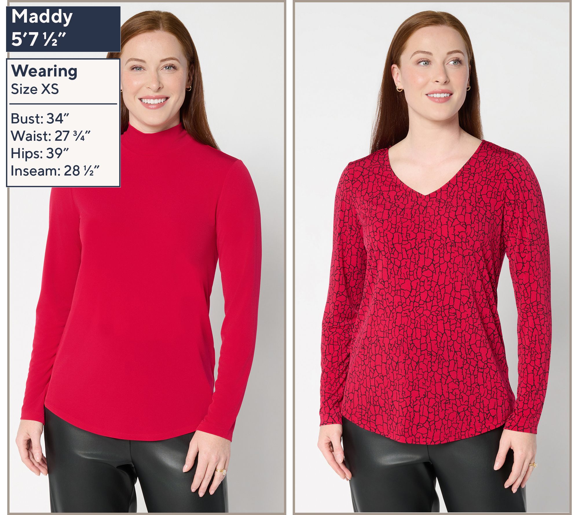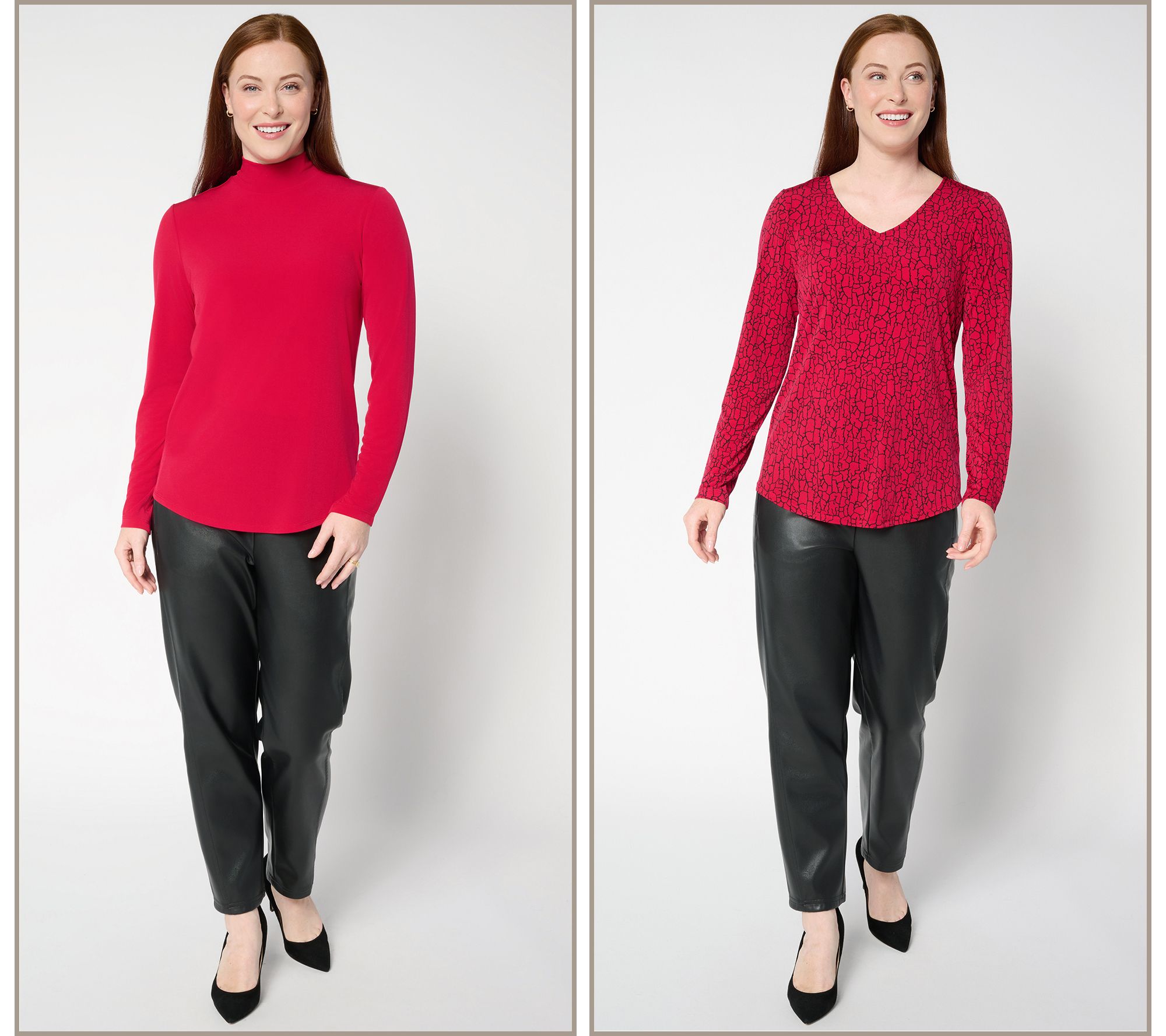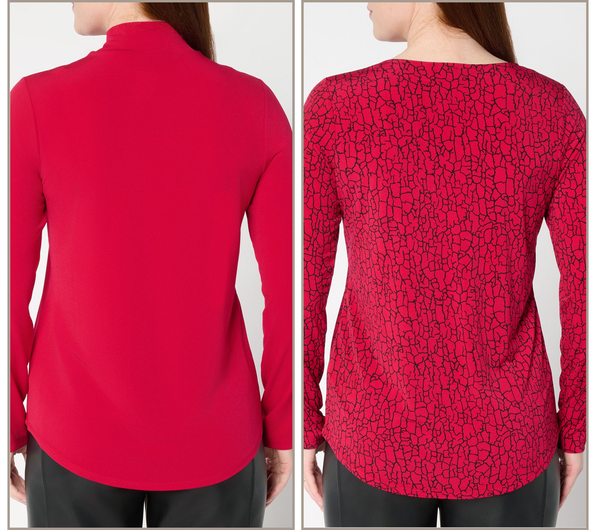 Sometimes you feel like a print. Sometimes you don't. Options are always a good idea when you've got places to go and outfits to prep -- so look to these mood-matching Susan Graver Liquid Knit® tops to be here for it all. With a printed V-neck and solid-color mockneck in your ready-in-seconds rotation, you'll never be stuck endlessly sorting through your closet for seasonless staples. Mix, match, wear solo, or layer up -- you've got lots of plans, and so does this no-cling (and no-iron!), curve-skimming set with its wear-now, wear-whenever aesthetic. Pair with jeans, joggers, wide-leg trousers, or midi skirts -- or go matchy-matchy with some Liquid Knit® pants. From Susan Graver.