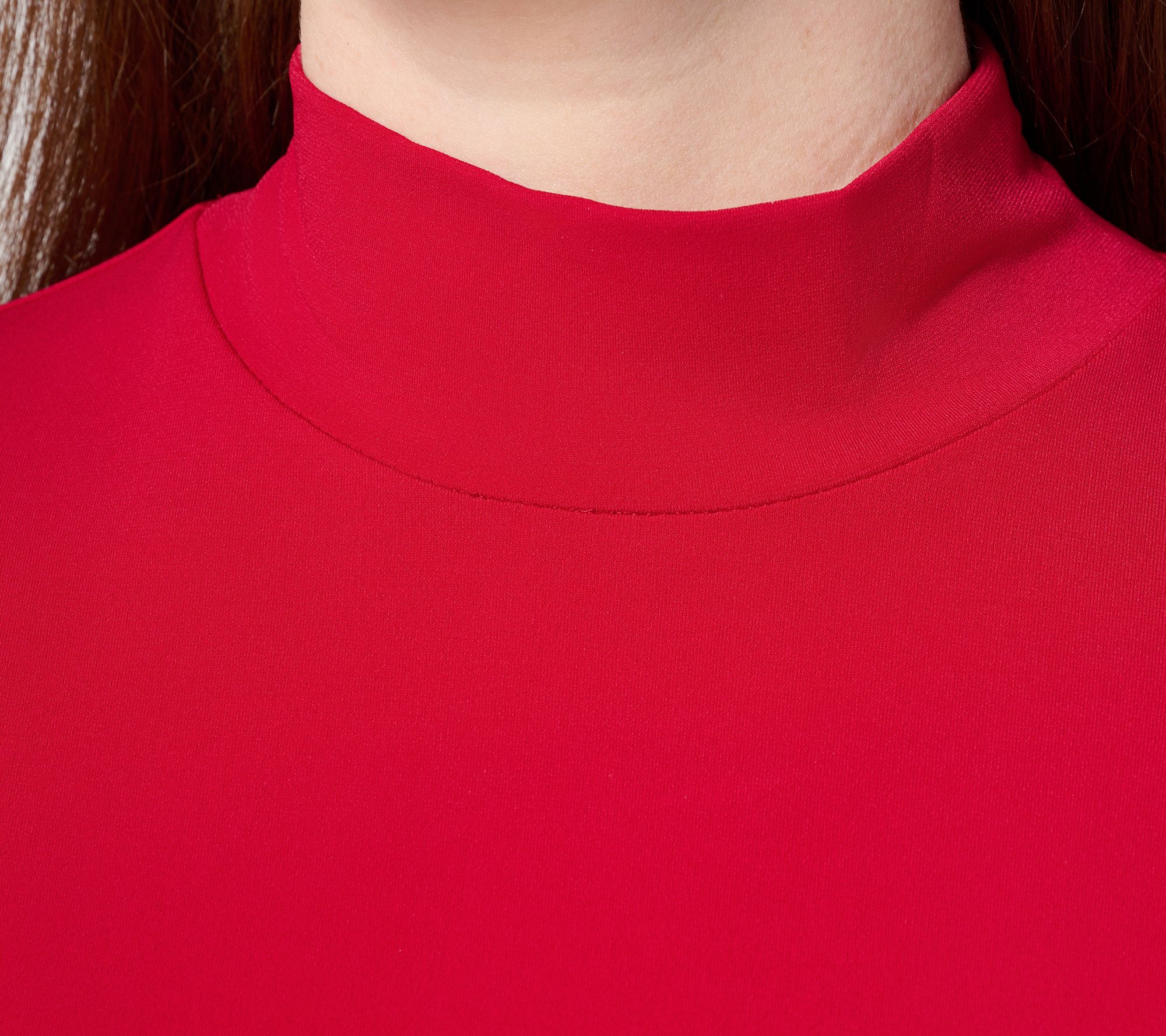 • Solid Features: mock neckline, long sleeves, curved bottom hem