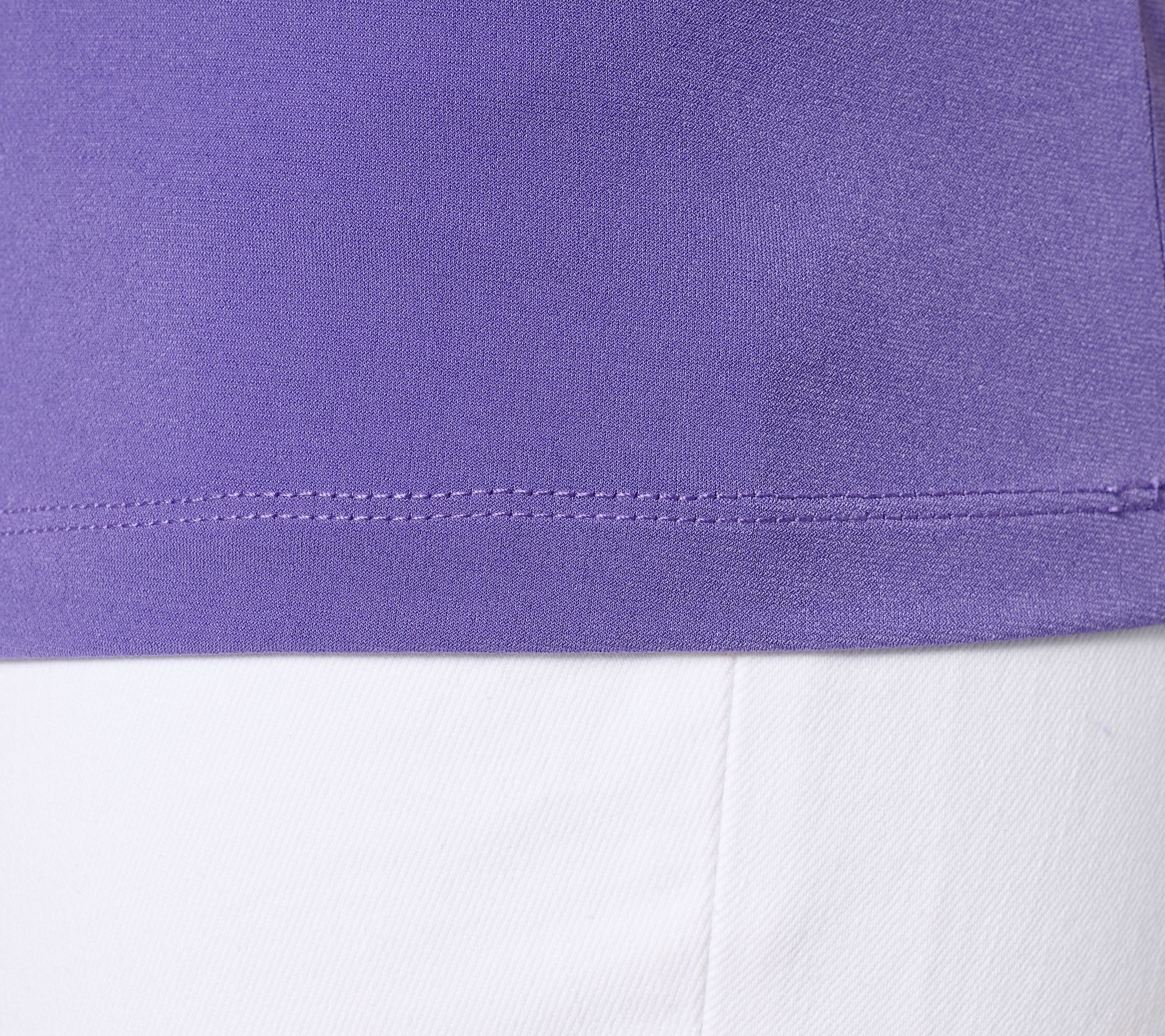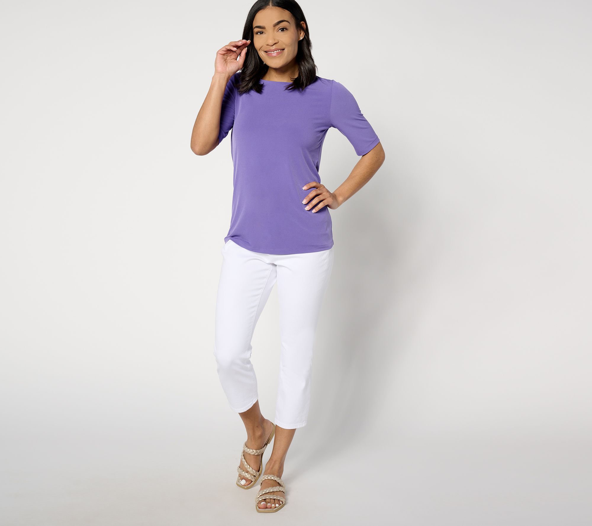 What may appear as a basic top is anything but. This sleek essential is just the starting point for a variety of effortless ensembles. Crafted in fabric-favorite Liquid Knit® it only needs a statement necklace, boucle blazer, or lacy top layer to be a dressy. Or simply pair it with your favorite cropped pants and summery sandals for a carefree casual look! From Susan Graver.