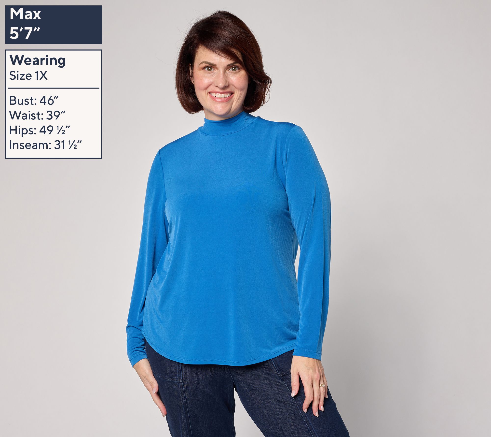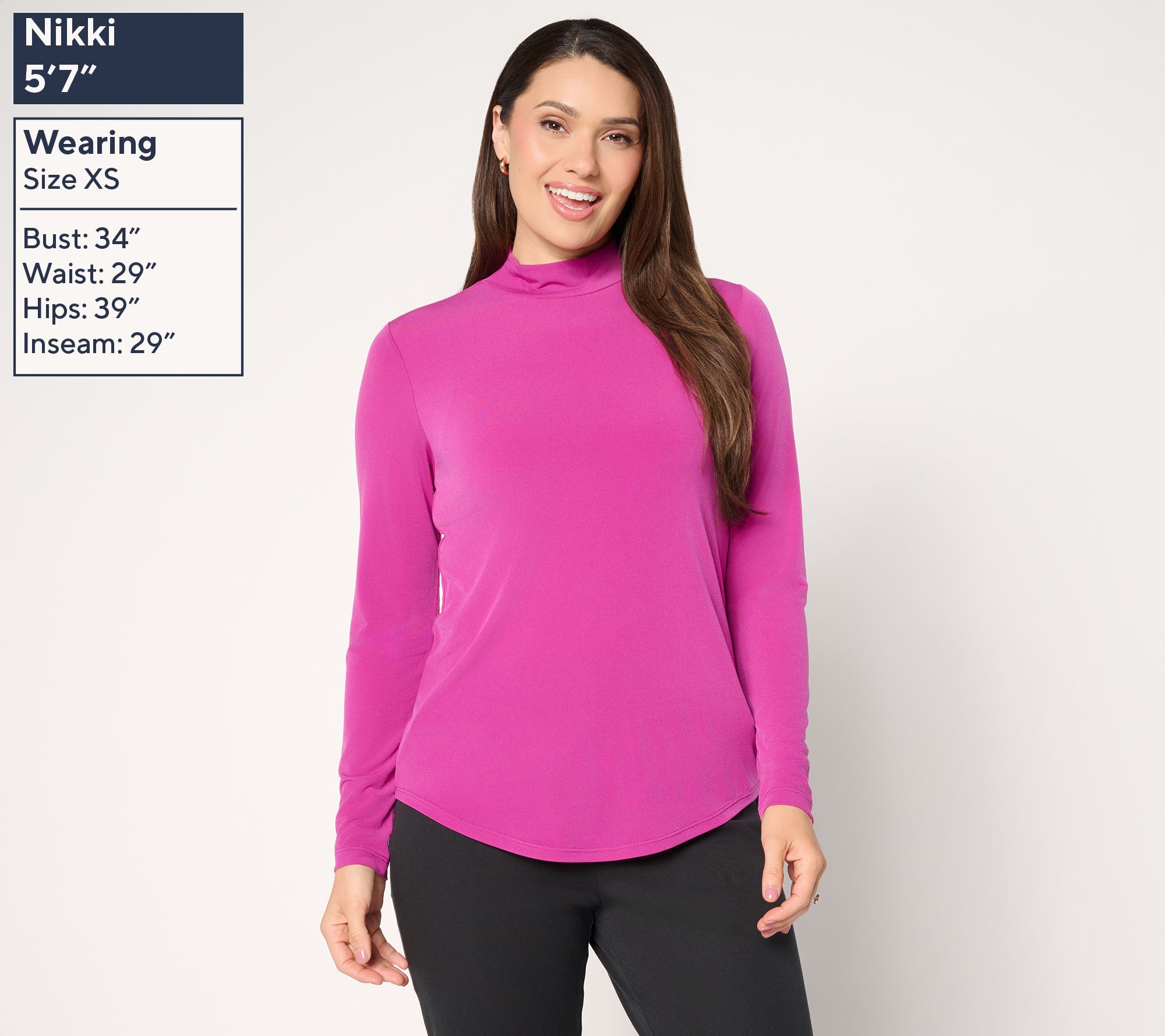 An effortless essential for every season, this mock neck top features soft Liquid Knit® comfort and a fluid drape that pairs seamlessly with jeans or skirts for workdays and weekends. The fitted silhouette highlights your shape, while long sleeves and a curved shirt tail hem offer a flattering finish for layering or solo wear. From Susan Graver.