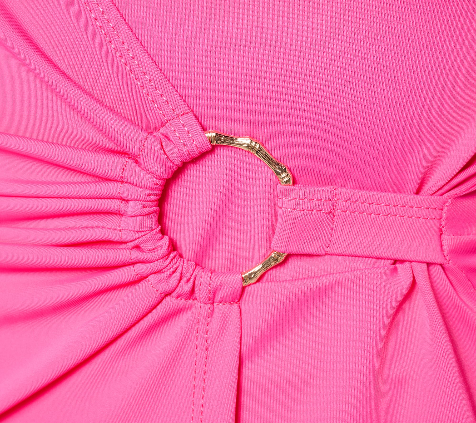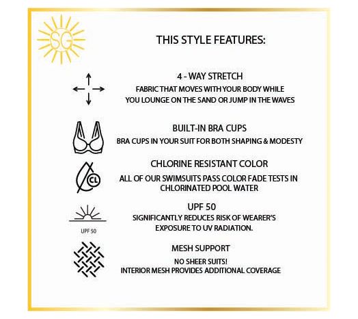 • Features: one-piece halter style, draped surplice crossover front, heart-shaped neckline, back loop-and-hook closure, O-ring front detail, slight skirt shirring, brief attached at waist seam