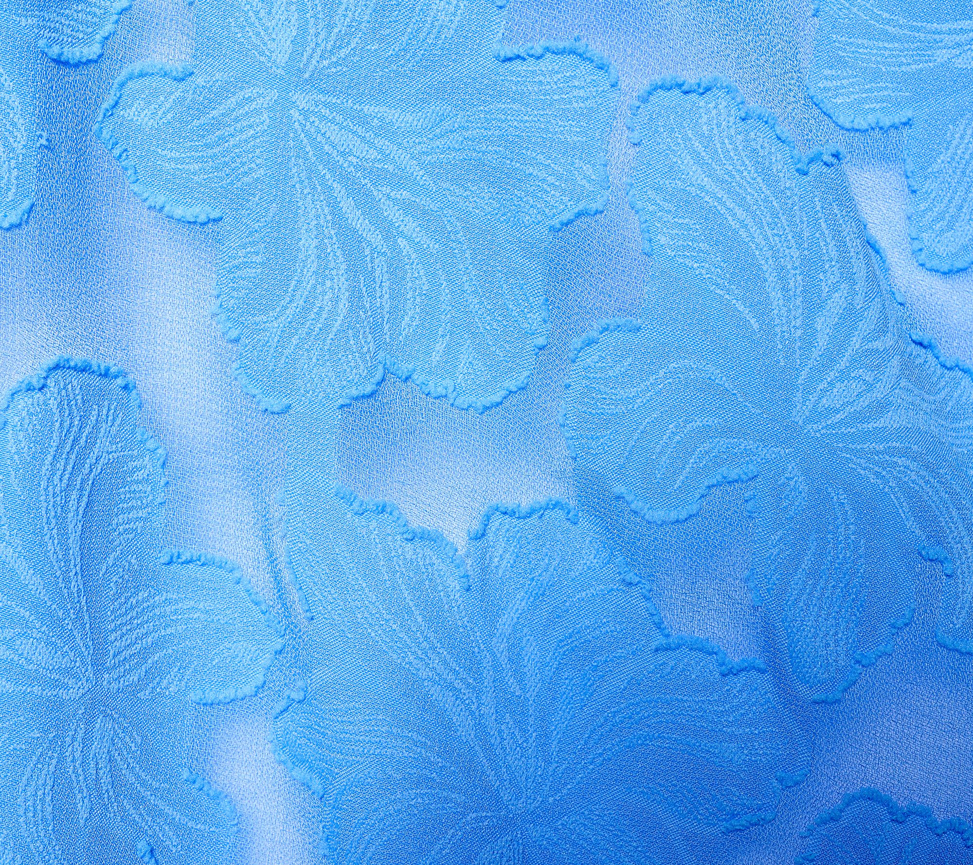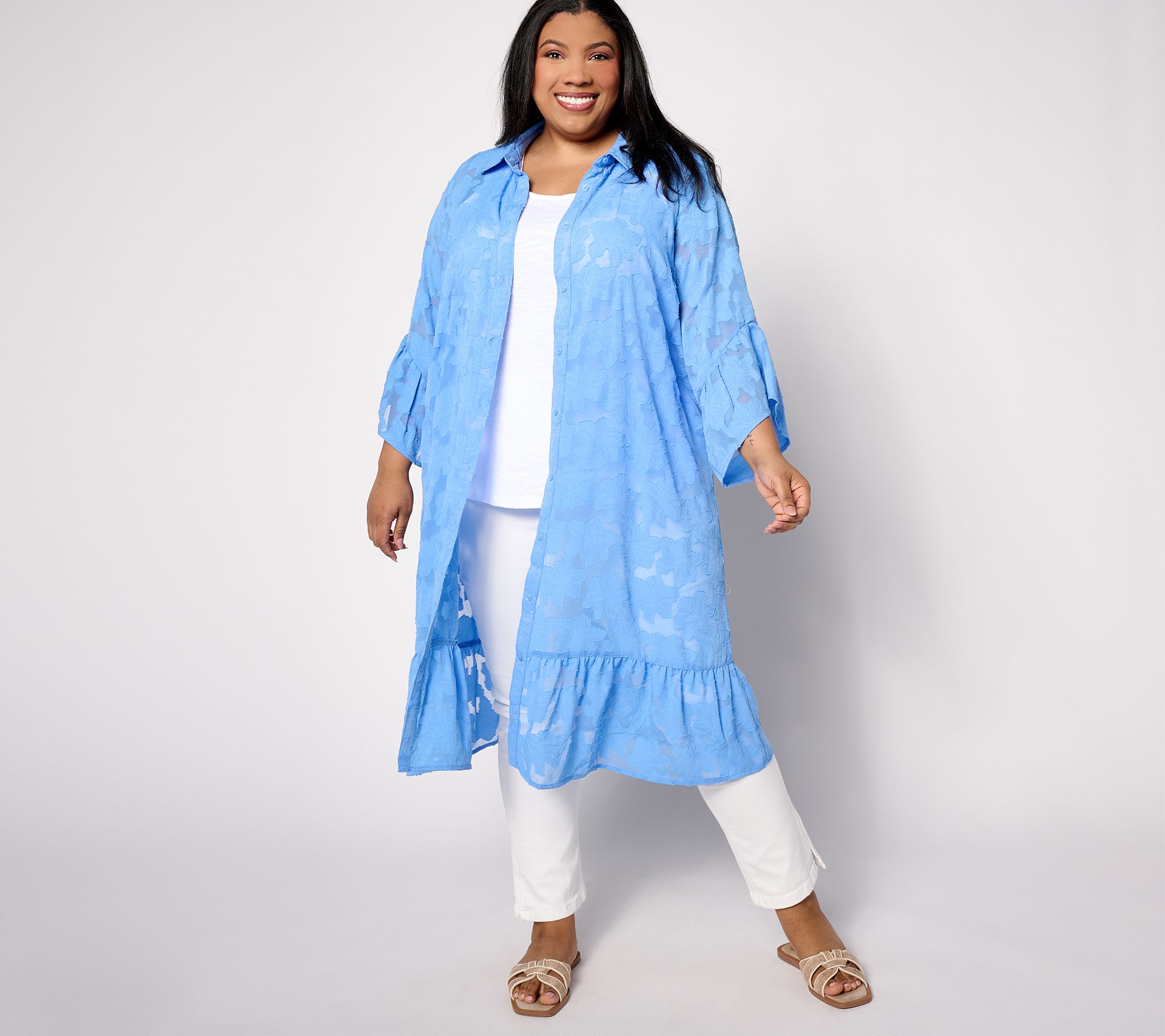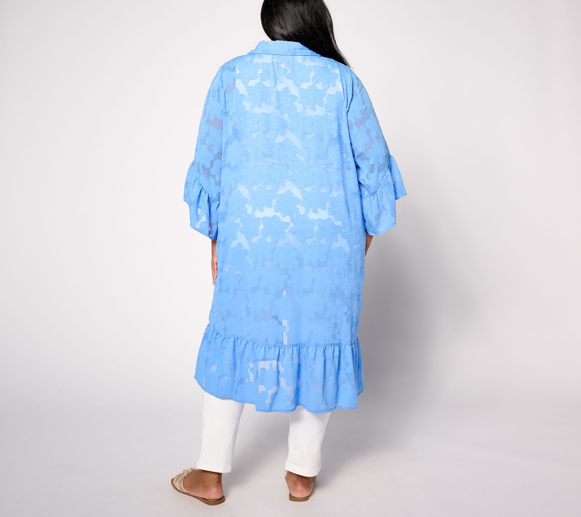 • Features: cover-up style, burnout floral pattern, collar neckline, button-front closure, elbow-length sleeves, shirred flounce hem and angled cuffs