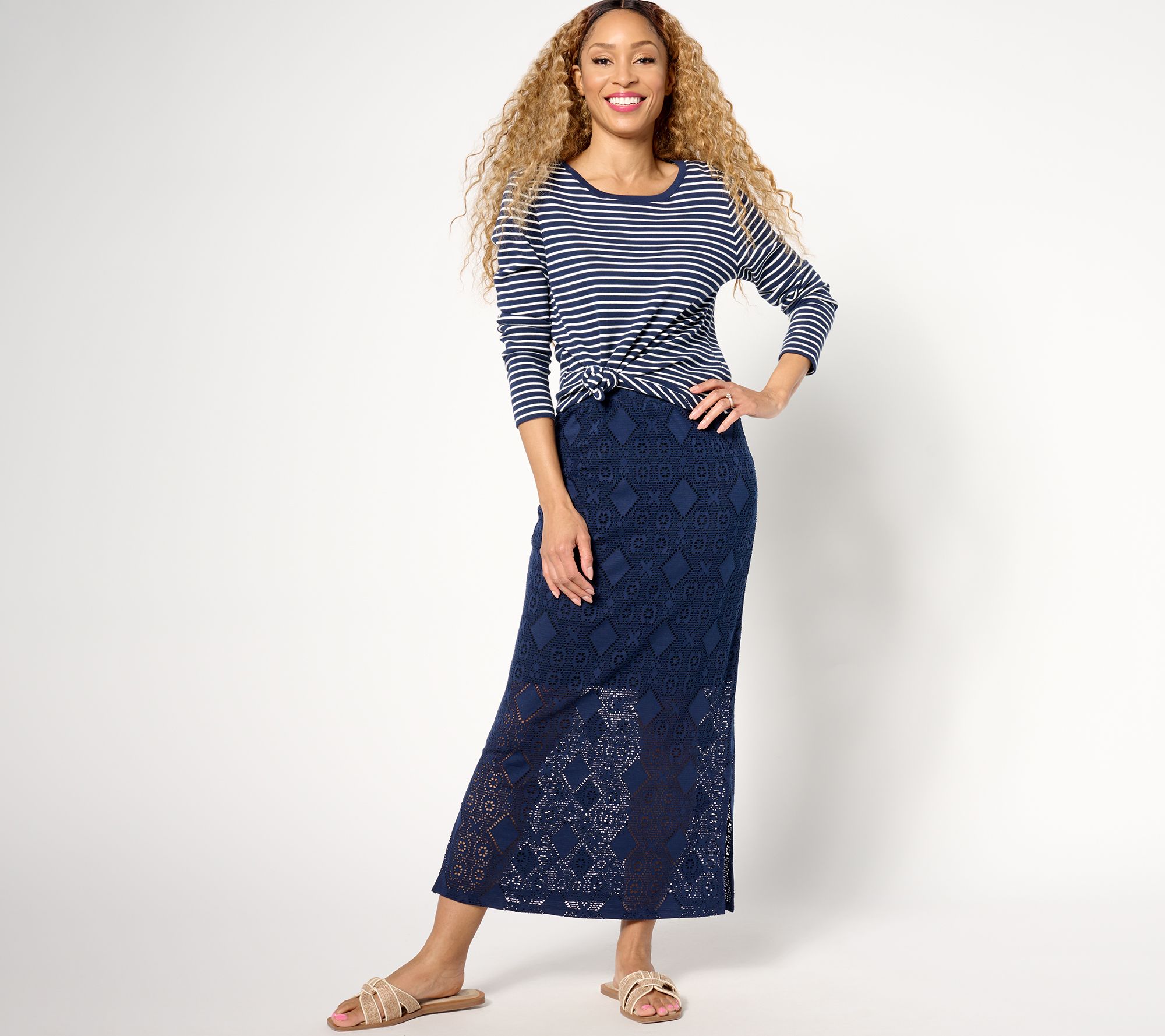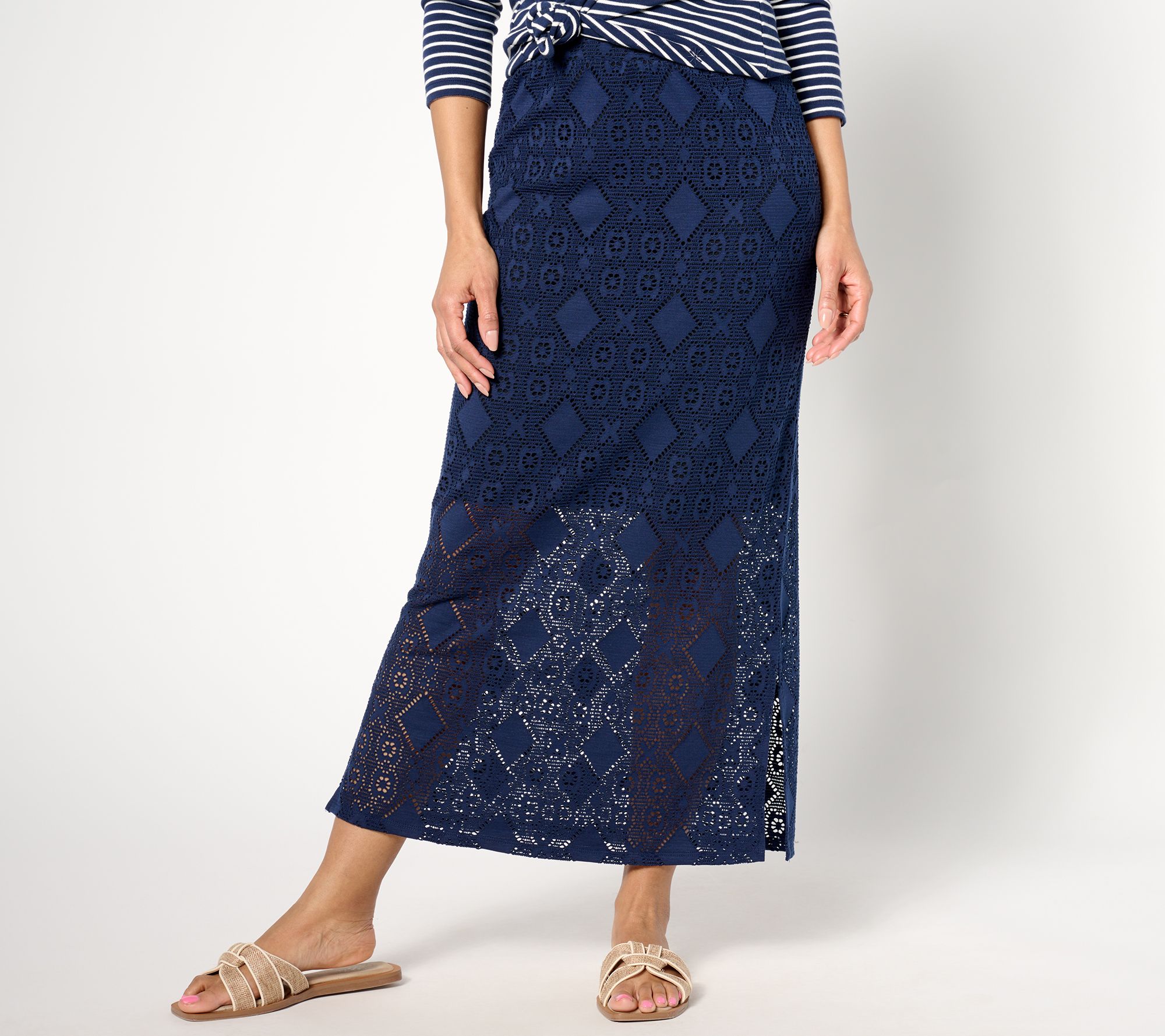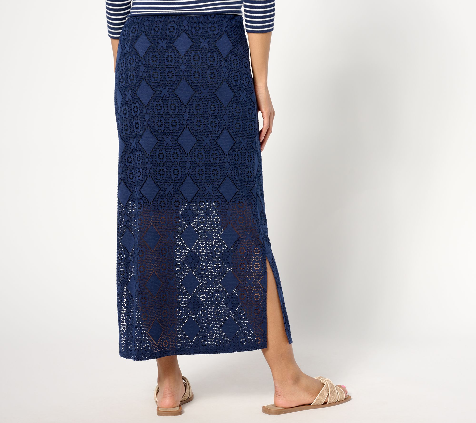 The perfect summer staple, this crochet knit skirt pairs beautifully with a tank and strappy sandals. From Susan Graver.