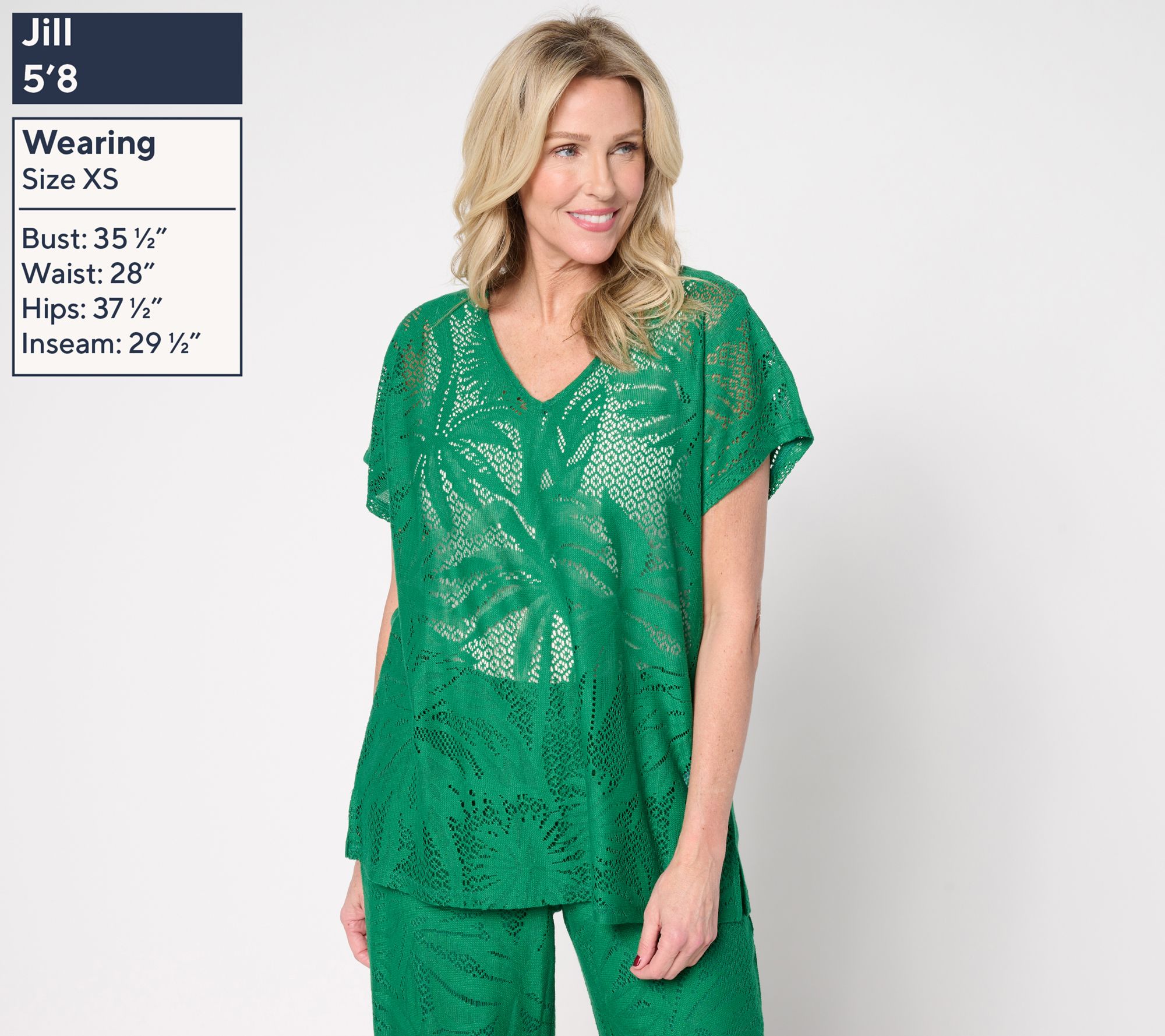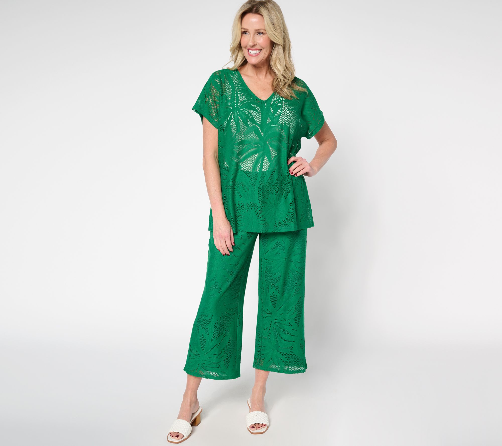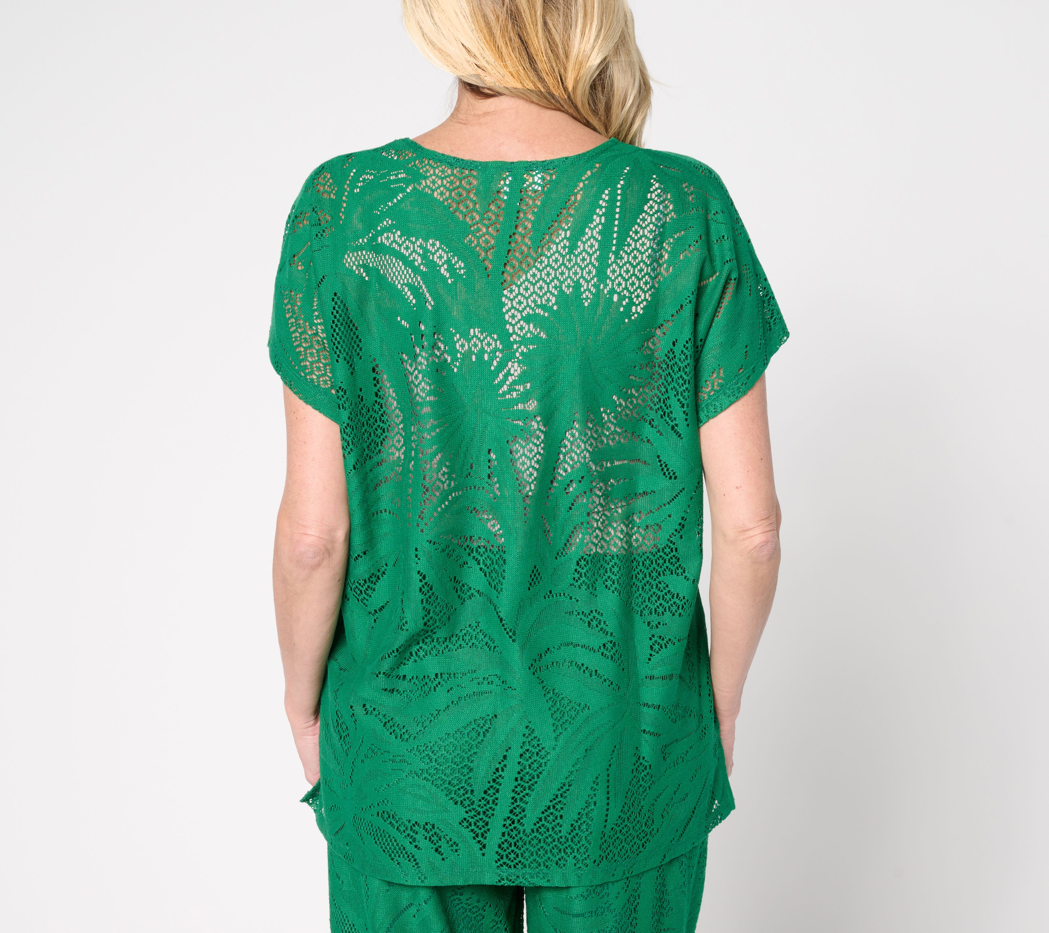 Pop on this lace knit tunic and you're on island time! It's breezy, open-air style layers beautifully over your own cami or tank, instantly dressing up denim capris or white crops. For evenings, pair it with silky wide-leg pants for a head-turning look. (Umbrella drink, anyone?) From Susan Graver.