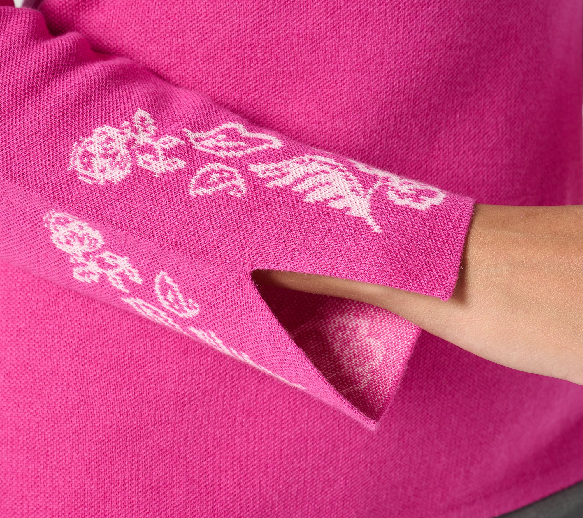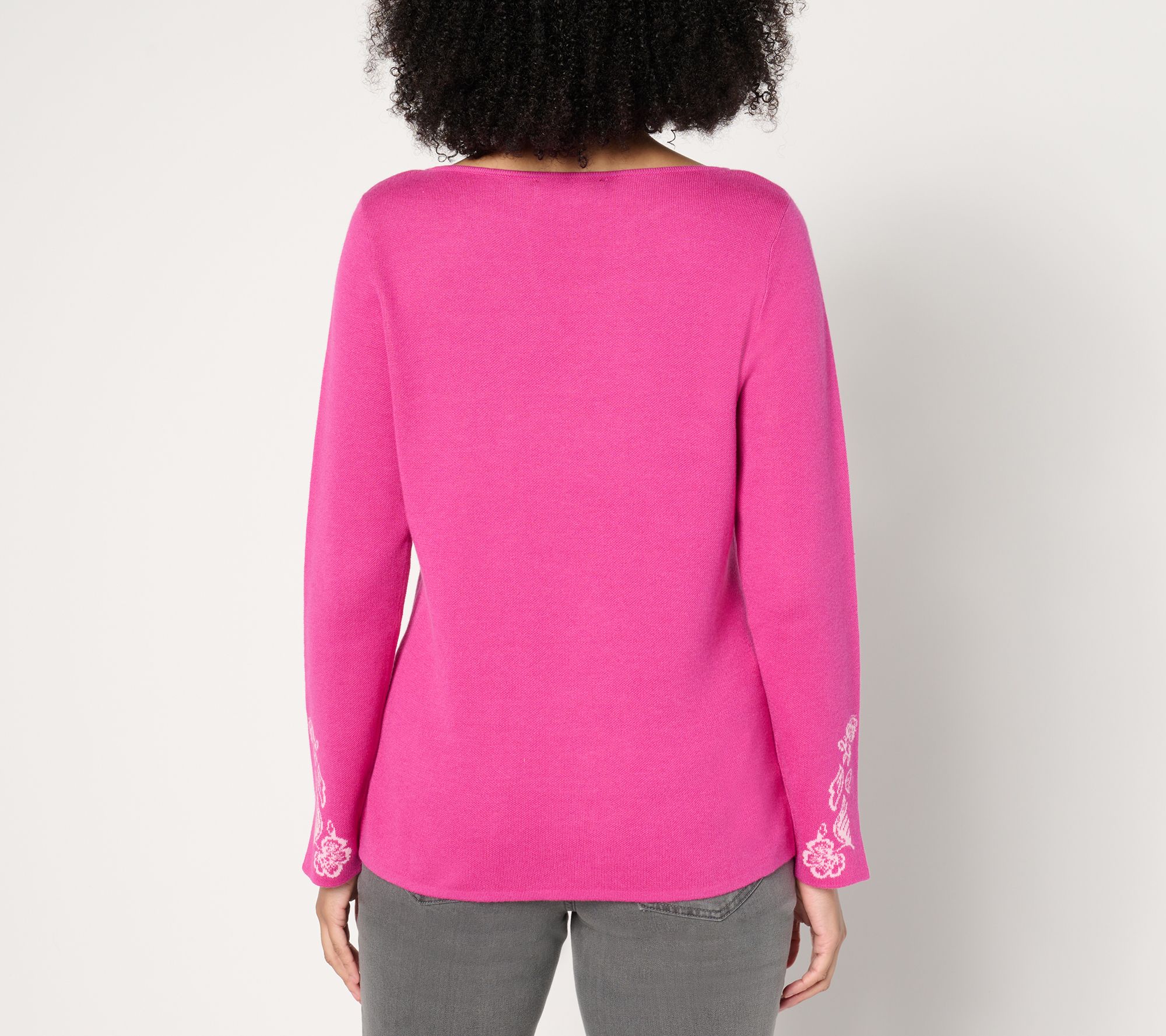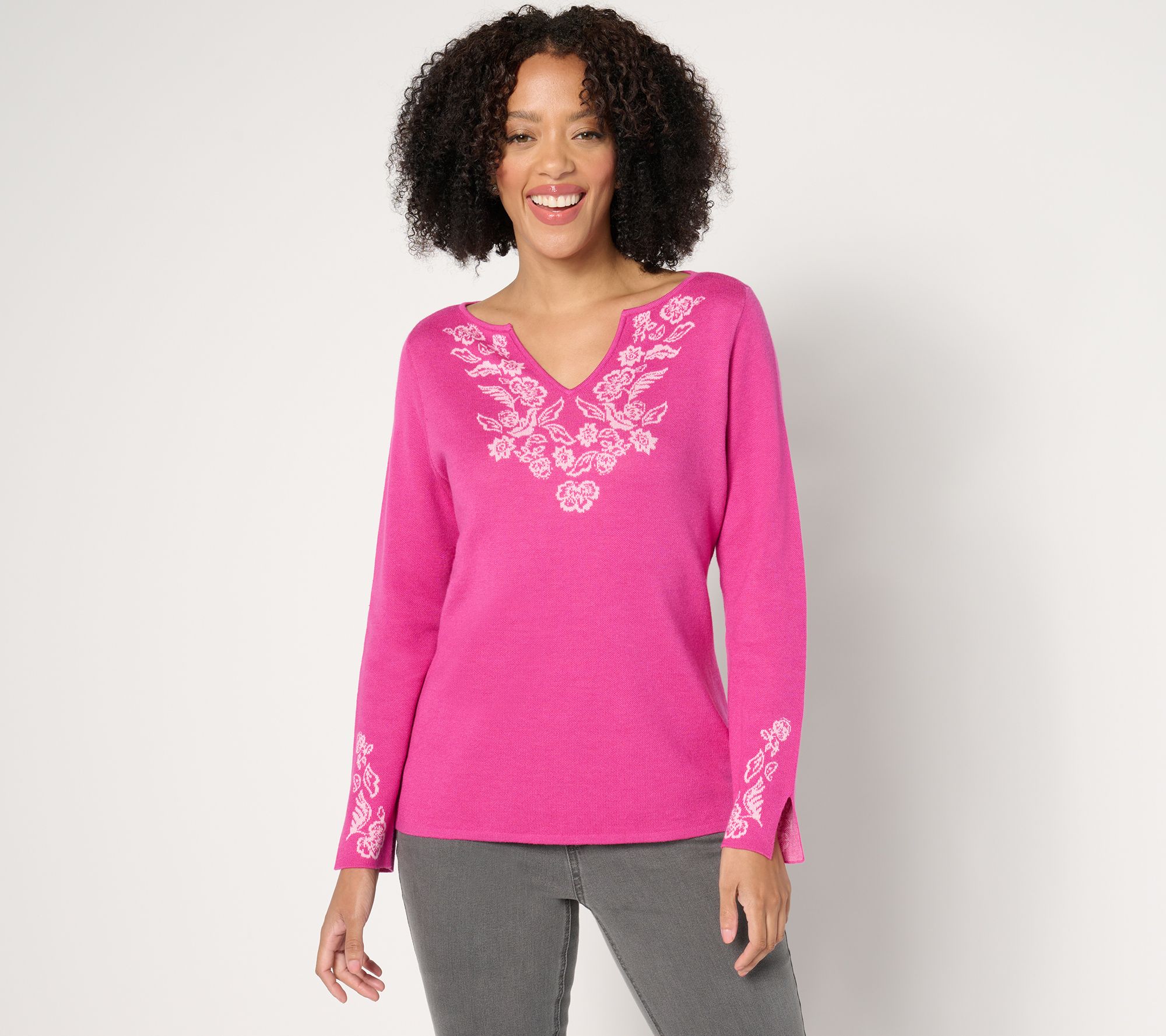 From lunch dates to weekend trips, sweater weather is even sweeter in this jacquard-detailed design with accommodating split sleeves and an open neckline. From Susan Graver.