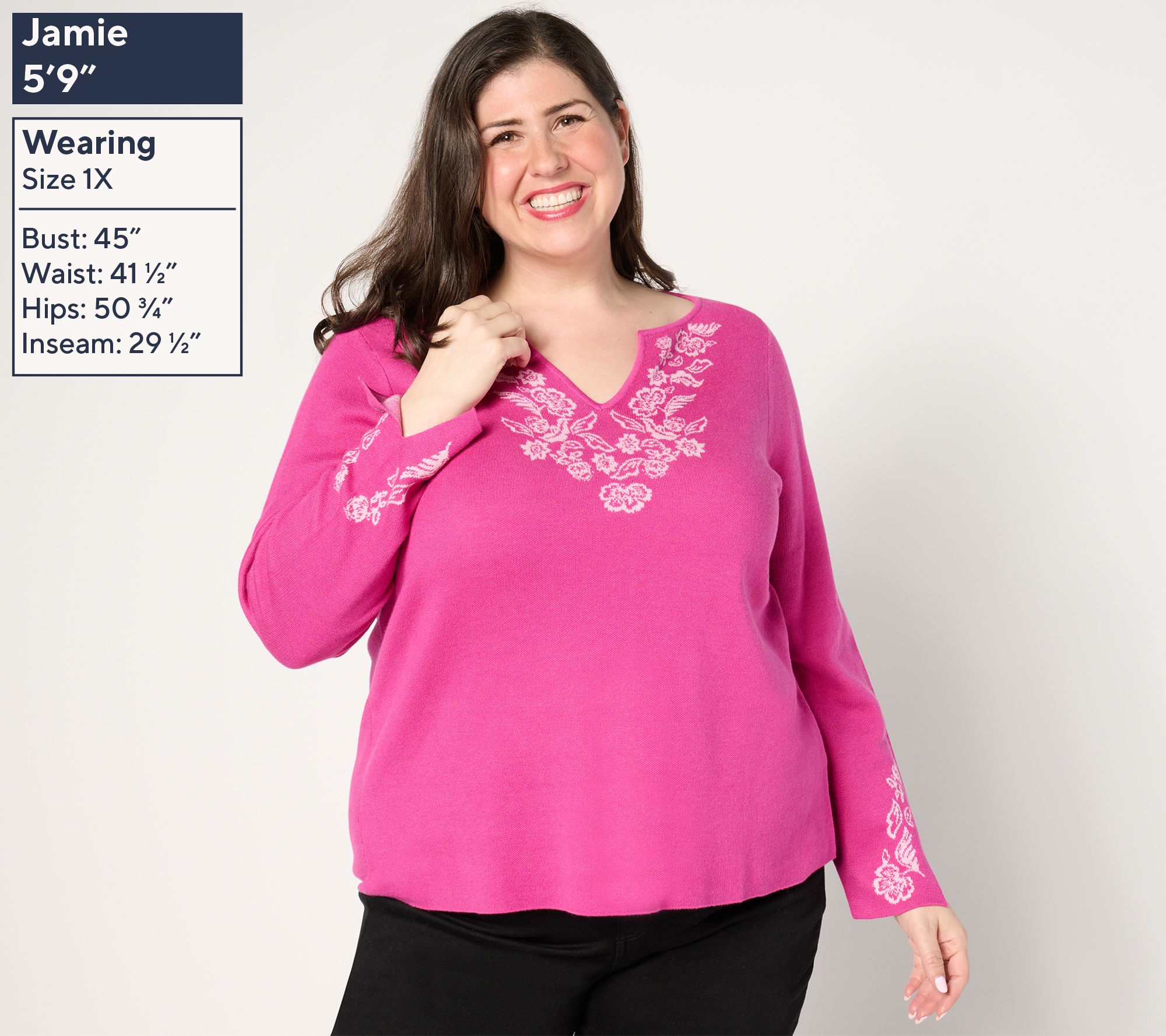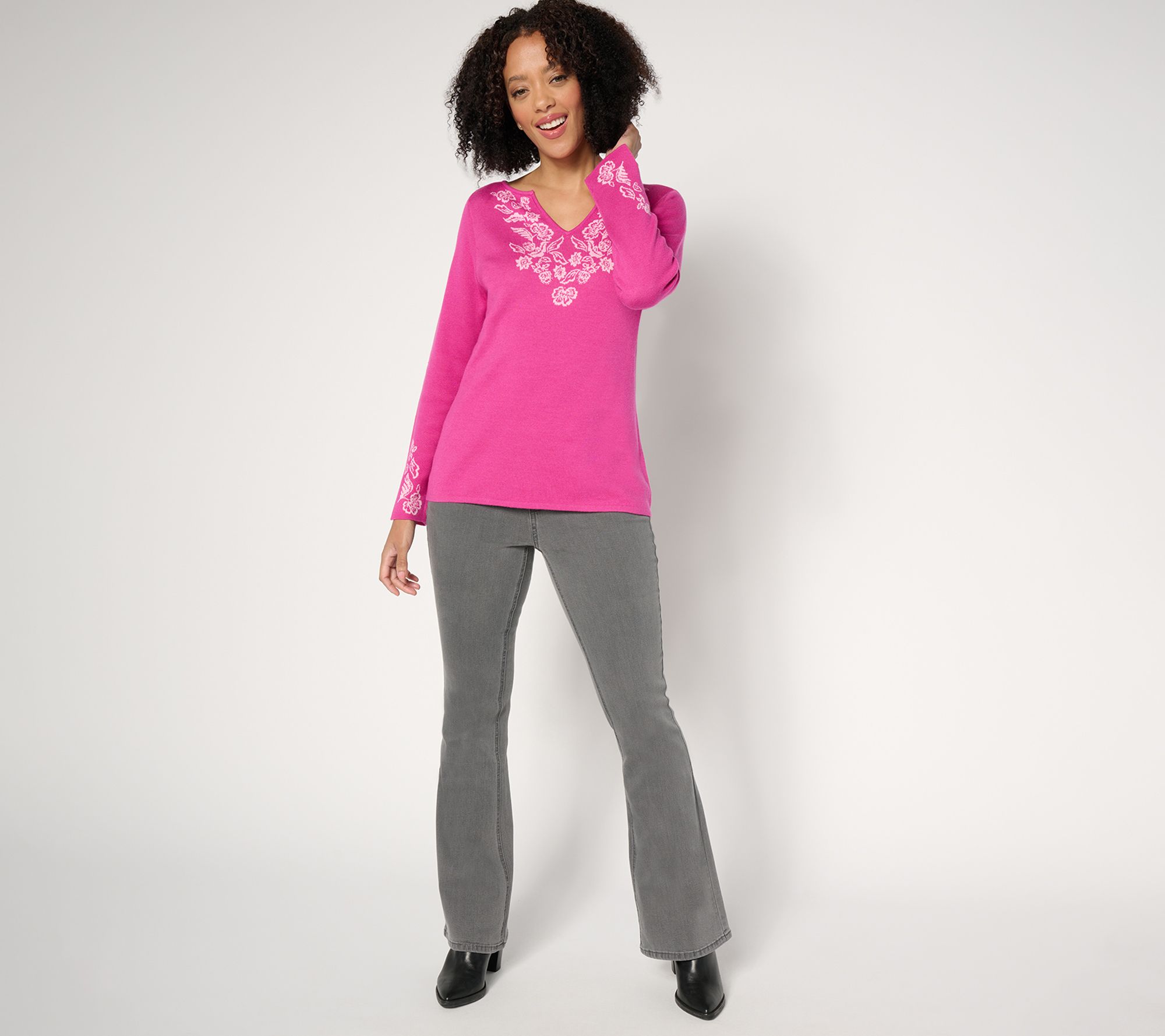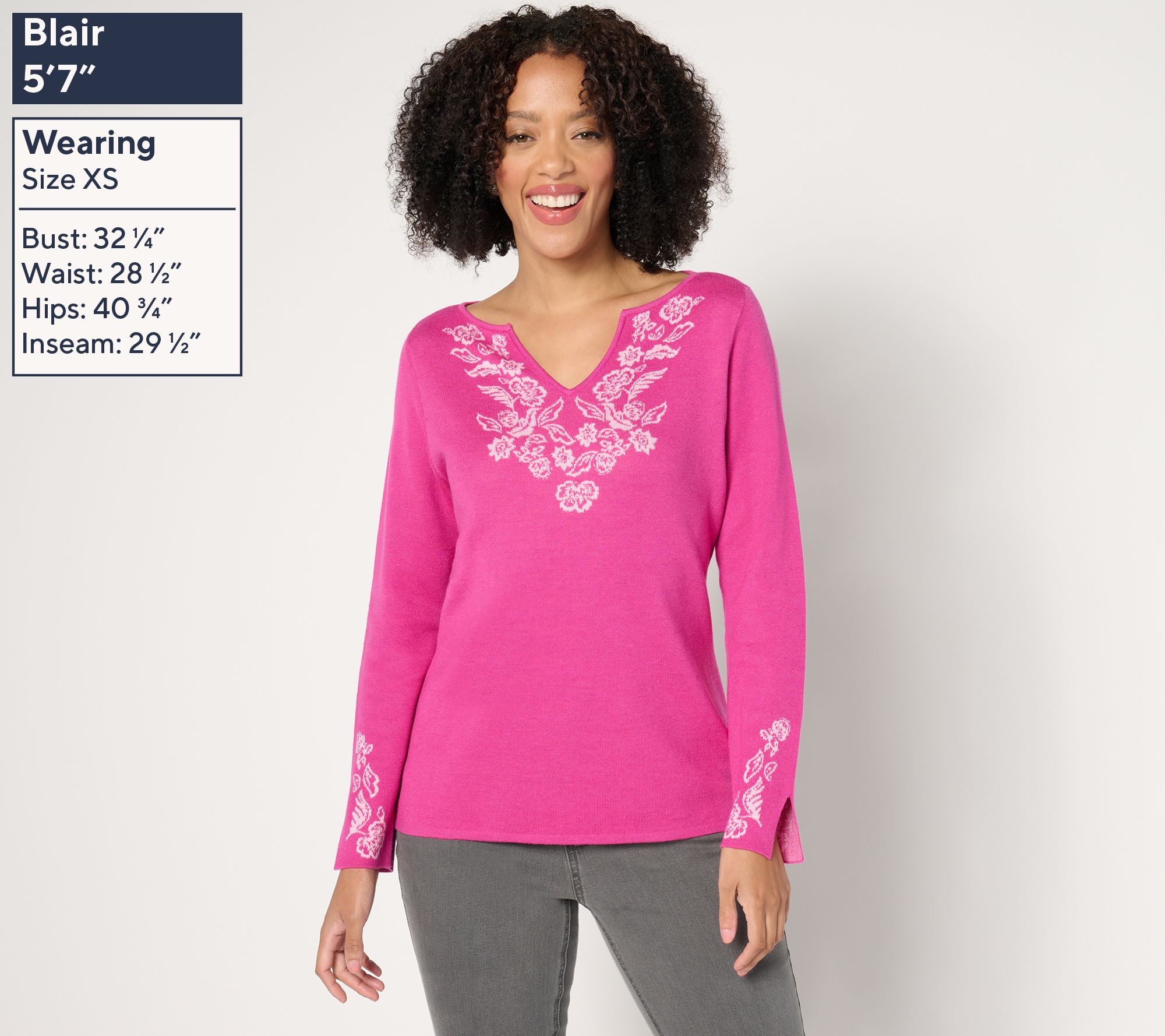 From lunch dates to weekend trips, sweater weather is even sweeter in this jacquard-detailed design with accommodating split sleeves and an open neckline. From Susan Graver.