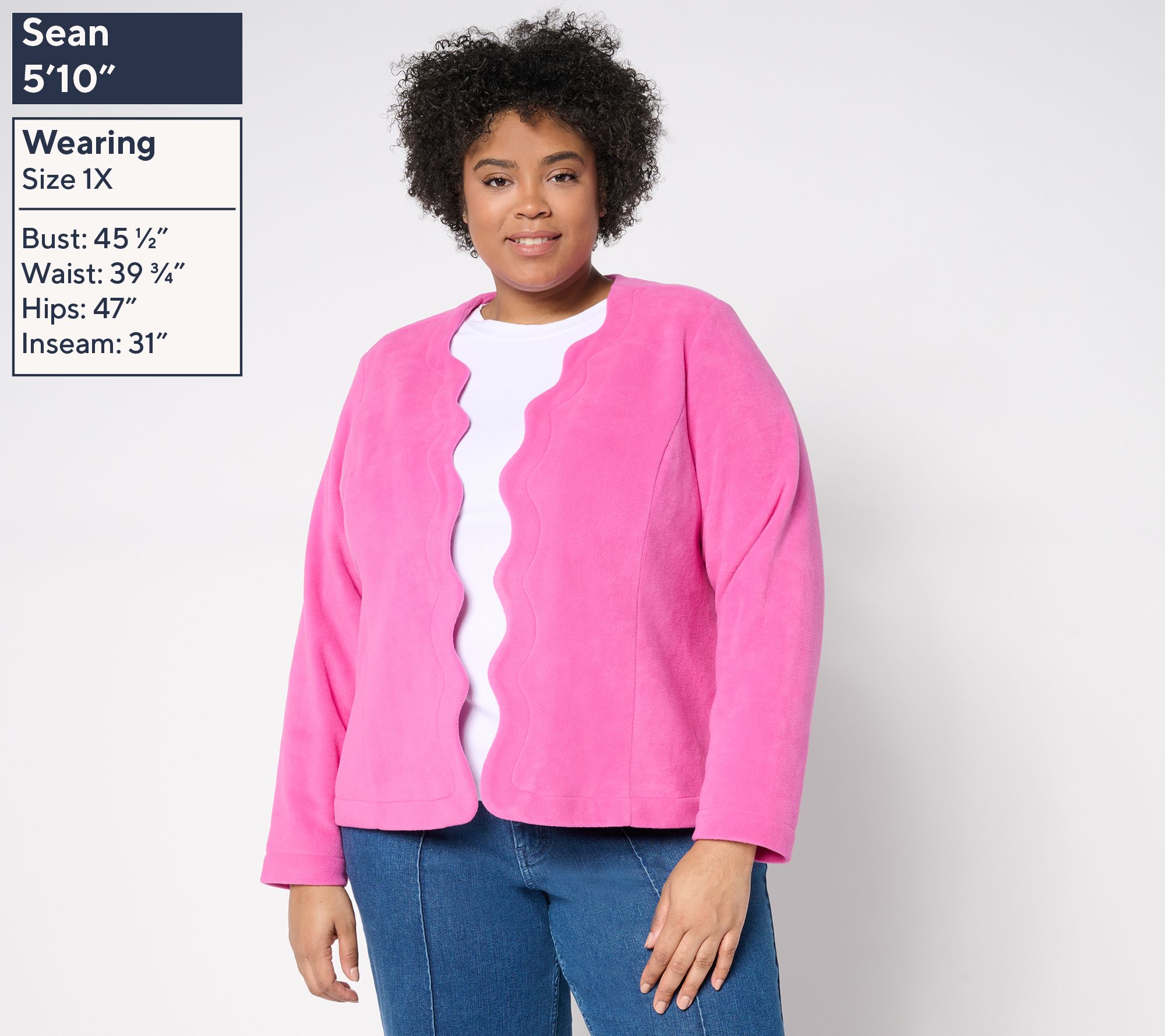 Make a stylish statement this spring with this fleece jacket by Susan Graver. Boasting scalloped edges and printed lining, this versatile piece transitions effortlessly from casual outings to more polished affairs. Layer it over your favorite outfits for a cozy yet chic look. From Susan Graver.