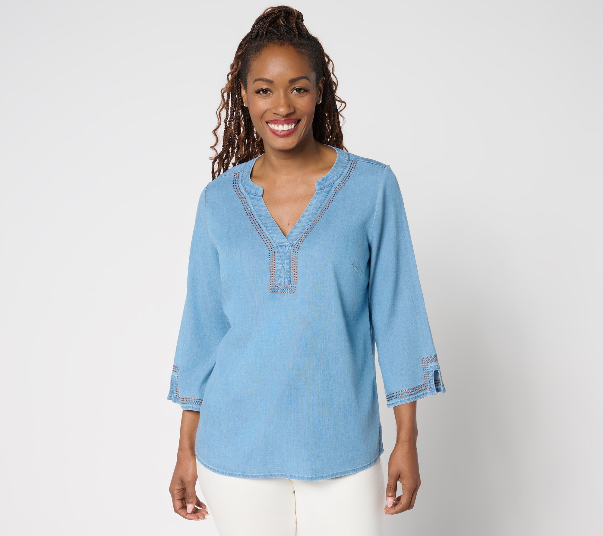 Catch all the compliments with this chambray top that puts easy-going polish front and center. Soft stretch fabric, tailored bust darts, and thoughtful stitching details make it an effortless choice for relaxed workdays, weekend errands, or dinner out. The three-quarter sleeves, side slits, and pull-on design deliver laid-back comfort with that extra-chic edge. From Susan Graver.