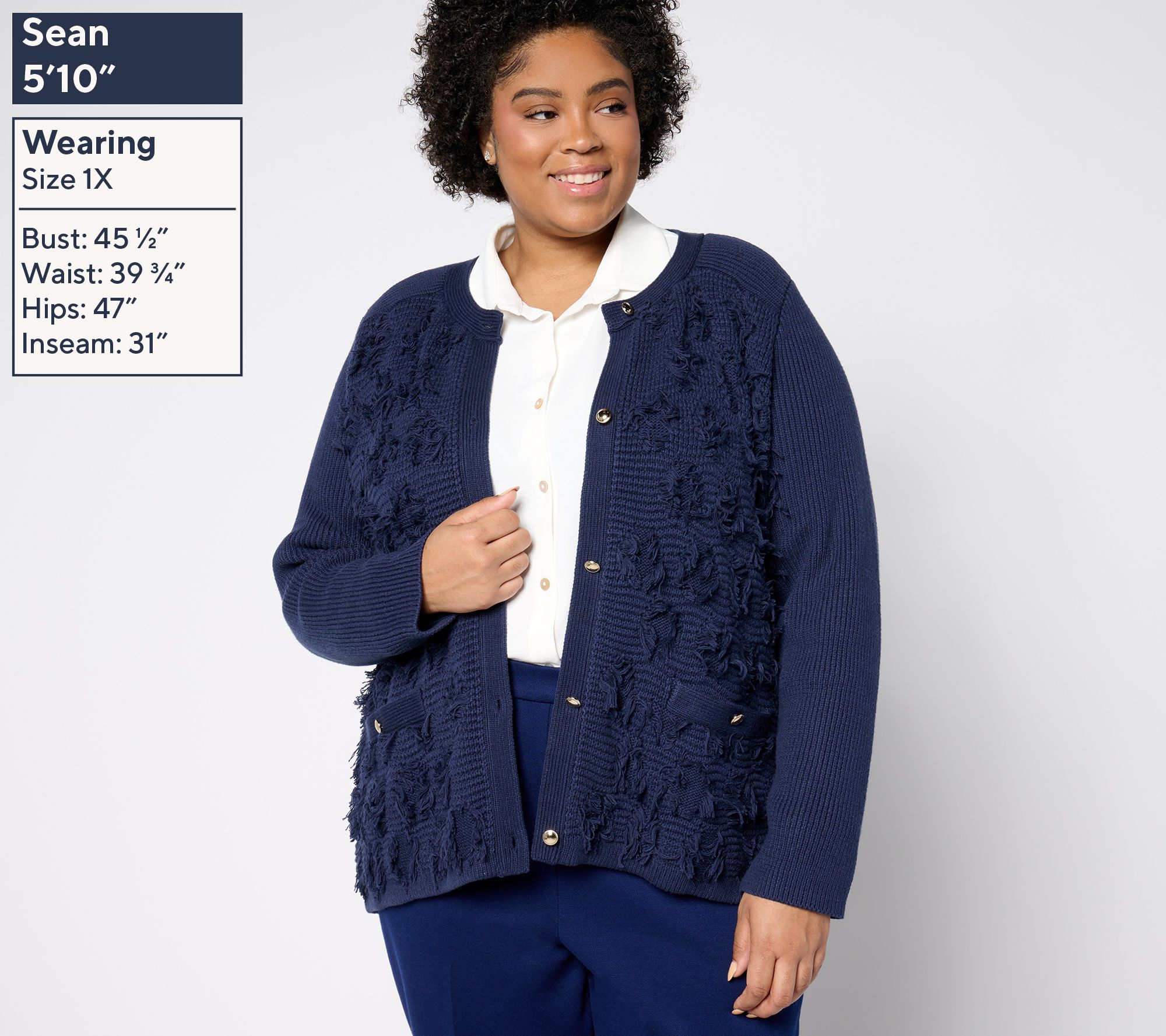 A little chill won't stop you from looking fabulous with this textured fringe cardigan in your wardrobe rotation. Throw it on over a favorite blouse, tank, or tee. From Susan Graver.